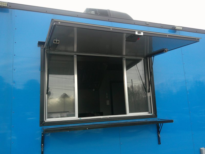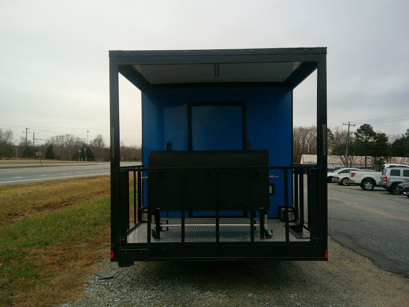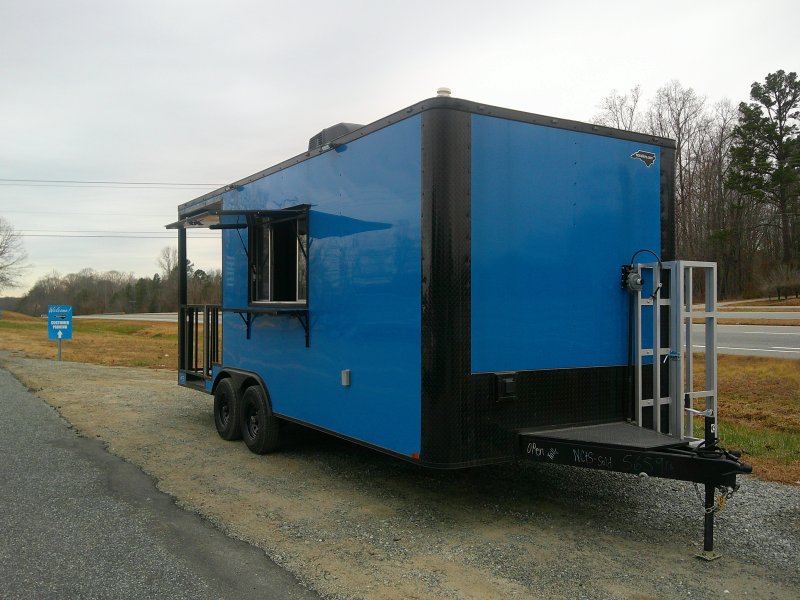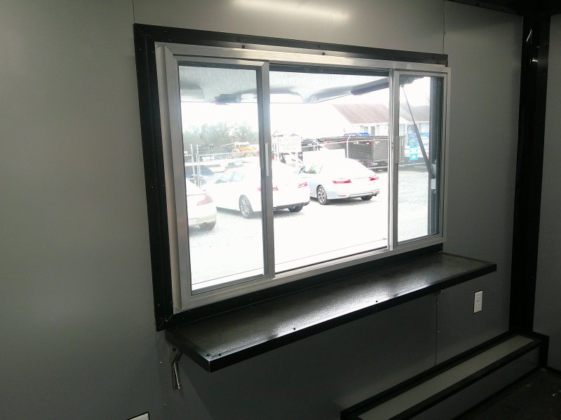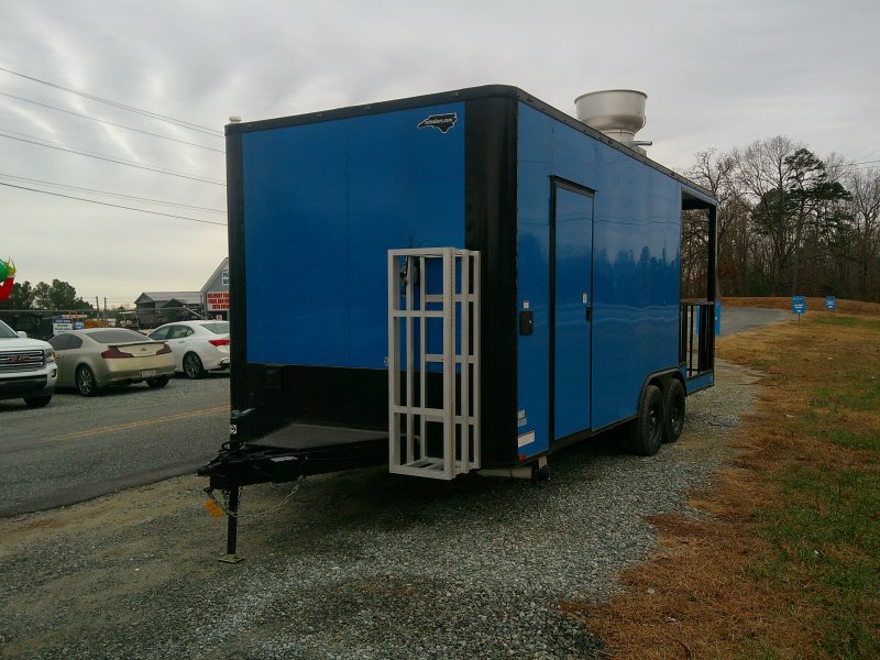 This v-nose 8.5x20 enclosed cargo trailer has a 7' interior height, tandem axles with brakes with a rating of 7,000 lb GVWR. This model has a side door, a rear porch, 3x8 concession window, is braced and wired for A/C, 50 amp electrical package, 50 amp motor base plug, MC cable, and a 2000 lb jack.