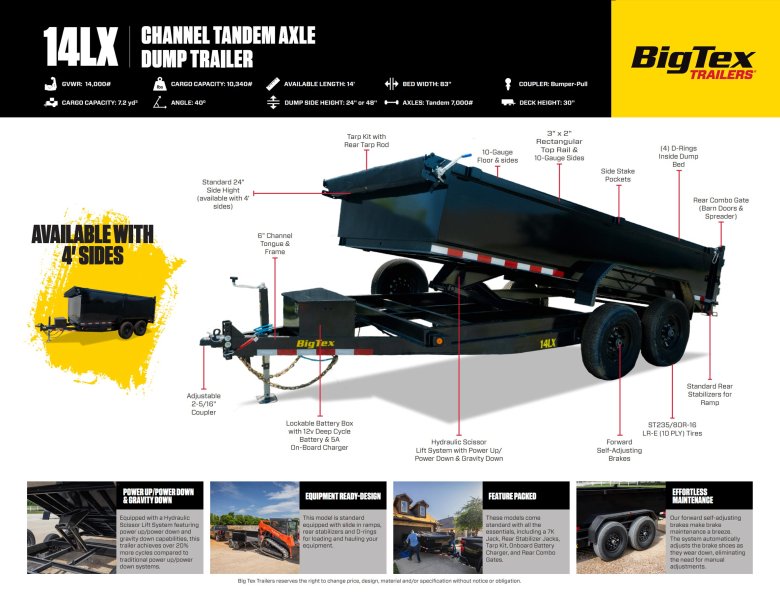 The Big Tex 14LX Dump is a no frills trailer—meaning you don’t have to pay for features and optional equipment that you may not need for the work you do. Engineered to perform in the toughest environments, the 14LX is a durable trailer with the strength and versatility to transport and dump a huge variety of loads.
