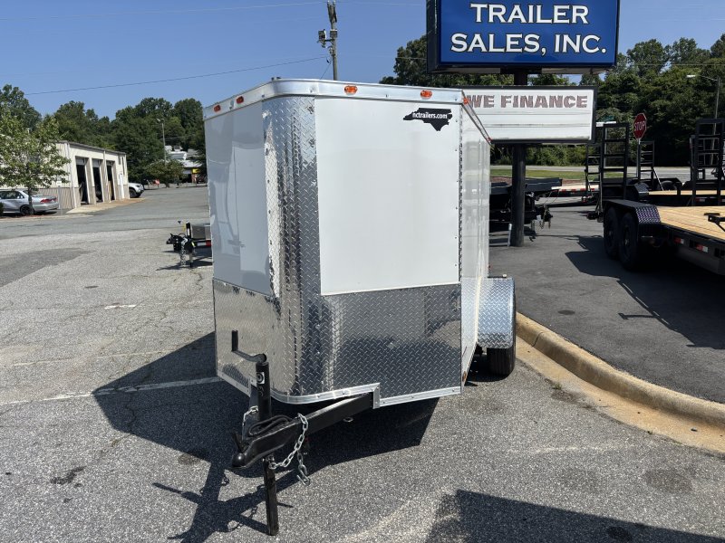 This v-nose 5x8 enclosed cargo trailer has a single non-braking idler axle with a rating of 2,990 lb GVWR. This type of trailer is ideal for light-duty or residential tasks. This model has no side door, a rear swing door, and a 2000 lb jack.