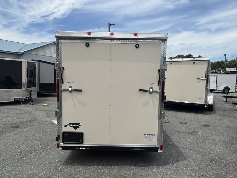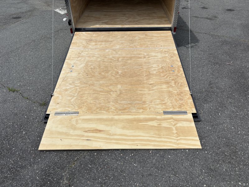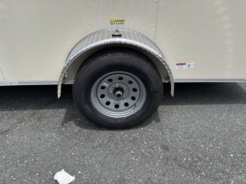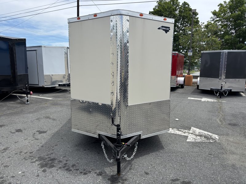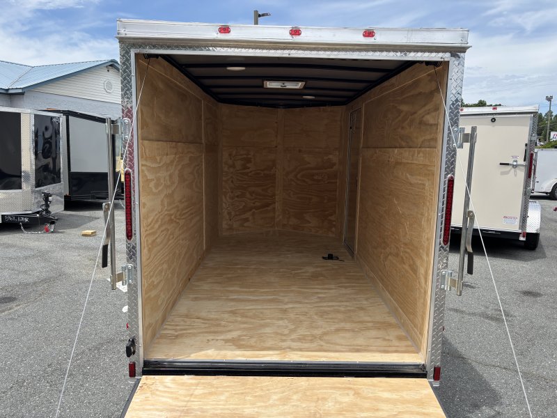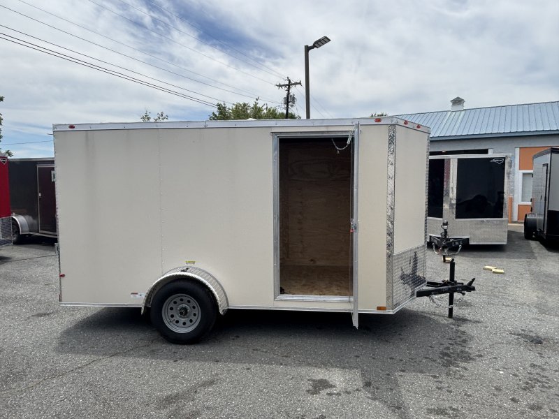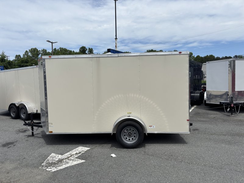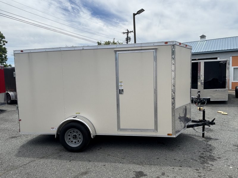This v-nose 6x12 enclosed cargo trailer has a single non-braking idler axle with a rating of 2,990 lb GVWR. This type of trailer is ideal for light-duty or residential tasks. This model has a side door, a rear ramp door, and a 2000 lb jack.