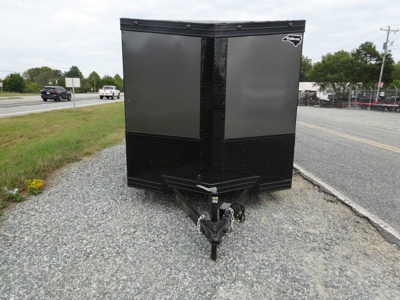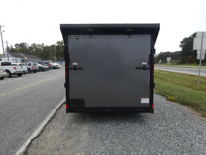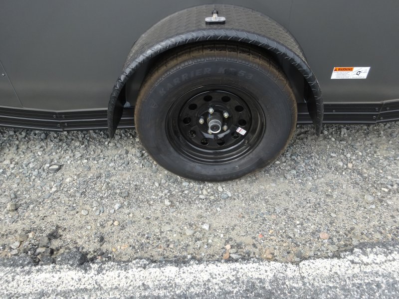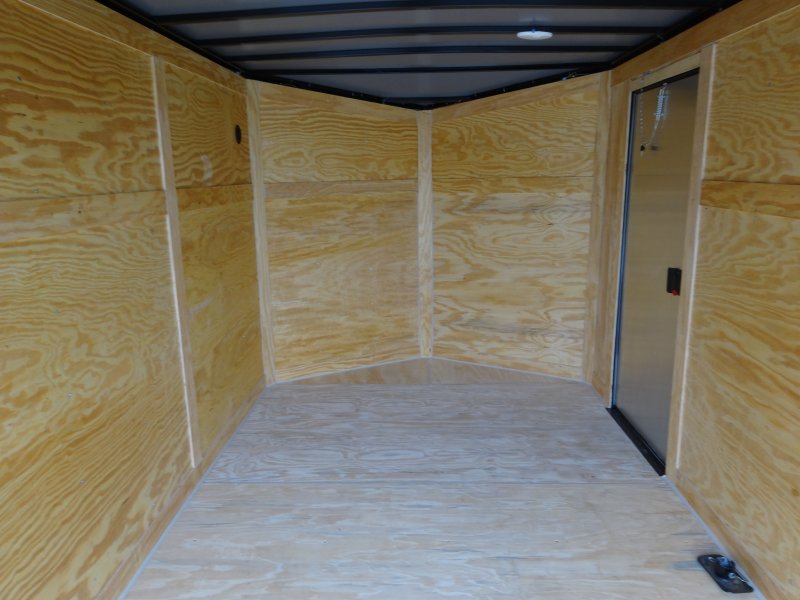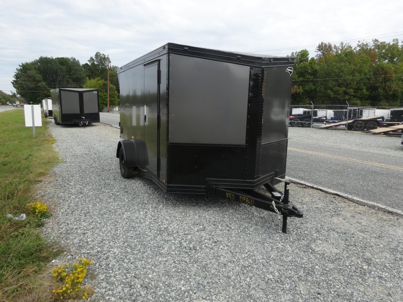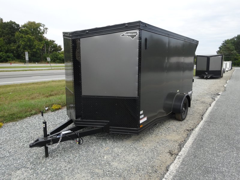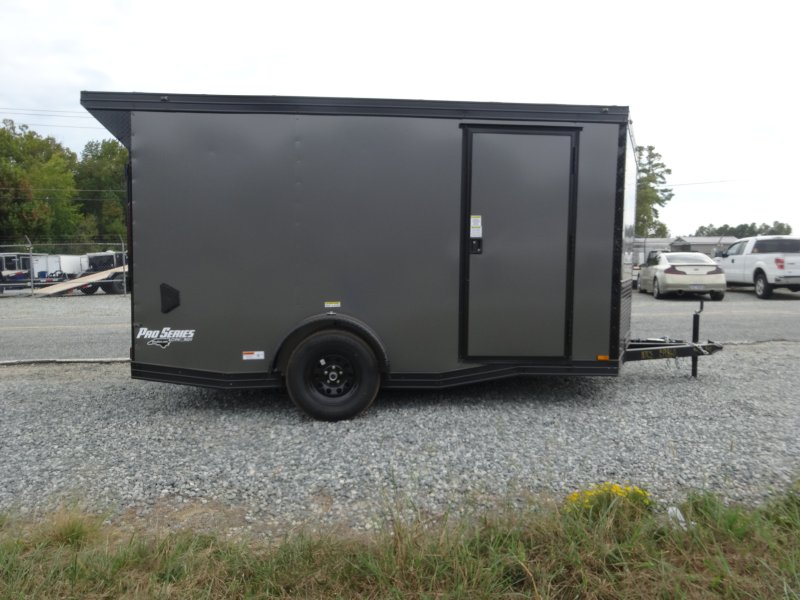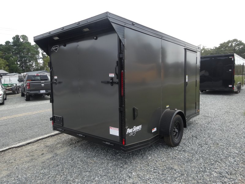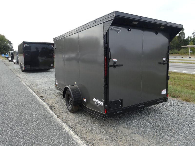 This v-nose 7x12 enclosed cargo trailer has a single braking axle with a rating of 3,500 lb GVWR. This Pro Series model has a 6'3" interior height, rear ramp door, 0.080" polycore sides, a slant v-nose, rear wing with LED lights, and a 2000 lb jack.