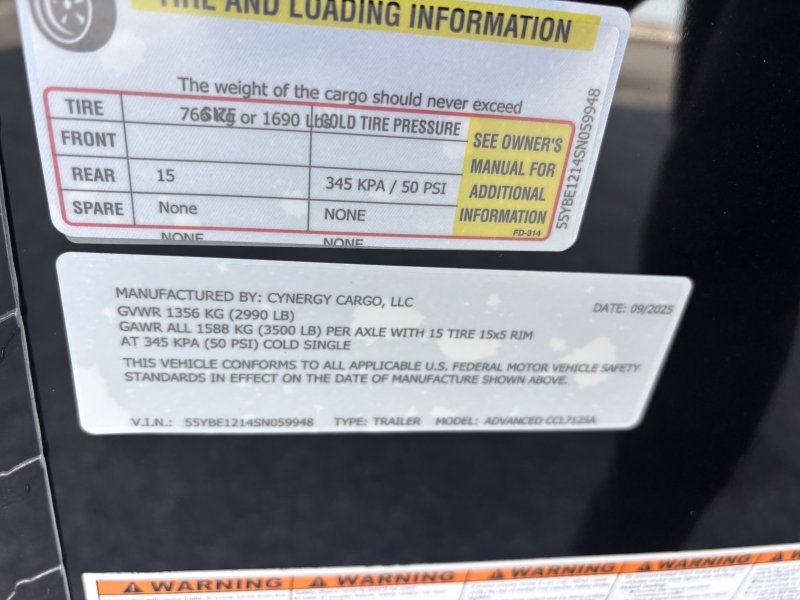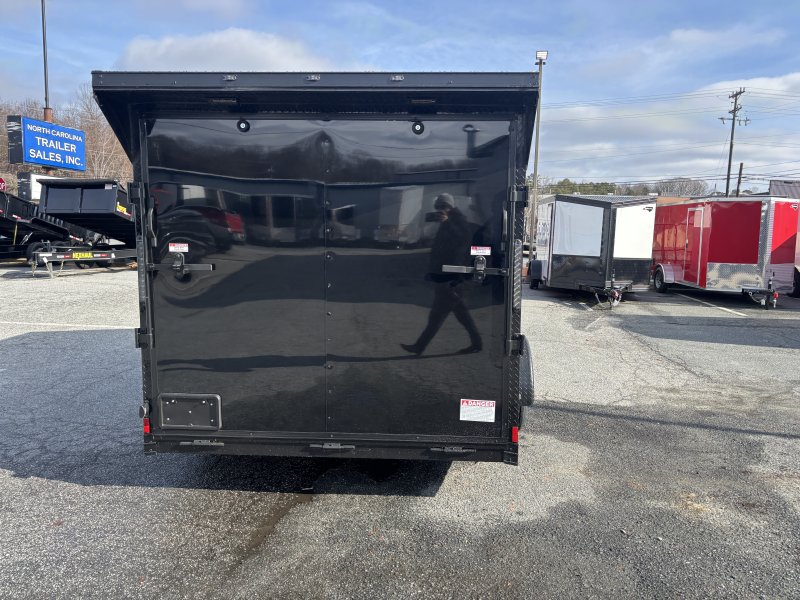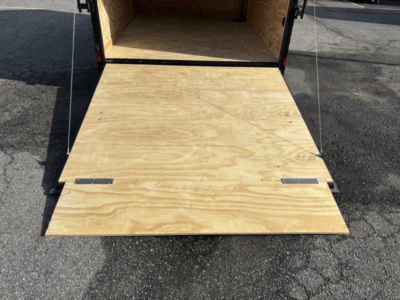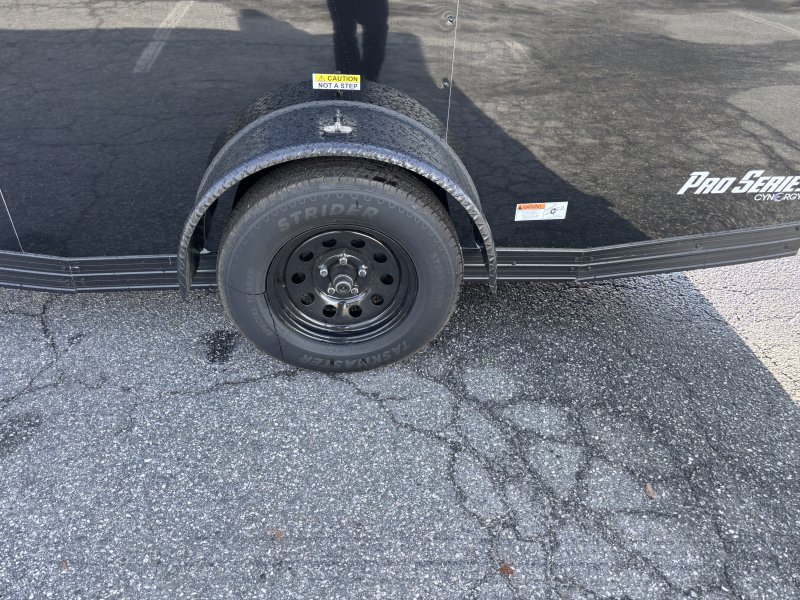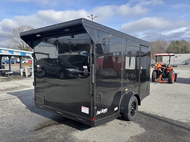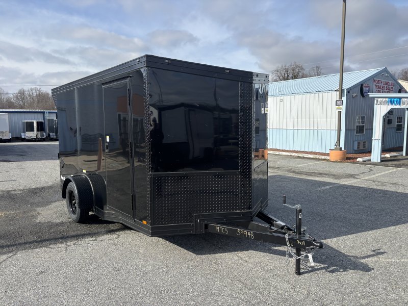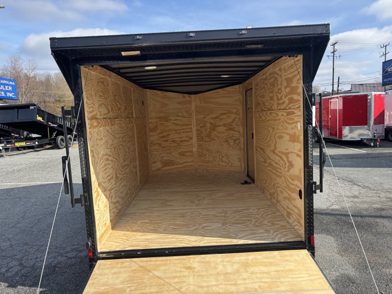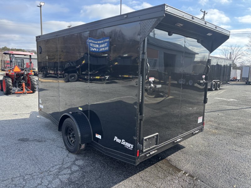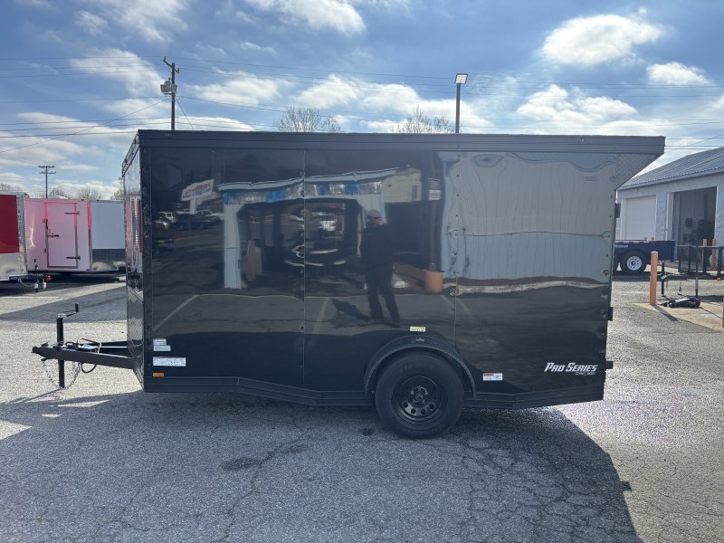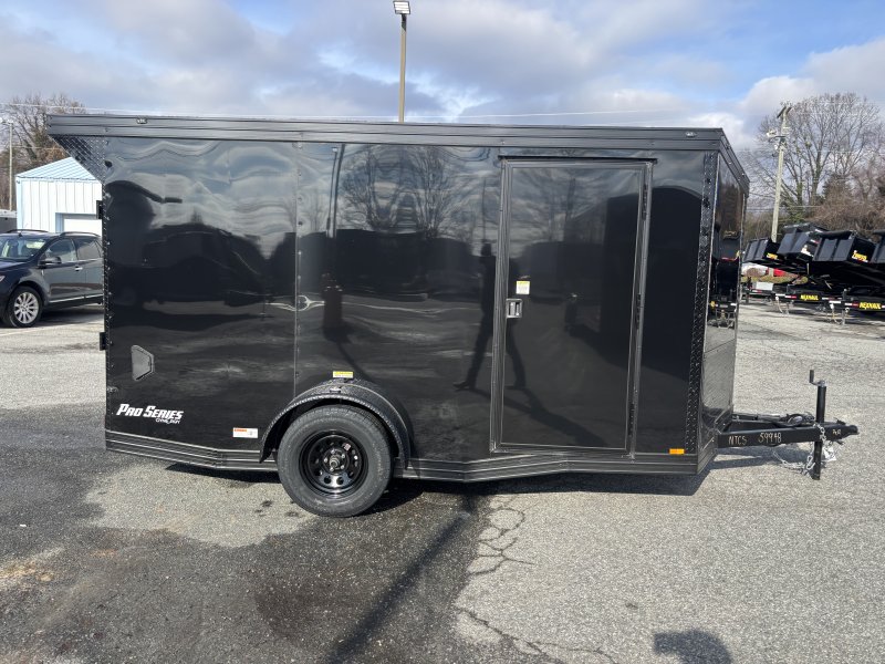 This v-nose 7x12 enclosed cargo trailer has a single braking axle with a rating of 2,990 lb GVWR. This Pro Series model has a 7' interior height, side door, a rear ramp door, 0.080"" polycore sides, a slant v-nose, rear wing, blackout package (black rims, trim, ATP), and a 2000 lb jack.