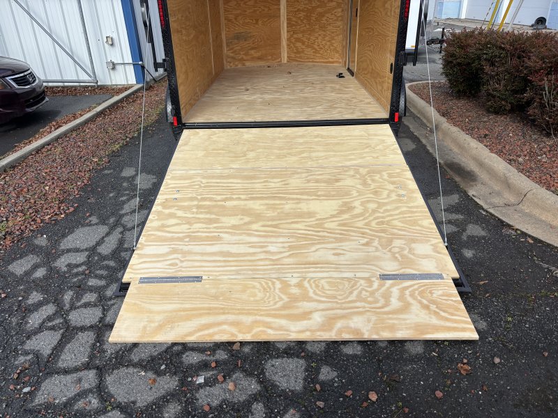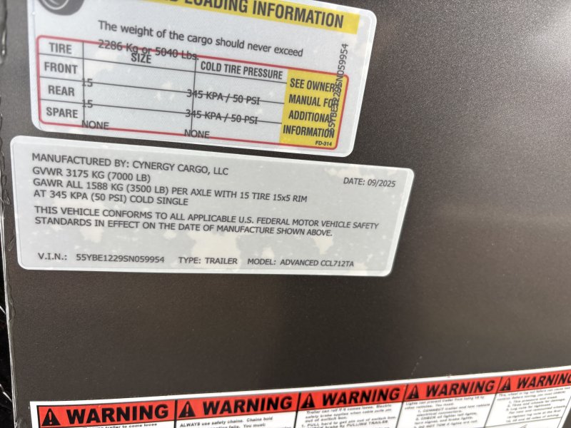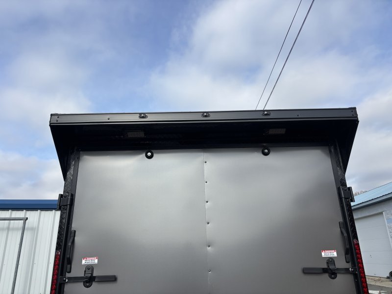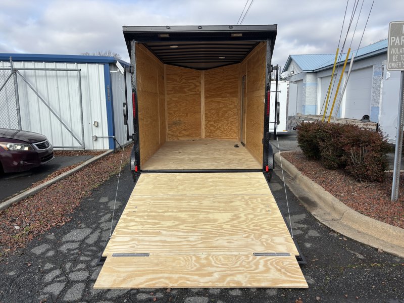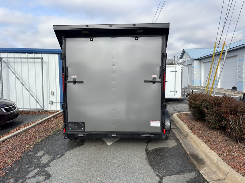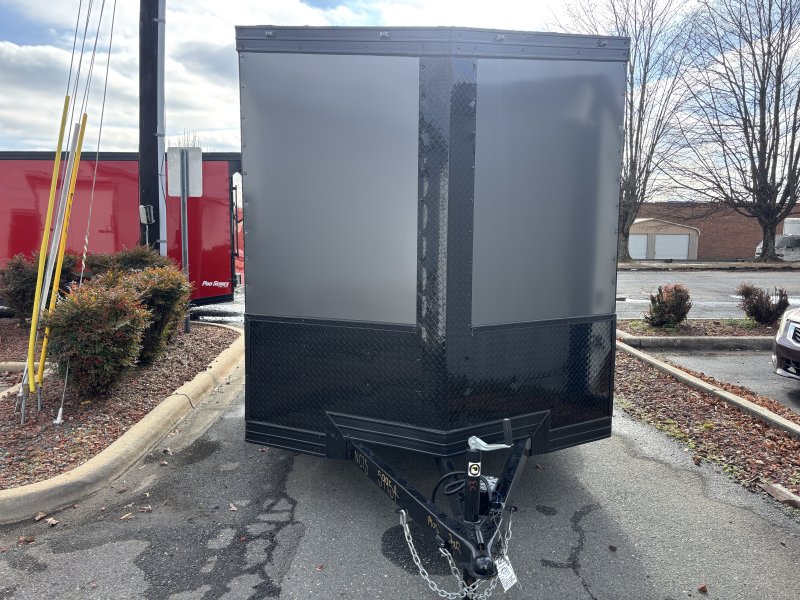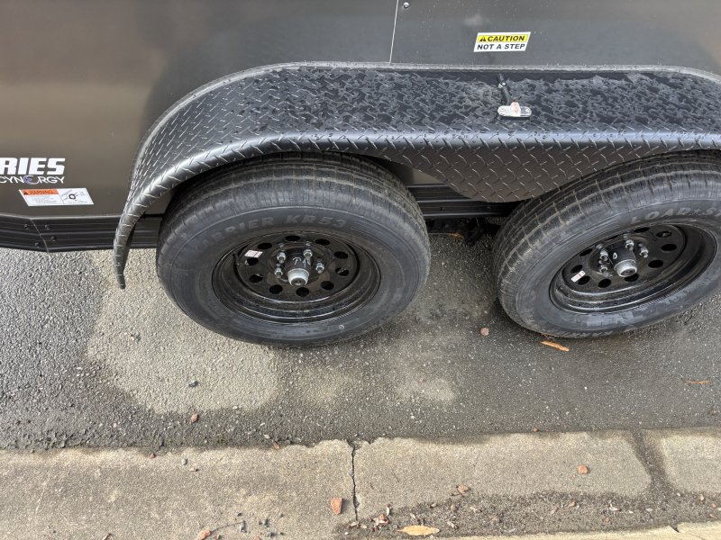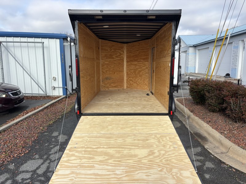 This v-nose 7x12 enclosed cargo trailer has tandem axle setup with a rating of 7,000 lb GVWR. This Pro Series model has a 7' interior height, side door, a rear ramp door, 0.080" polycore sides, a slant v-nose, rear wing, blackout package (black rims, trim, ATP), and a 2000 lb jack.