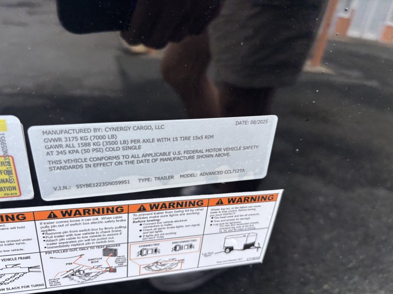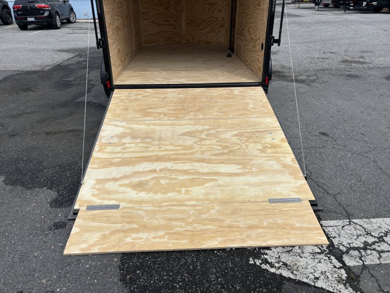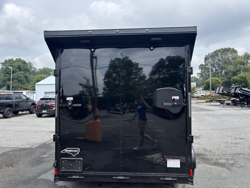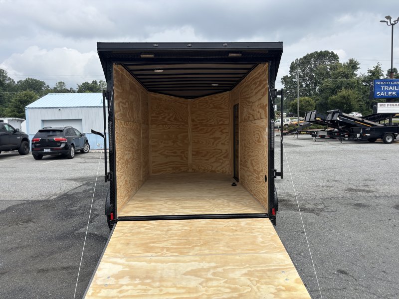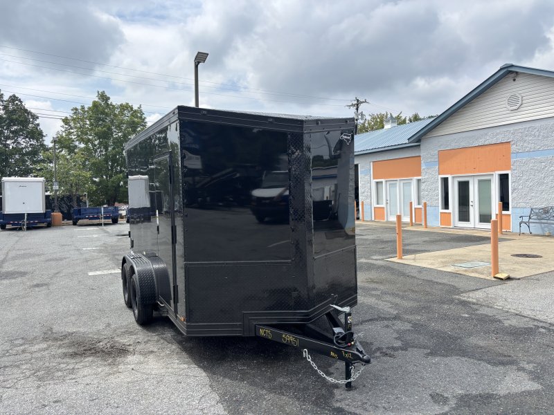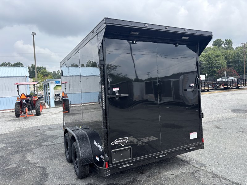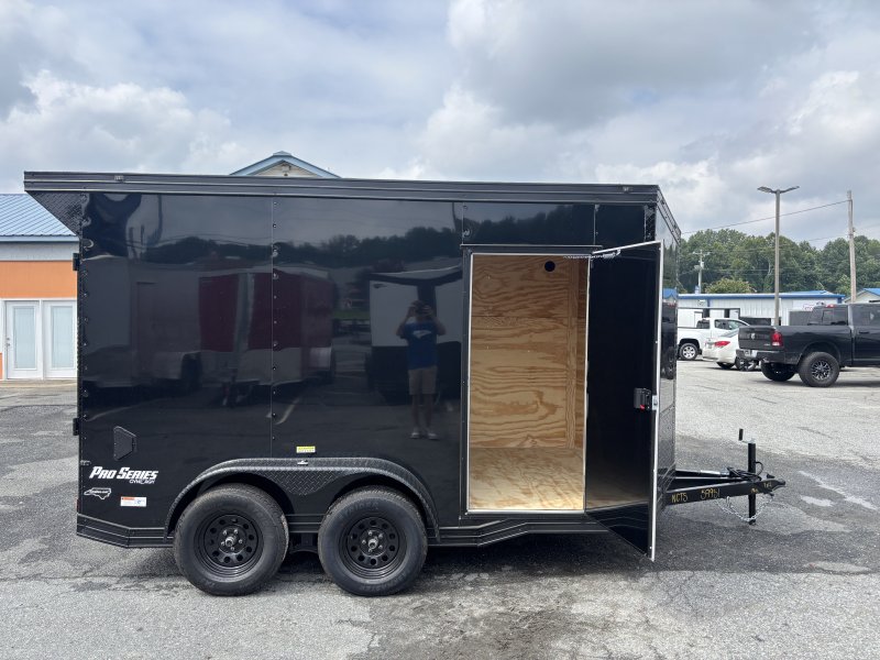 This v-nose 7x12 enclosed cargo trailer is a tandem axle unit with a rating of 7,000 lb GVWR. This Pro Series model has a 7' interior height, side door, a rear ramp door, 0.080" polycore sides, a slant v-nose, rear wing, blackout package (black rims, trim, ATP), and a 2000 lb jack.