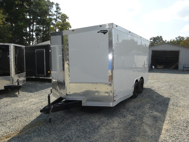 This v-nose 8.5x16 enclosed cargo trailer has a 7' interior height, tandem axles with brakes with a rating of 7,000 lb GVWR. This type of trailer is ideal for light-duty or residential tasks. This model has a side door, a rear ramp door, and a 2000 lb jack.