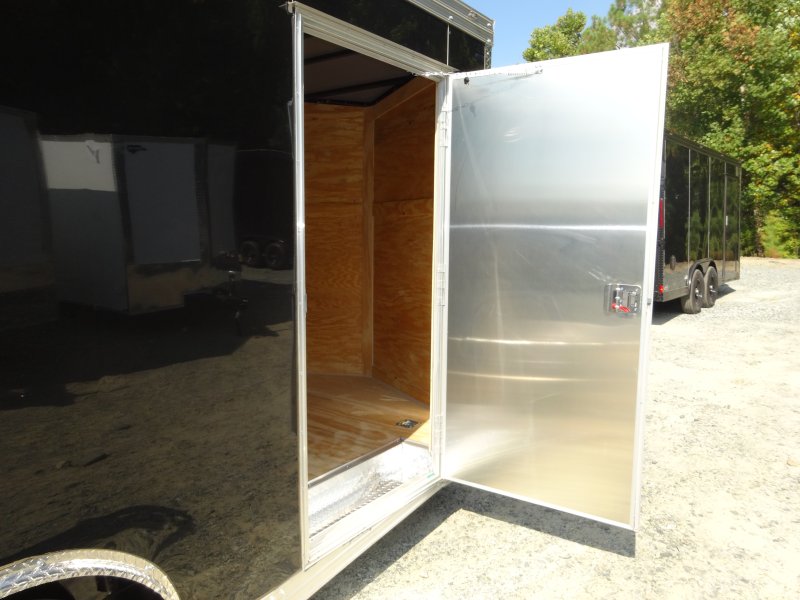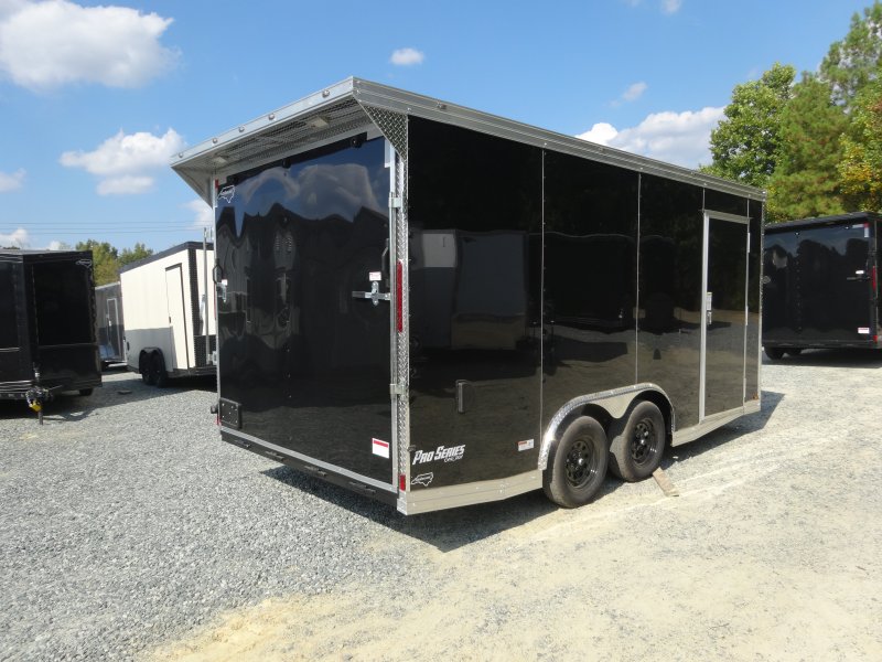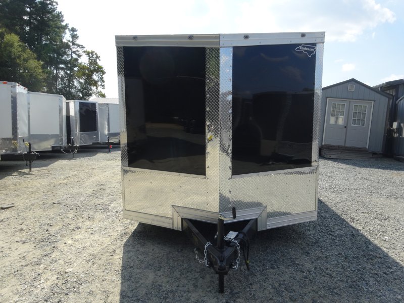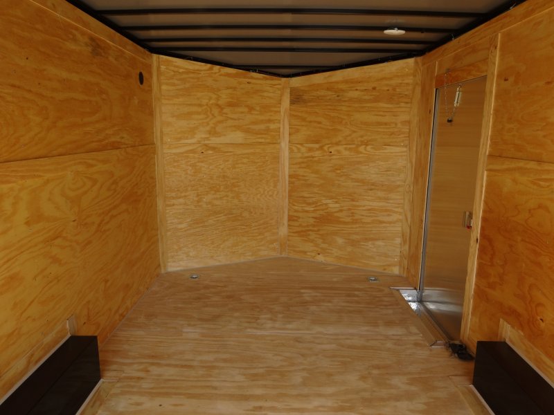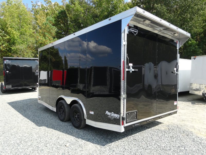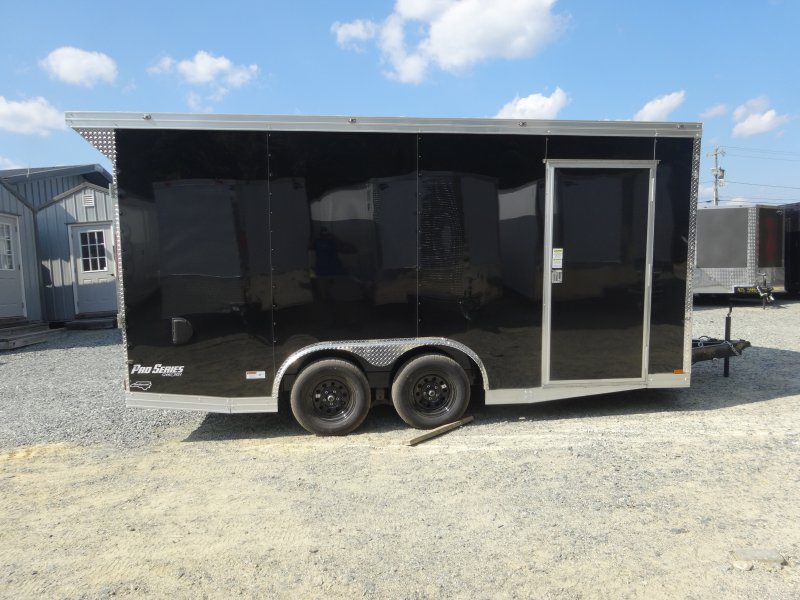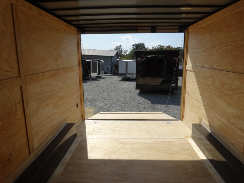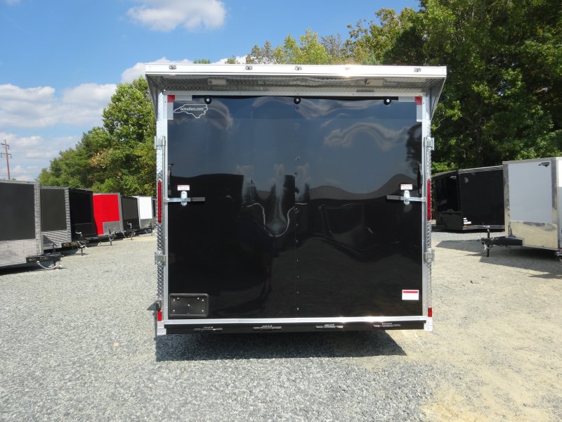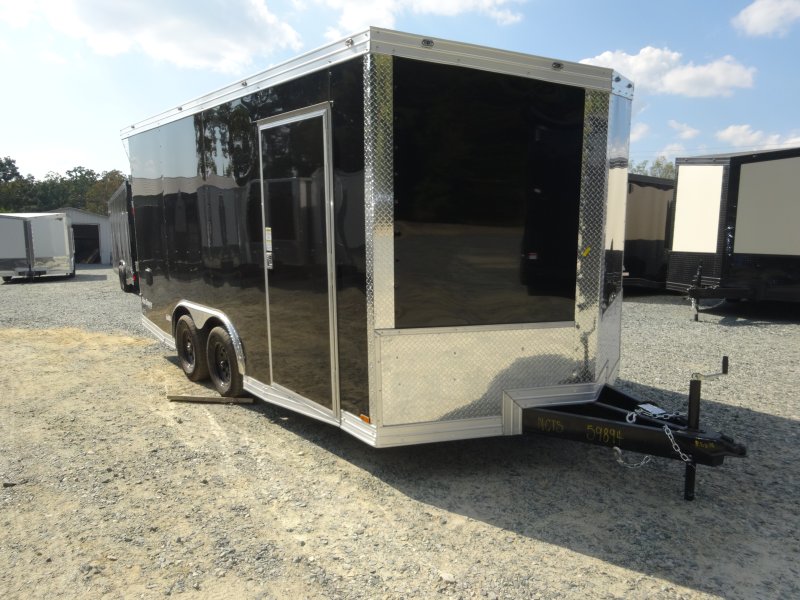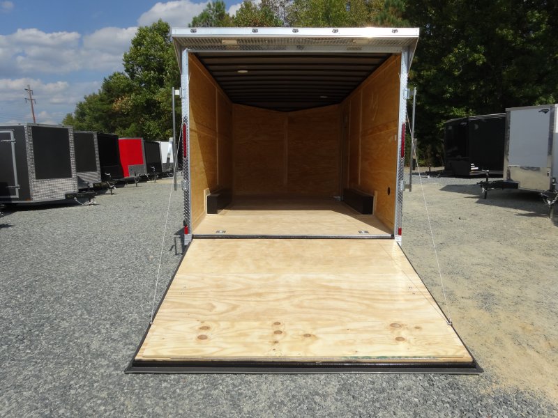 This v-nose 8.5x16 enclosed cargo trailer has a 7' interior height, tandem axles with brakes with a rating of 7,000 lb GVWR. This type of trailer is ideal for light-duty or residential tasks. This model has a side door, a rear ramp door, and a 2000 lb jack.