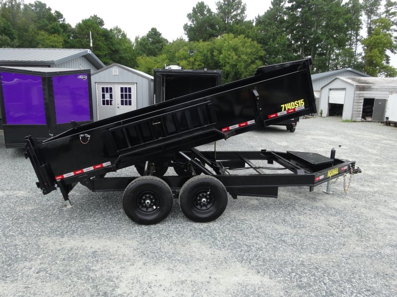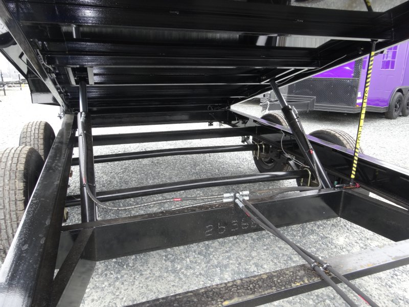 This deluxe 84x14 dump trailer comes with ramps. This dump trailer has a front box with 24" tall sides and side mount ramps. The dump trailer is a dual cylinder hydraulic piston lift. Also includes a combo spreading and split gate.