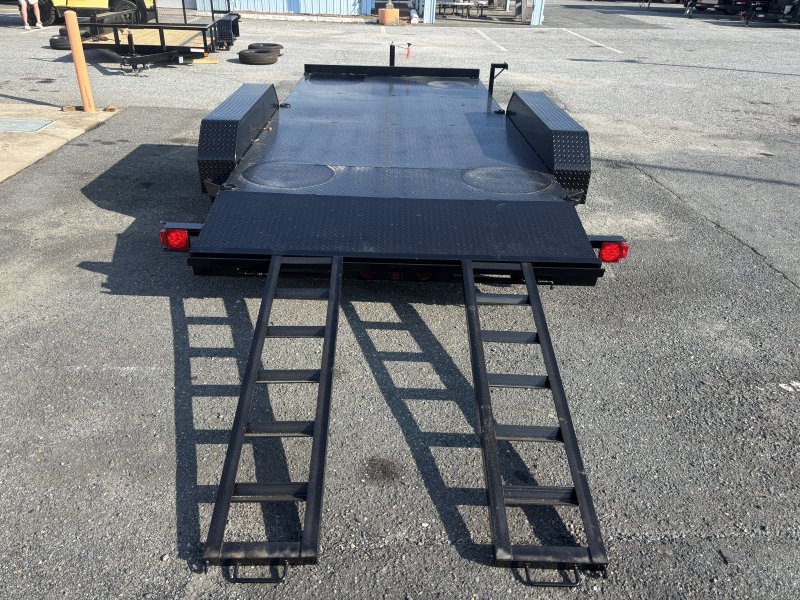 This deluxe 7,000 lb diamond plate steel floor single-car hauler measures 84-inch span between fenders with a 16-foot length. Standard features include a fixed 2 5/16″ A-frame coupler, four-wheel brakes, 205/75 R15 tires, 6 D-rings, a 4' dovetail with rear slide-in loading ramps.