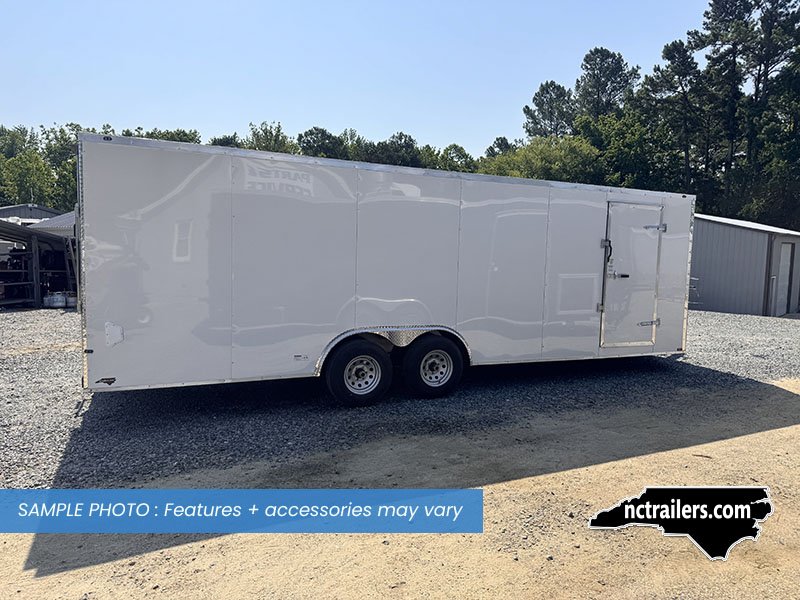"This v-nose 8.5x24 enclosed cargo trailer has a 6'6"" interior height, tandem axles with brakes with a rating of 10,000 lb GVWR. This type of trailer is ideal for light-duty or residential tasks. This model has a side door, a rear ramp door, and a 2000 lb jack.