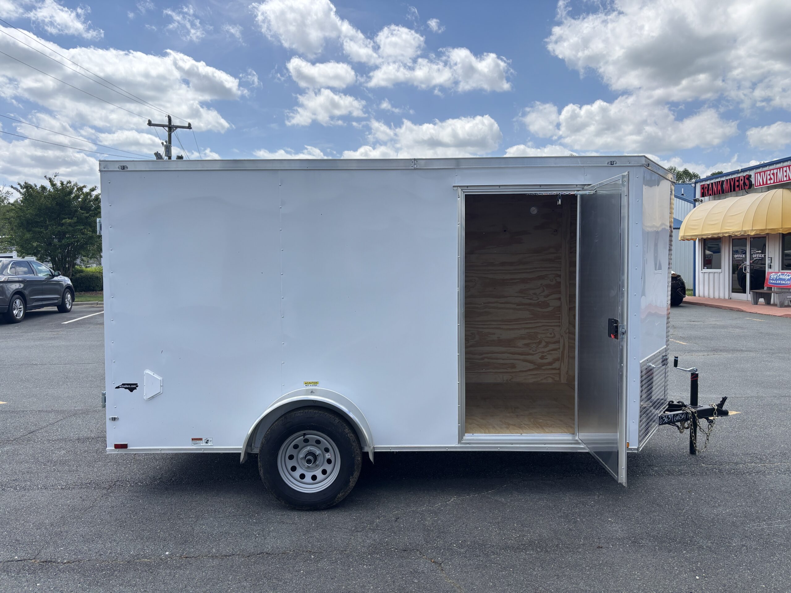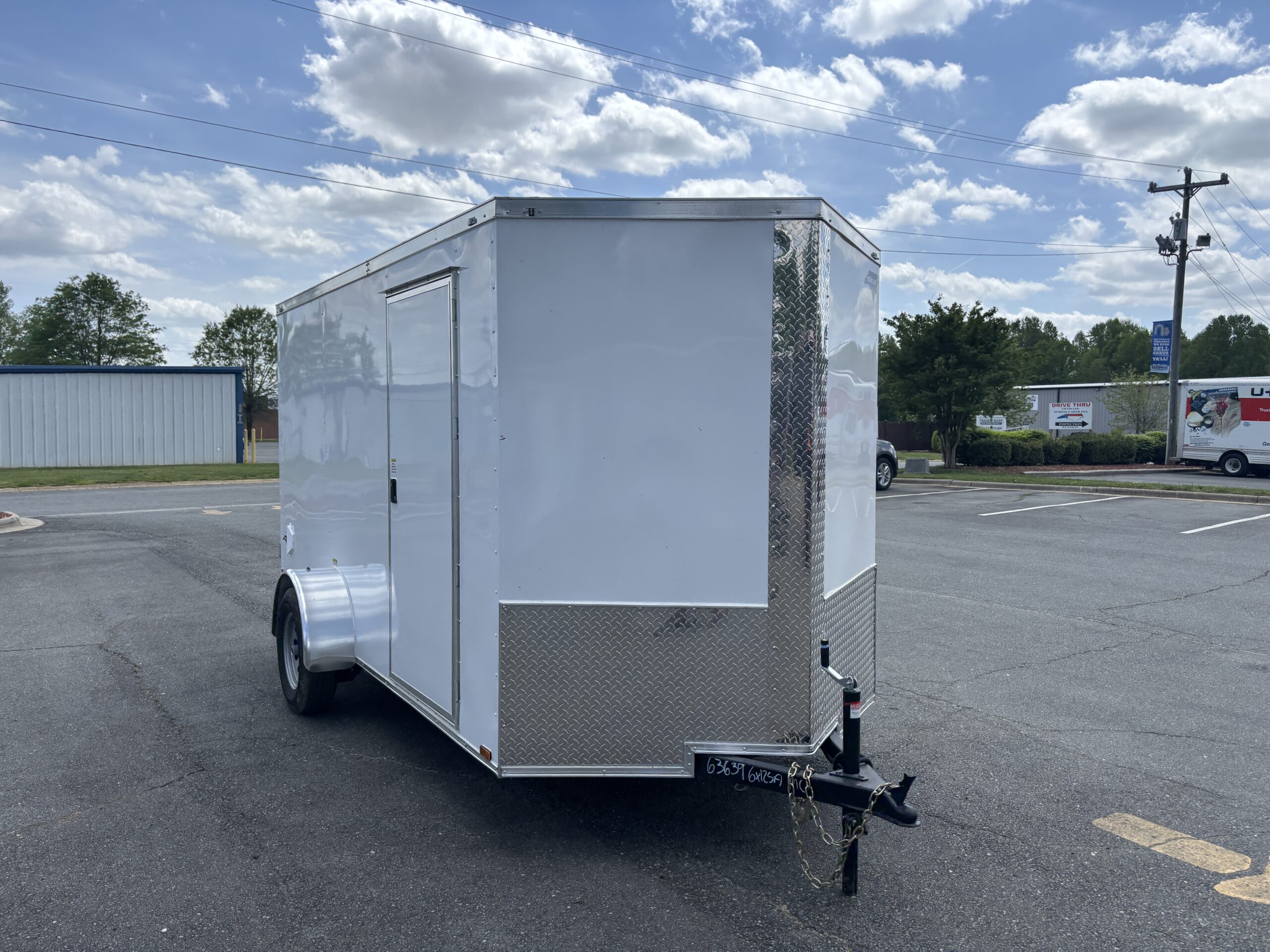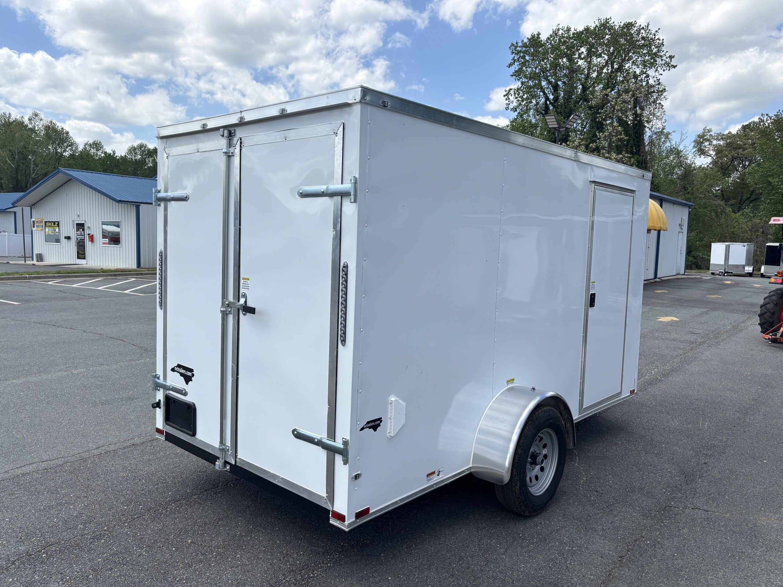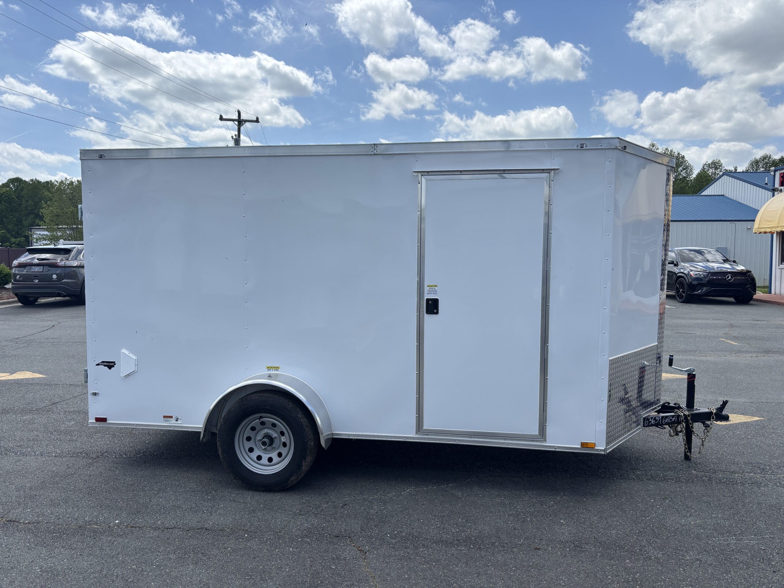 This v-nose 6x12 enclosed cargo trailer has a single non-braking idler axle with a rating of 2,990 lb GVWR. This type of trailer is ideal for light-duty or residential tasks. This model has a side door, rear barn doors, and a 2000 lb jack.