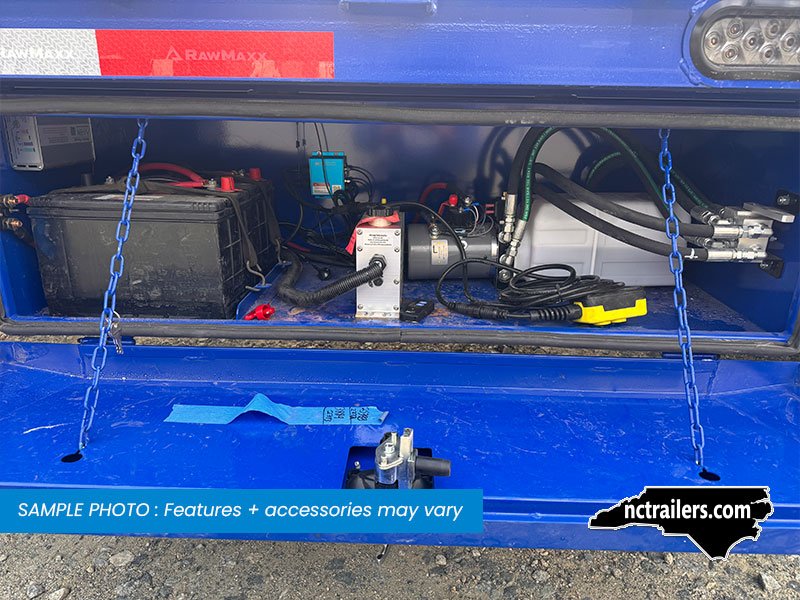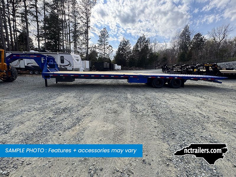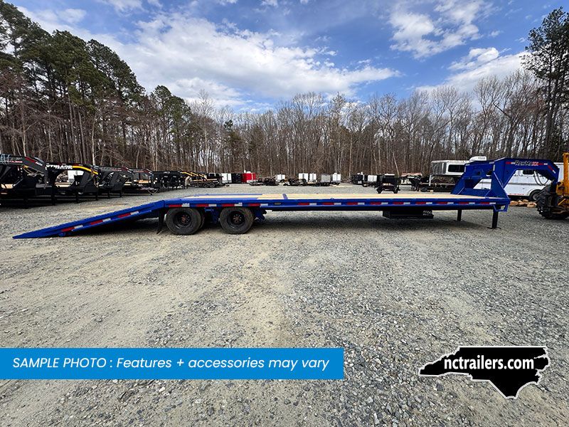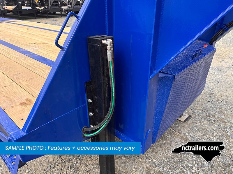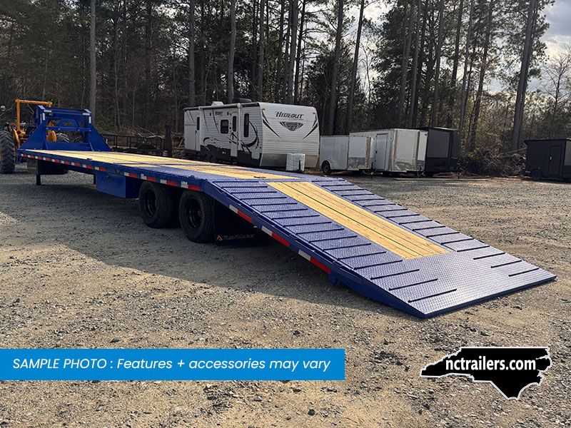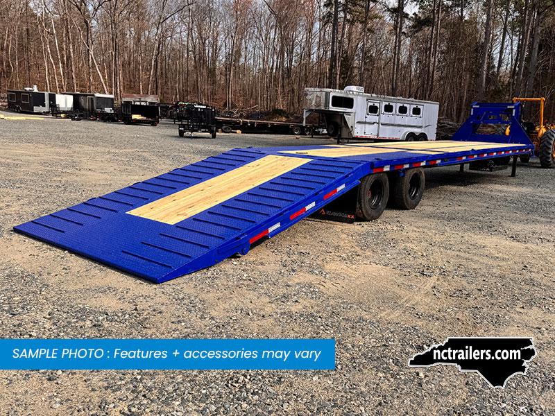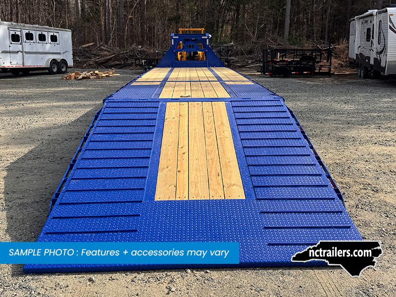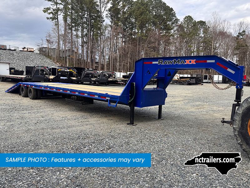 The RawMaxx HTX series is a 8.5x40 gooseneck deckover trailer with 11' hydraulic tail. This unit has two 12K lb leaf spring axles. 12" x 19 lb I beam frame, 12" x 19 lb gooseneck, and 16" on-center crossmembers. Dual 12,000 lb drop leg jacks, electric hydraulic brake system, and LED lights. 2" rub rails, stake pockets, 4 weld-on D-rings, and 40' slide track for ratchets.