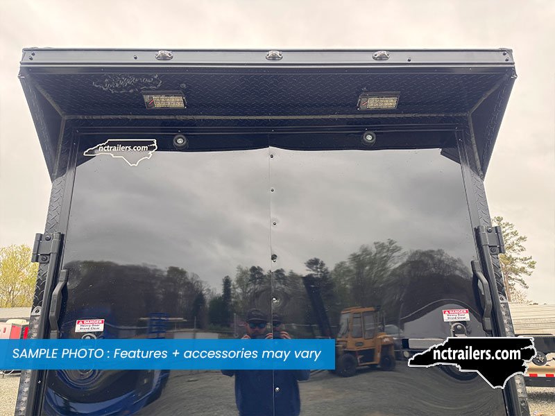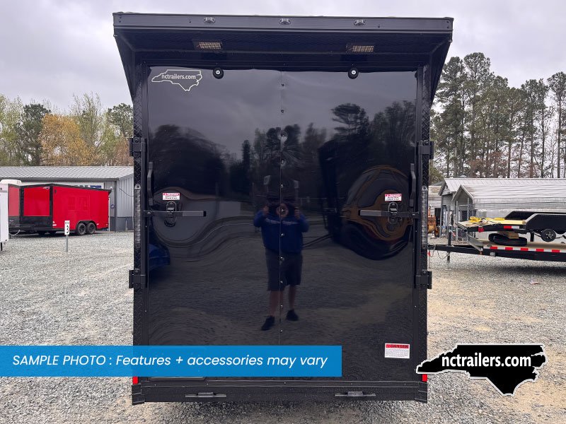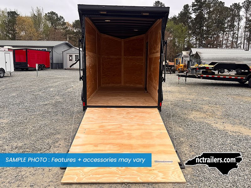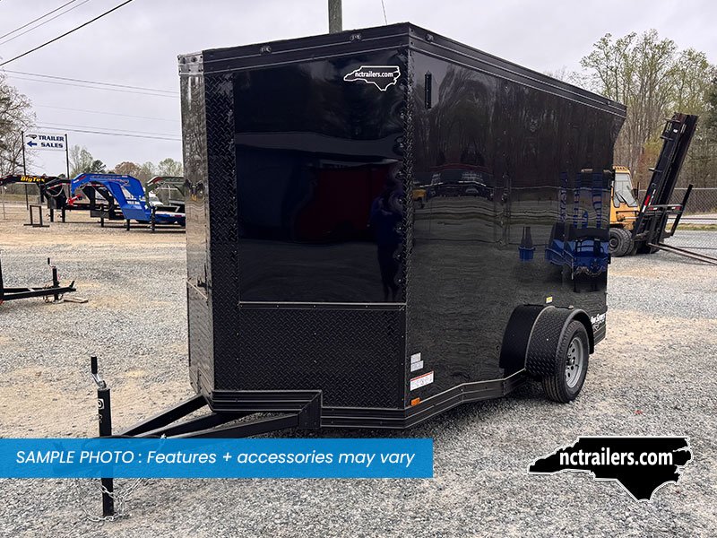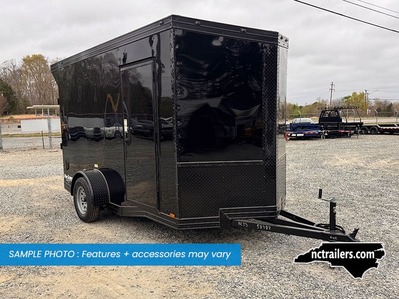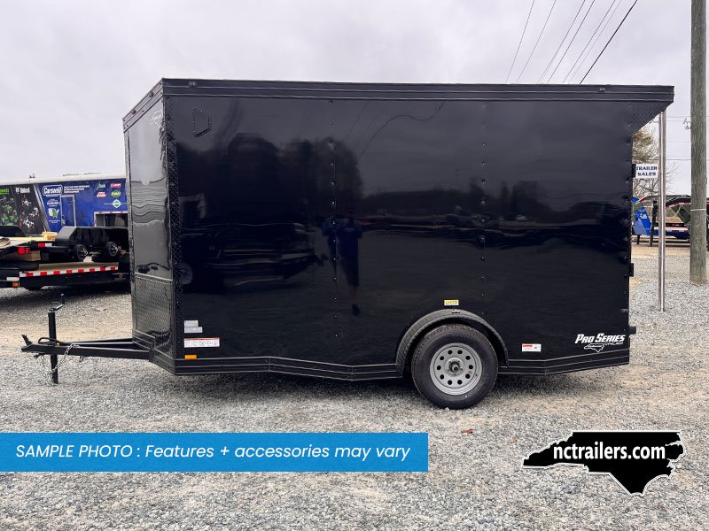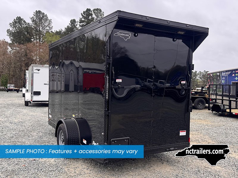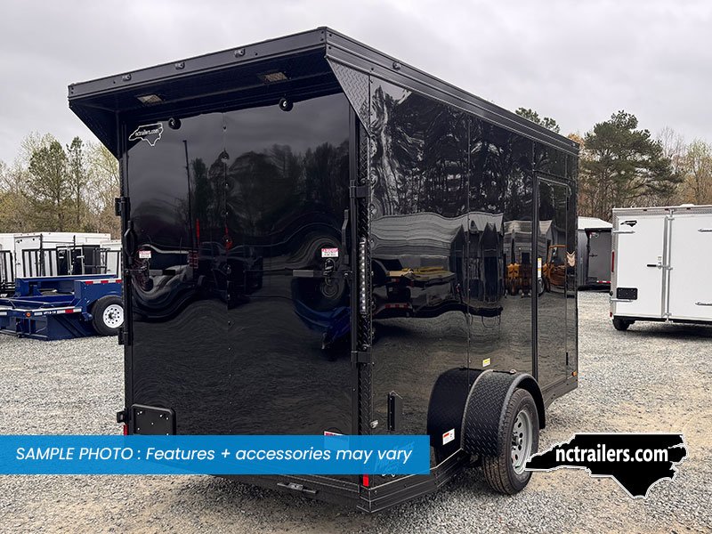 This v-nose 6x12 enclosed cargo trailer has a single non-braking idler axle with a rating of 2,990 lb GVWR. This Pro Series model has a side door, a rear extended ramp door, 0.080" polycore sides, 7' interior height, a slant v-nose, rear wing with LED lights, blackout package (black rims, trim, ATP), and a 2000 lb jack.