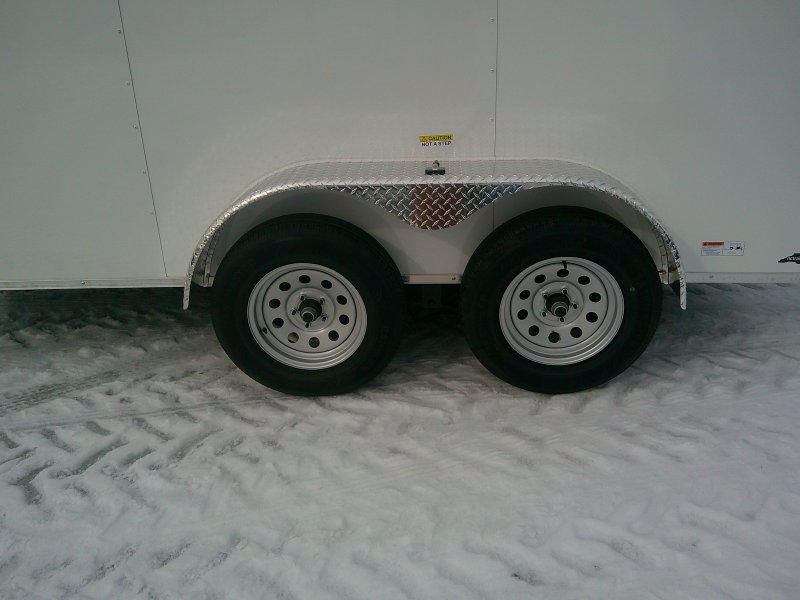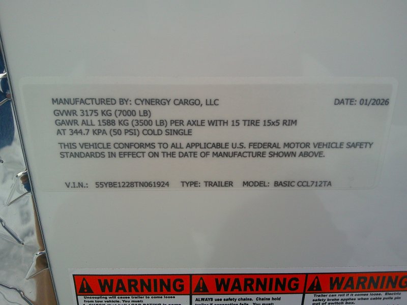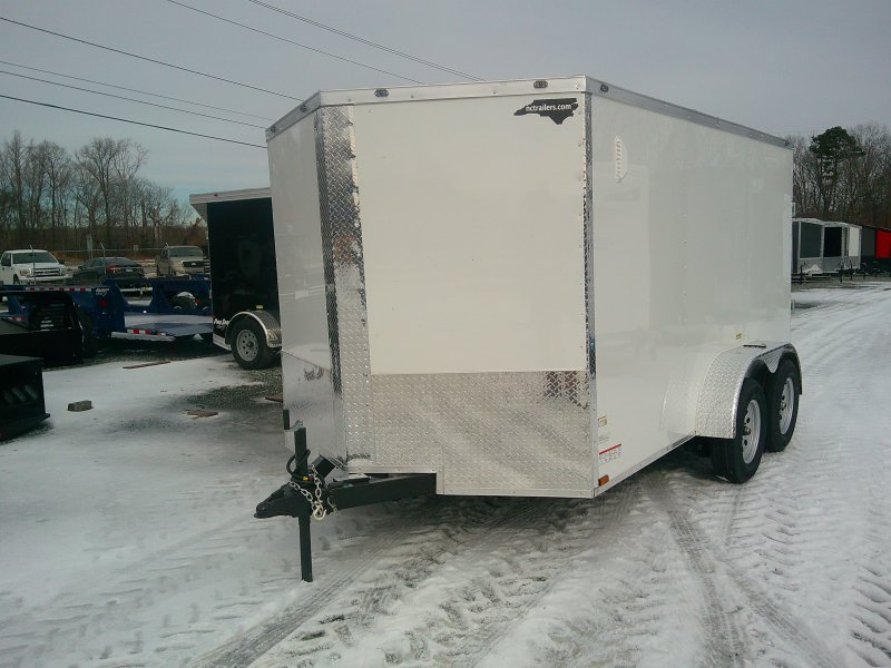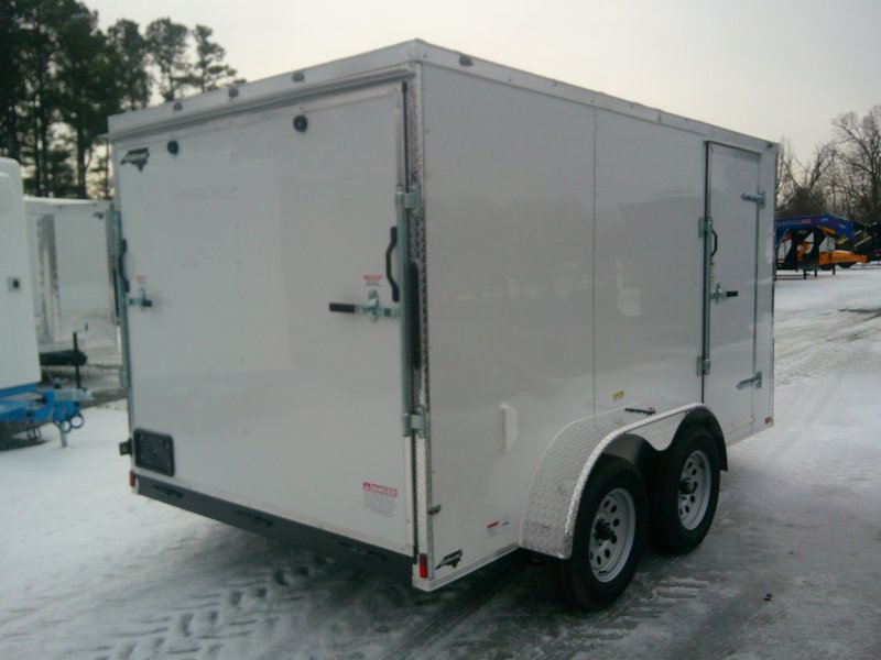 This v-nose 7x12 enclosed cargo trailer has 6' interior height, a tandem braking axle with a rating of 7000 lb GVWR. This type of trailer is ideal for light-duty or residential tasks. This model has a side door, a rear ramp door, and a 2000 lb jack.