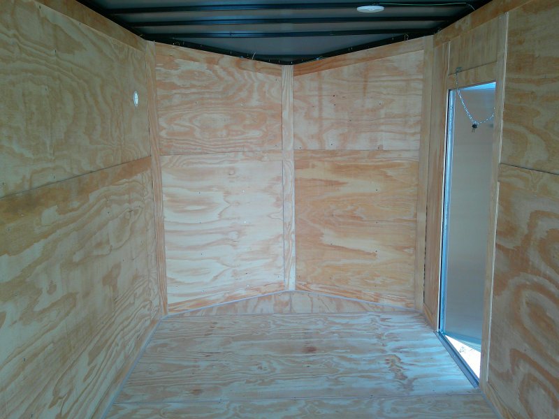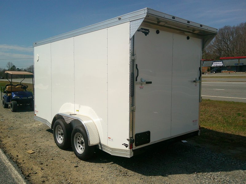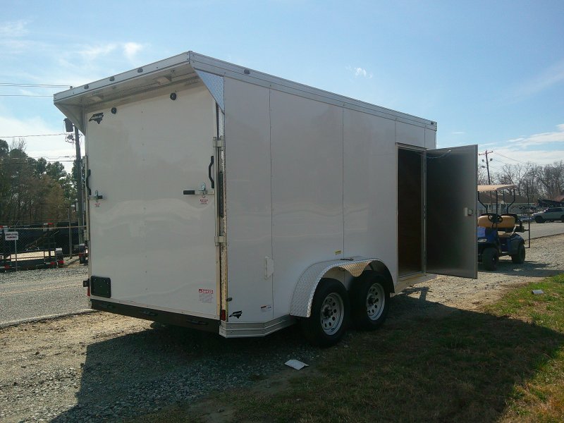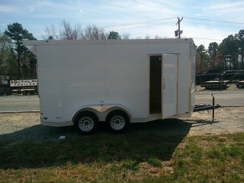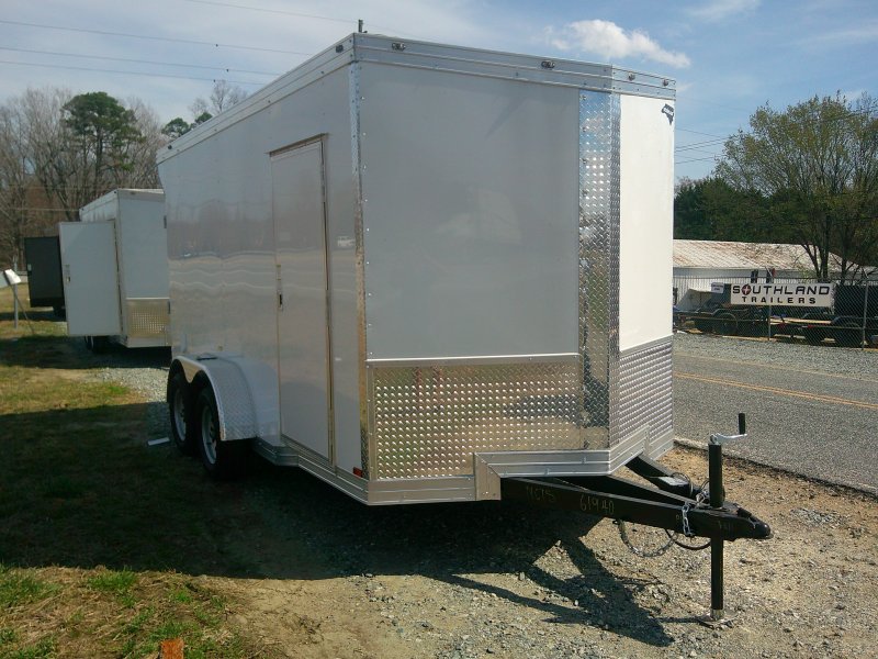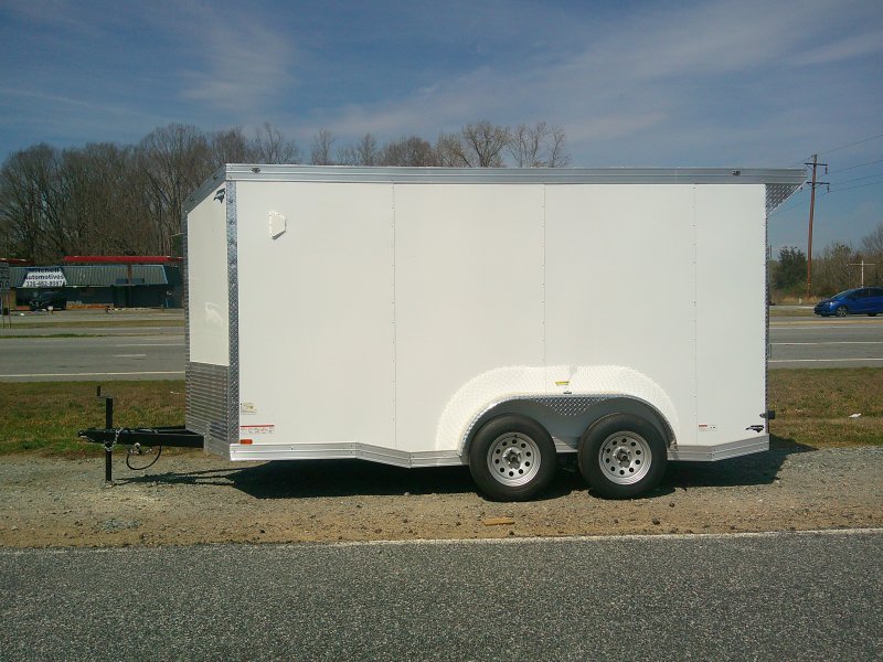 This v-nose 7x14 enclosed cargo trailer has a 7' interior height, tandem axles with brakes with a rating of 7,000 lb GVWR. This Pro Series model has a side door, a rear ramp door, 0.080"" polycore sides, a slant v-nose, rear wing, and a 2000 lb jack.