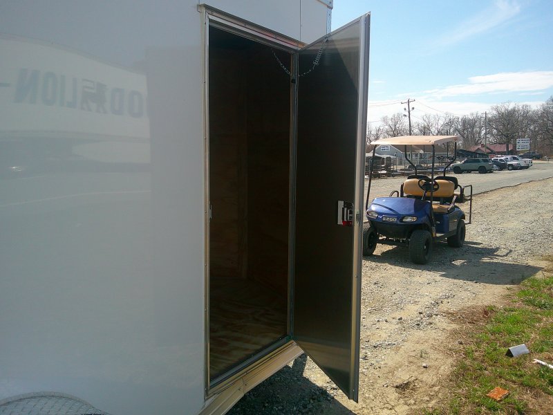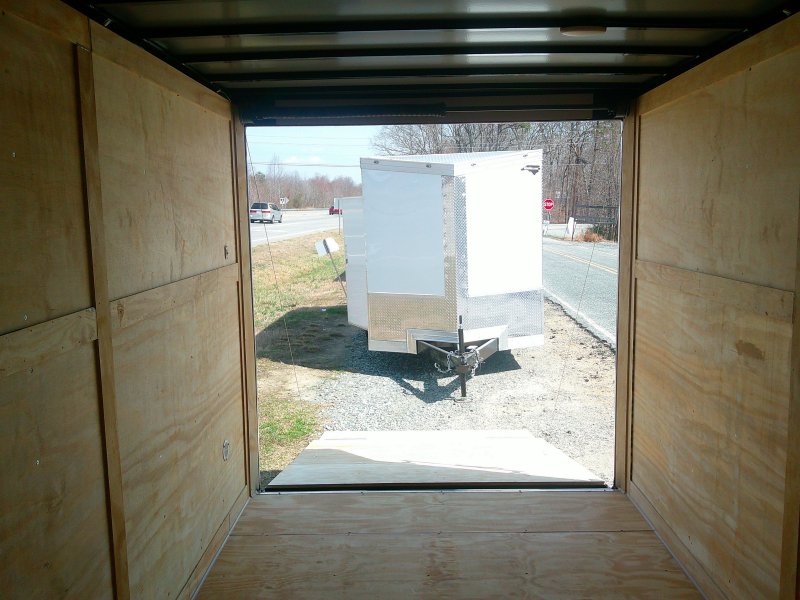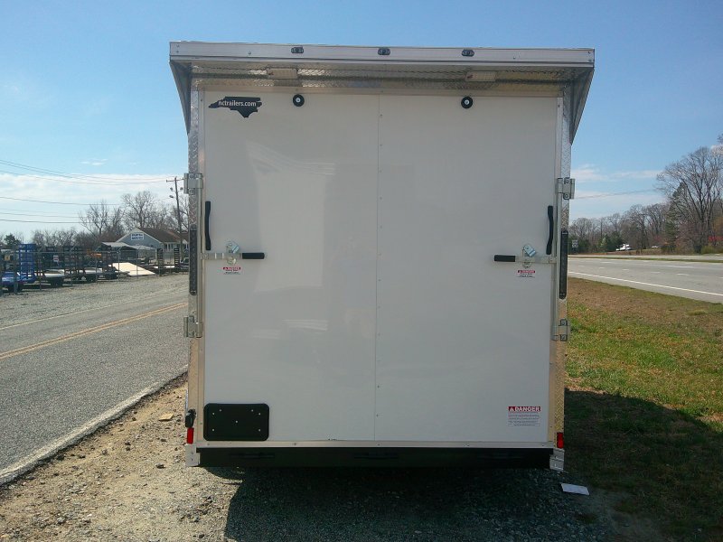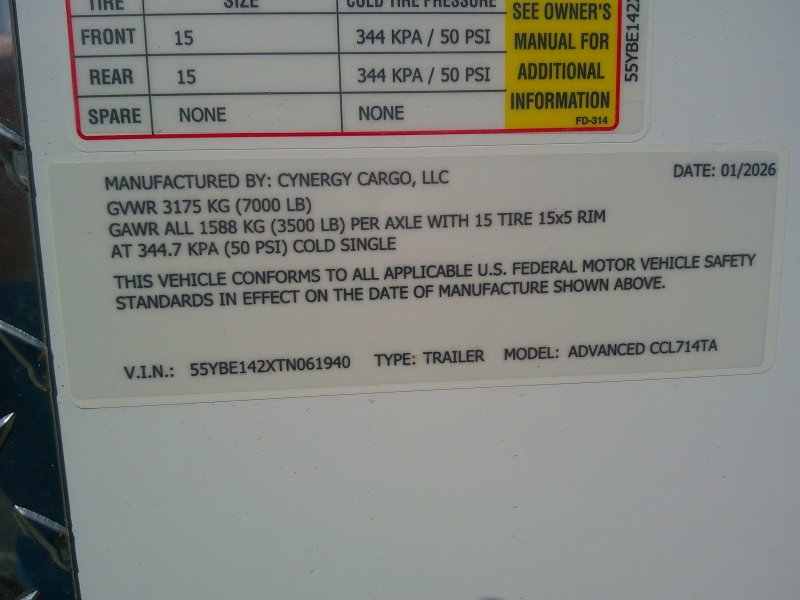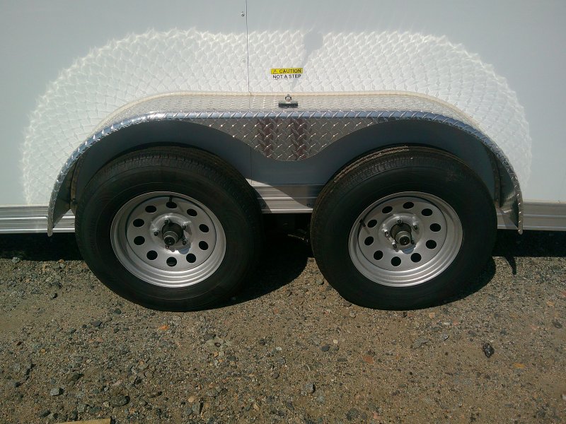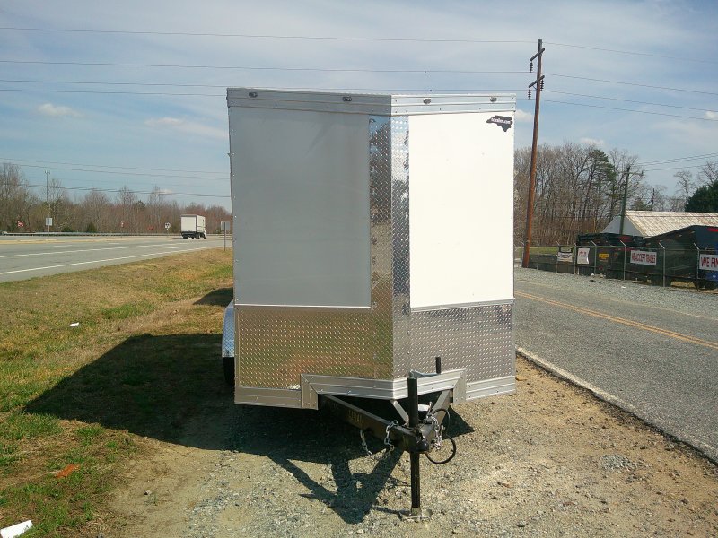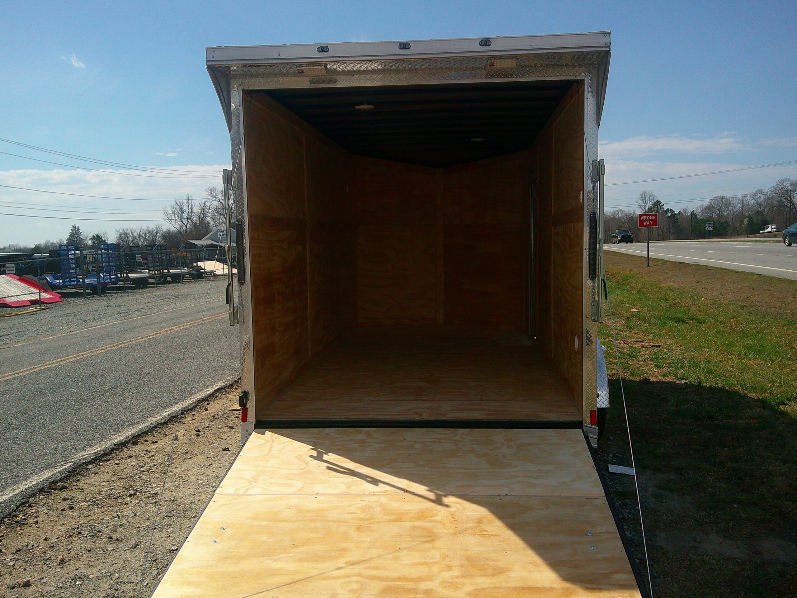 This v-nose 7x14 enclosed cargo trailer has a 7' interior height, tandem axles with brakes with a rating of 7,000 lb GVWR. This Pro Series model has a side door, a rear ramp door, 0.080"" polycore sides, a slant v-nose, rear wing, and a 2000 lb jack.