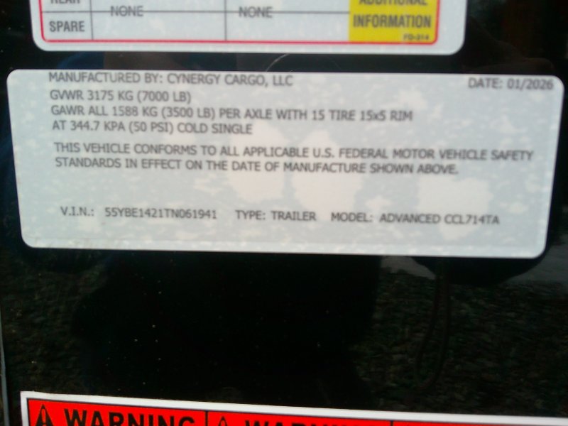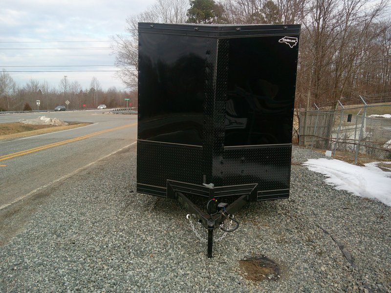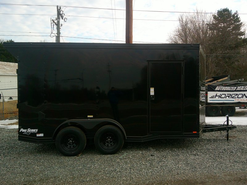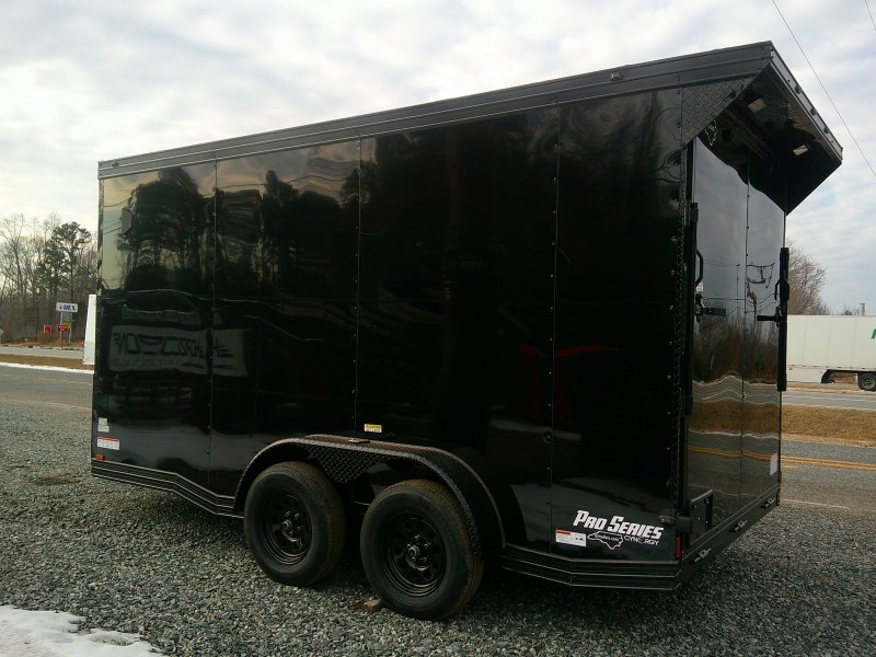 This v-nose 7x14 enclosed cargo trailer has a 7' interior height, tandem axles with brakes with a rating of 7,000 lb GVWR. This Pro Series model has a side door, a rear ramp door, 0.080" polycore sides, a slant v-nose, rear wing, blackout package (black rims, trim, ATP), and a 2000 lb jack.