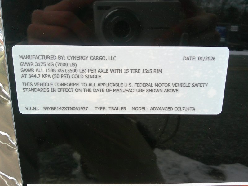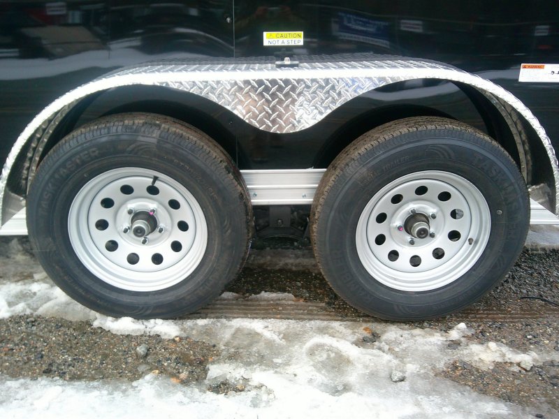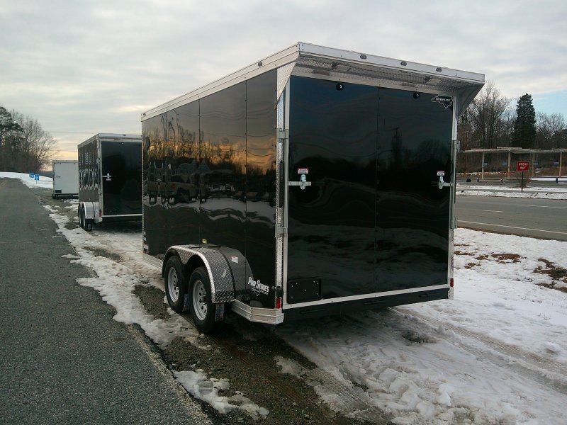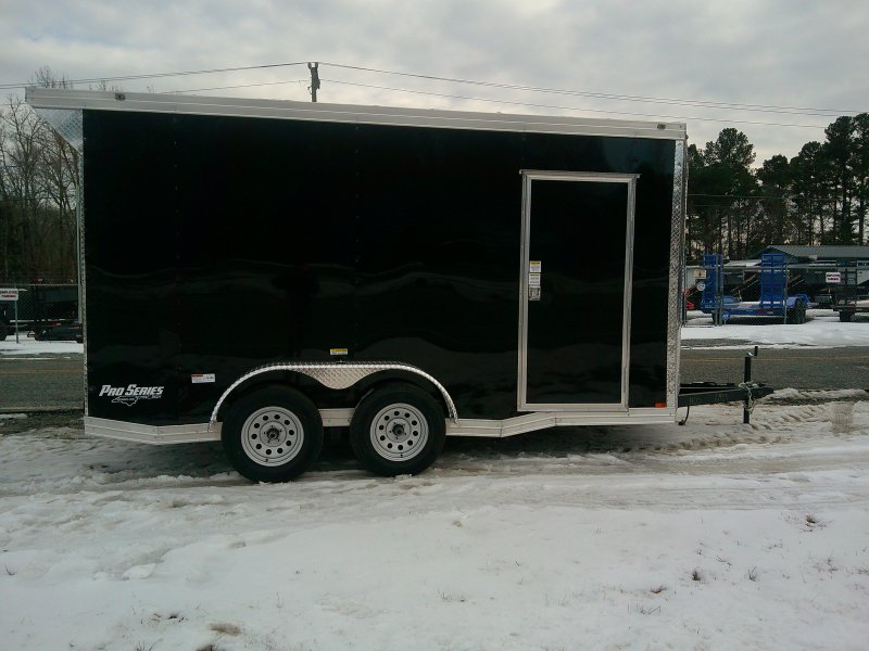 This v-nose 7x14 enclosed cargo trailer has a 7' interior height, tandem axles with brakes with a rating of 7,000 lb GVWR. This Pro Series model has a side door, a rear ramp door, 0.080" polycore sides, a slant v-nose, rear wing, and a 2000 lb jack.