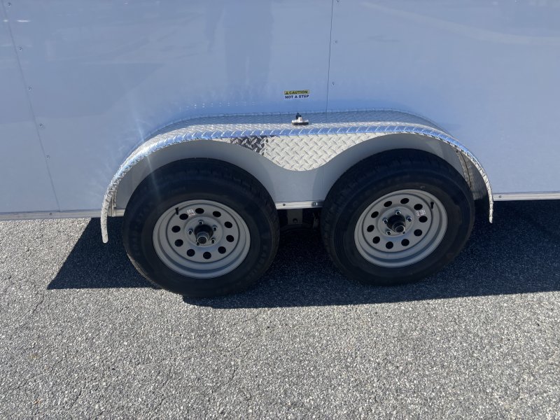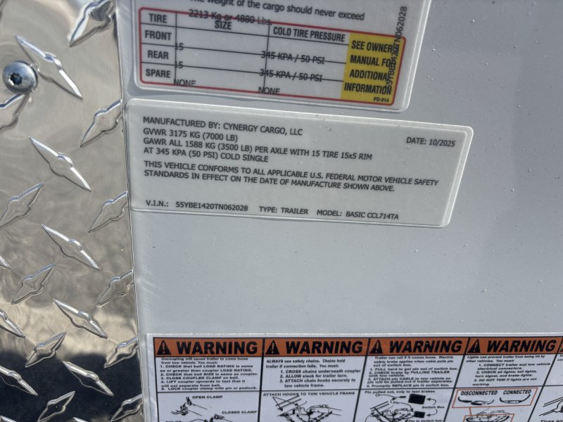 "This v-nose 7x14 enclosed cargo trailer has a 6'3"" interior height, tandem axles with brakes with a rating of 7,000 lb GVWR. This model has a side door, a rear ramp door, and a 2000 lb jack.