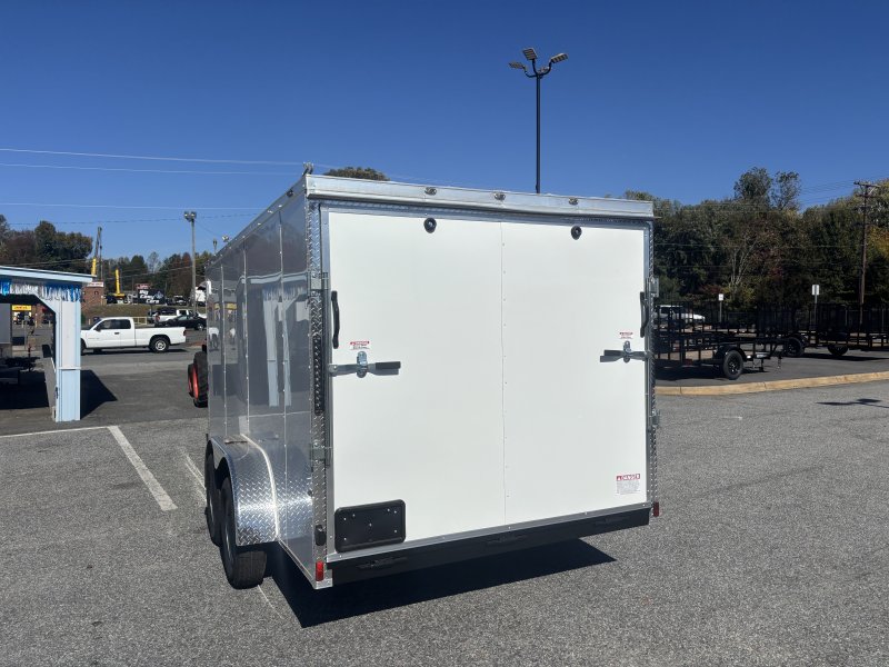 This v-nose 7x14 enclosed cargo trailer has a 6'3" interior height, tandem axles with brakes with a rating of 7,000 lb GVWR. This model has a side door, a rear ramp door, and a 2000 lb jack.
