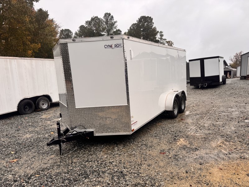 This v-nose 7x16 enclosed cargo trailer has a 6'3" interior height, tandem axles with brakes with a rating of 7,000 lb GVWR. This type of trailer is ideal for light-duty or residential tasks. This model has a side door, a rear ramp door, and a 2000 lb jack.