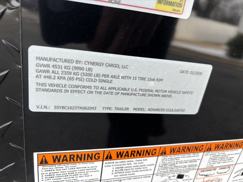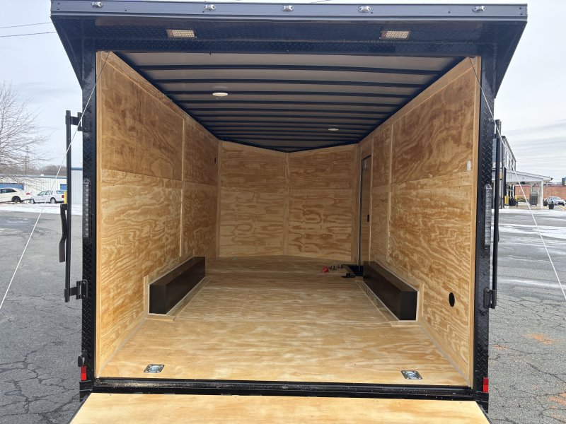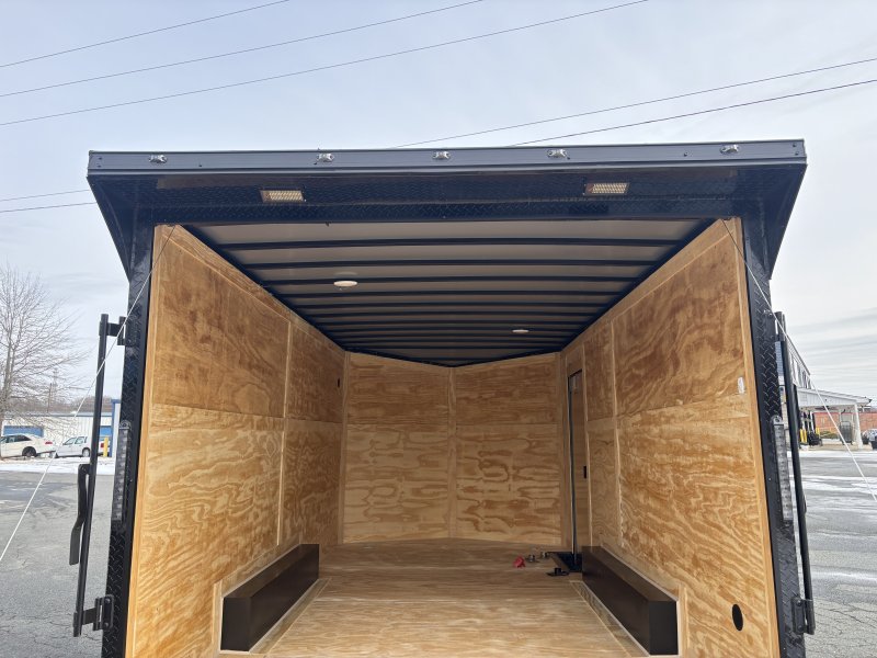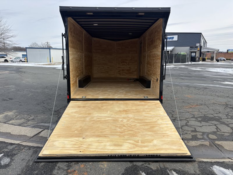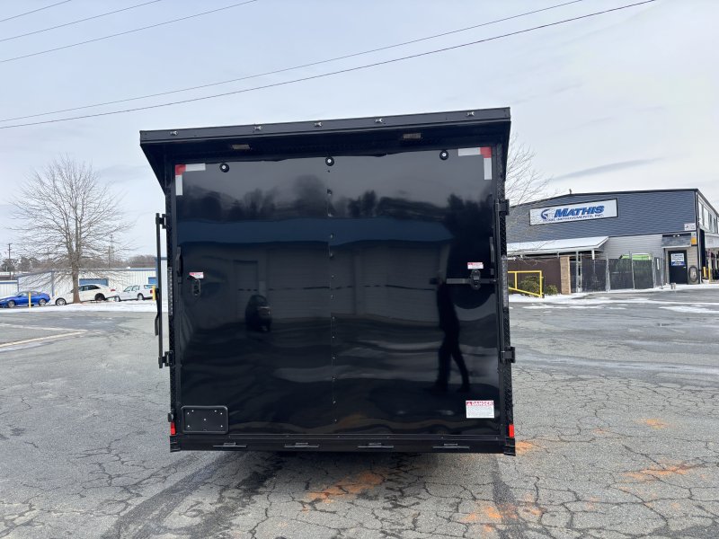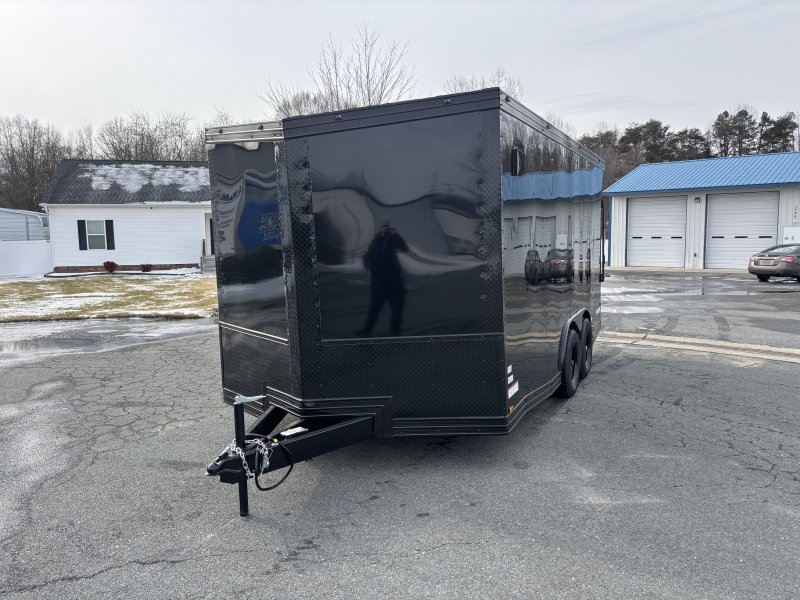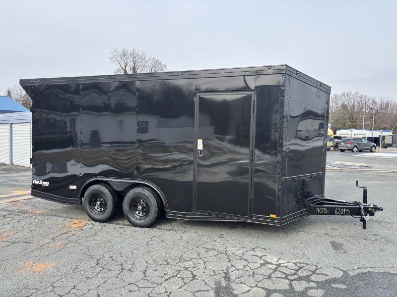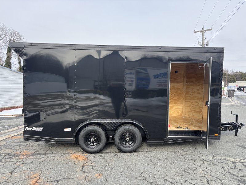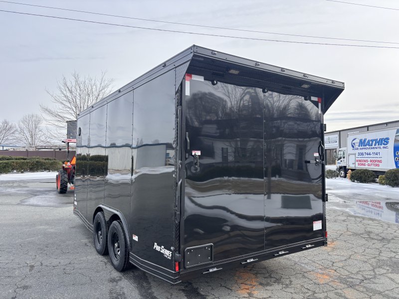 "This v-nose 8.5x16 enclosed cargo trailer has a 7' interior height, tandem axles with brakes with a rating of 10,000 lb GVWR. This Pro Series model has a side door, a rear ramp door, 0.080"" polycore sides, a slant v-nose, rear wing, blackout package (black rims, trim, ATP), and a 2000 lb jack.
