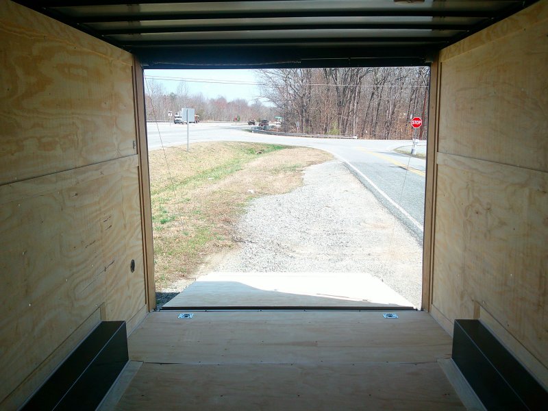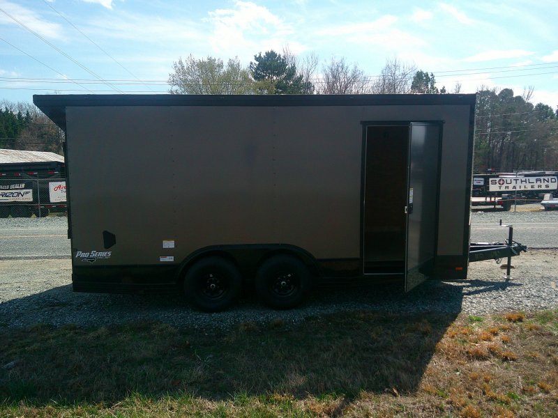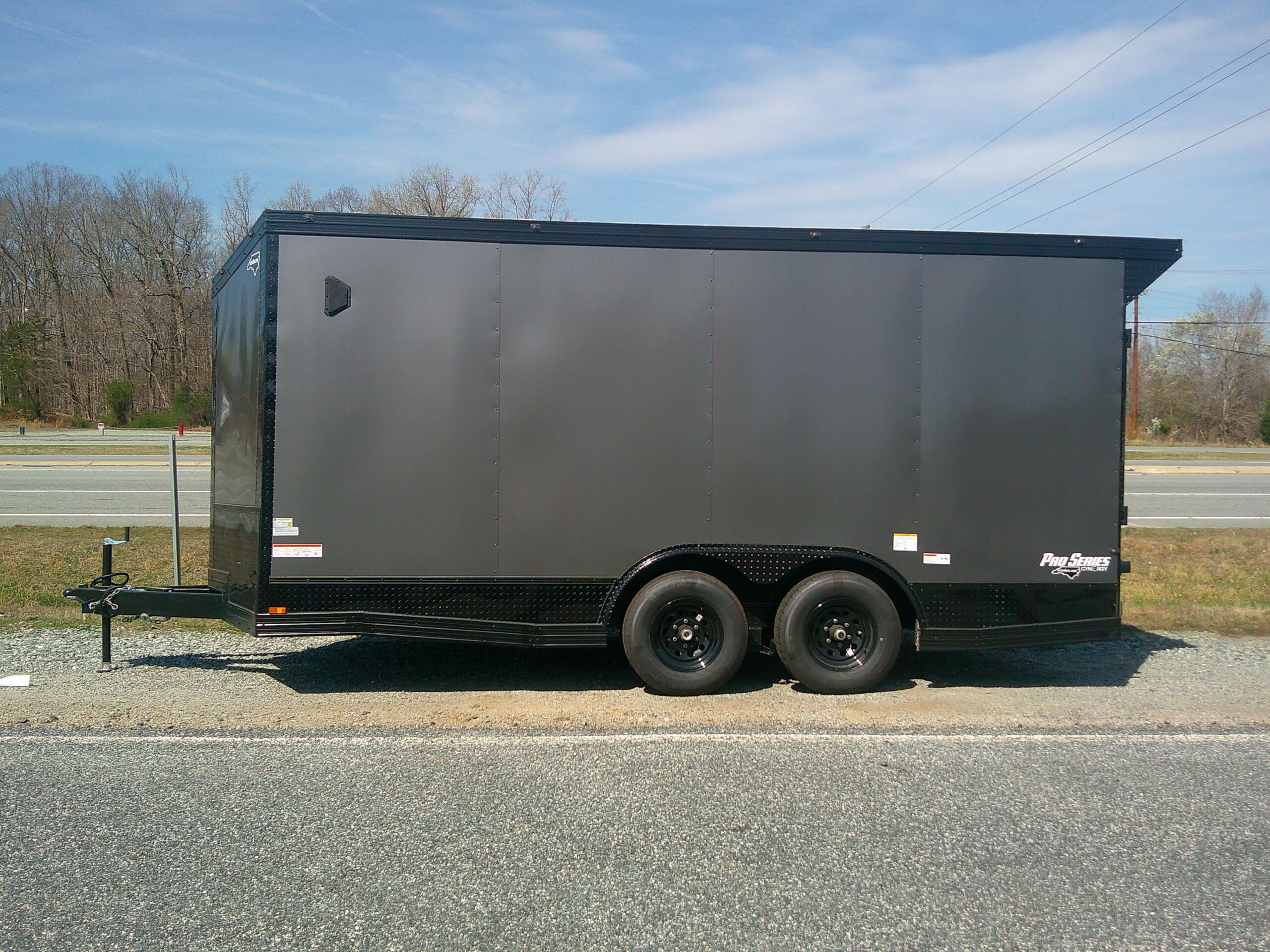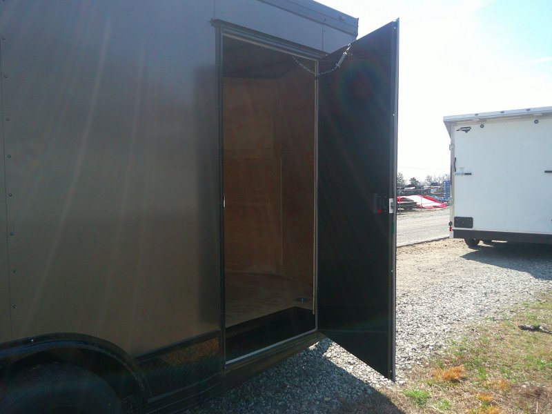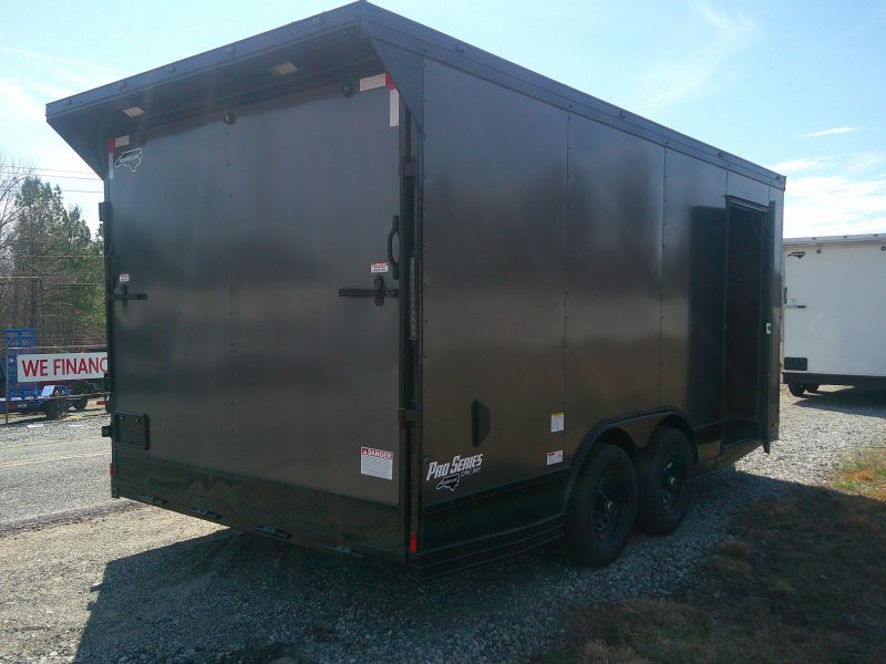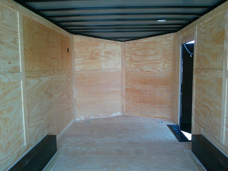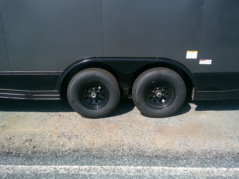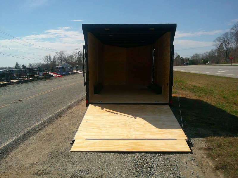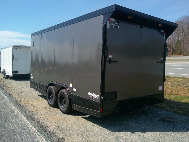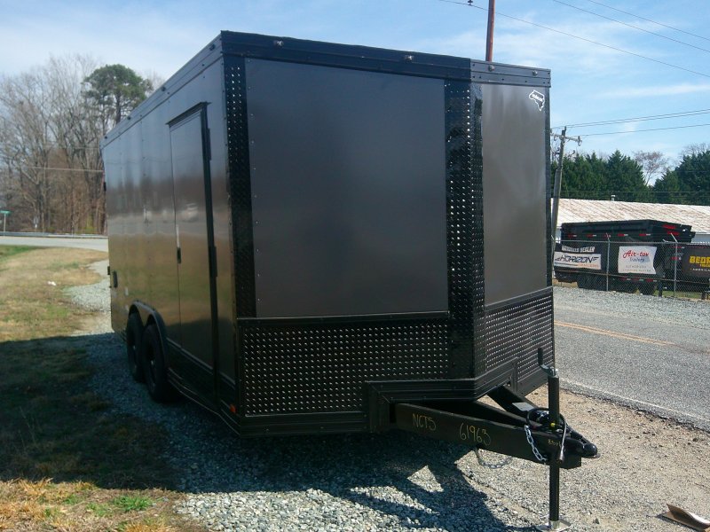 This v-nose 8.5x16 enclosed cargo trailer has a 7' interior height, .080 metal poly core exterior, rear spoiler with flood lights, black out package, slanted v-nose, 5200 lb tandem axles with brakes with a rating of 10,000 lb GVWR. This type of trailer is ideal for light-duty or residential tasks. This model has a side door, a rear ramp door, and a 2000 lb jack.