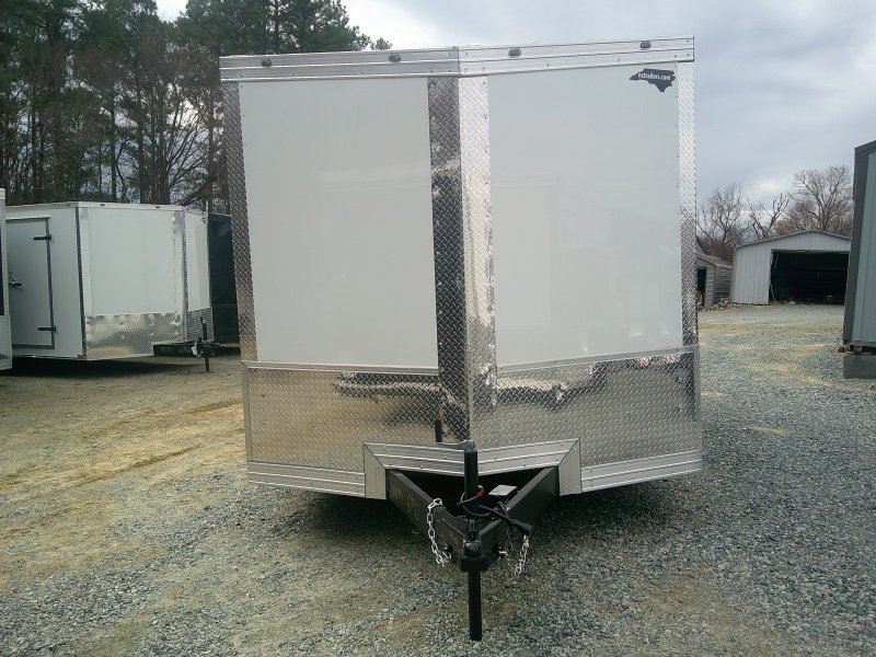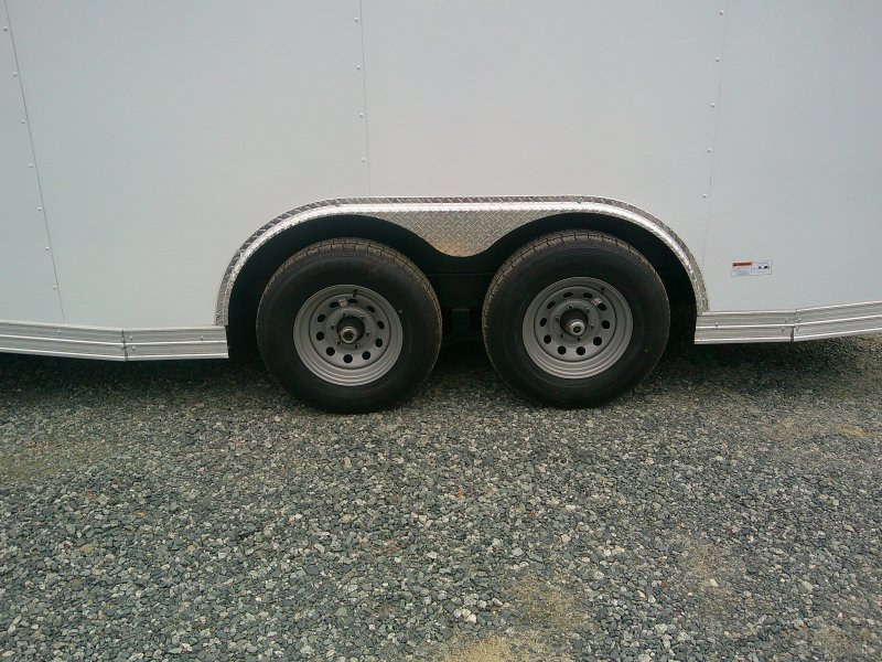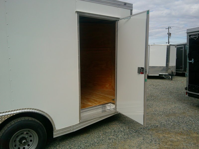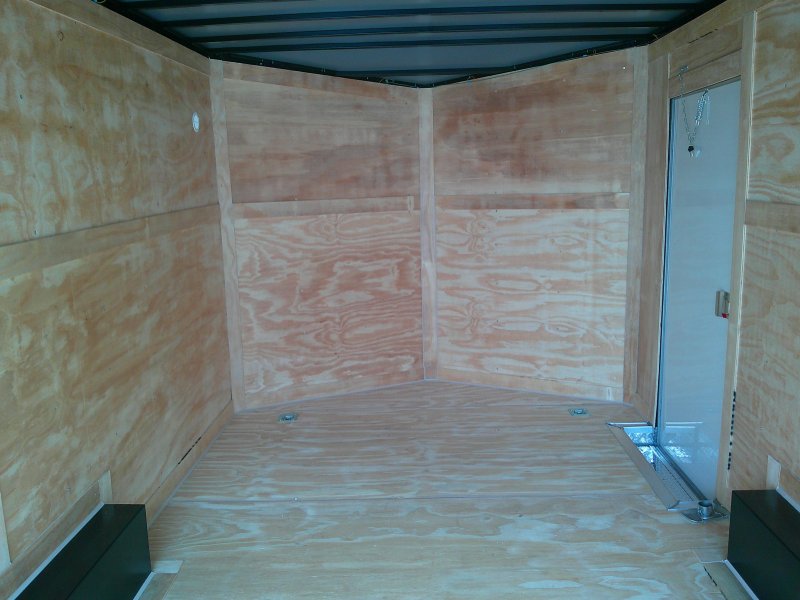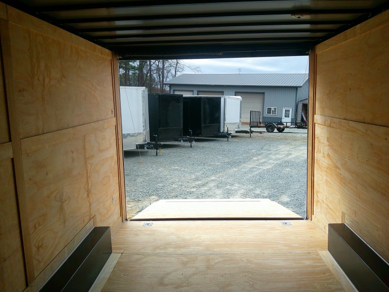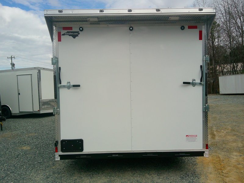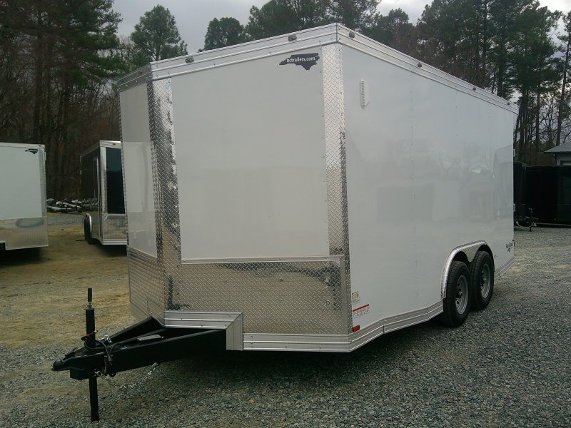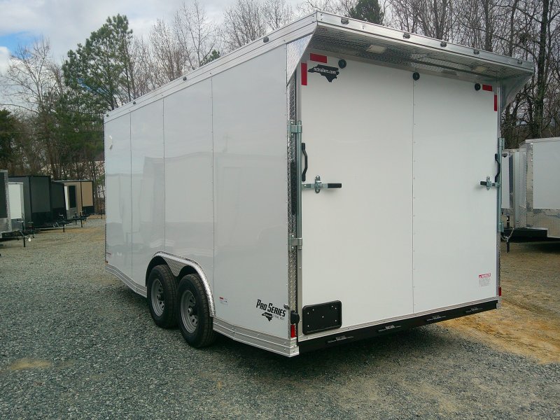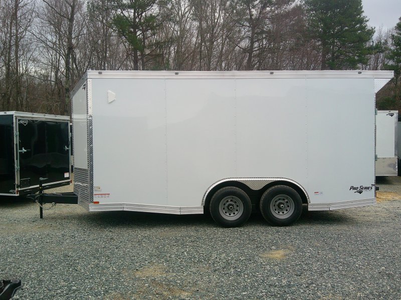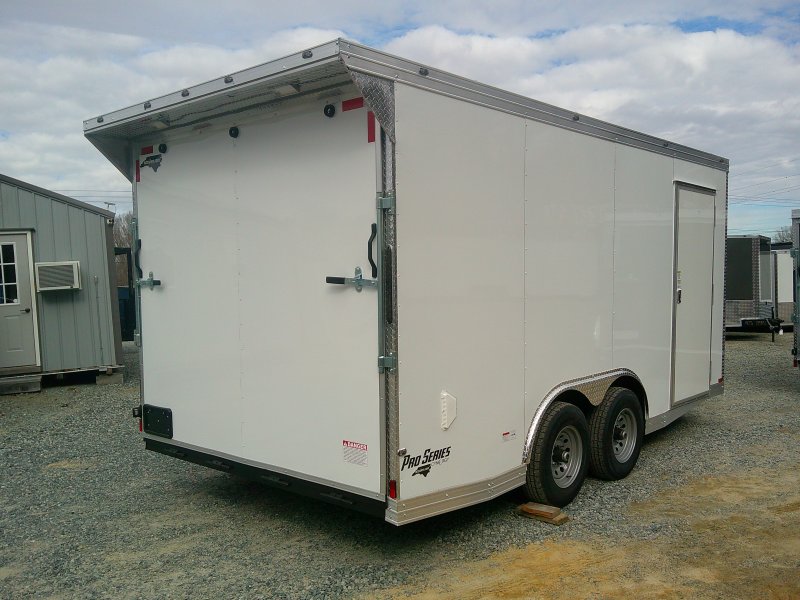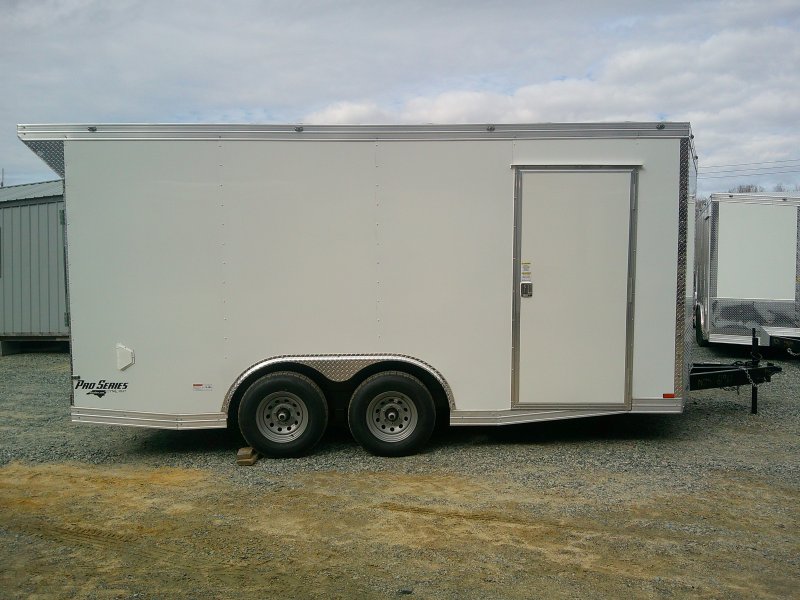 "This v-nose 8.5x16 enclosed cargo trailer has a 7' interior height, tandem axles with brakes with a rating of 10,000 lb GVWR. This Pro Series model has a side door, a rear ramp door, 0.080"" polycore sides, a slant v-nose, rear wing, and a 2000 lb jack.