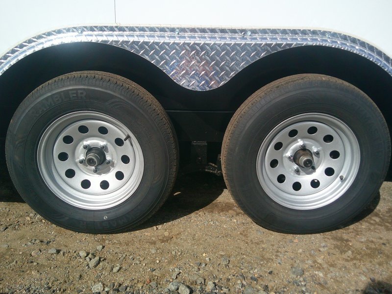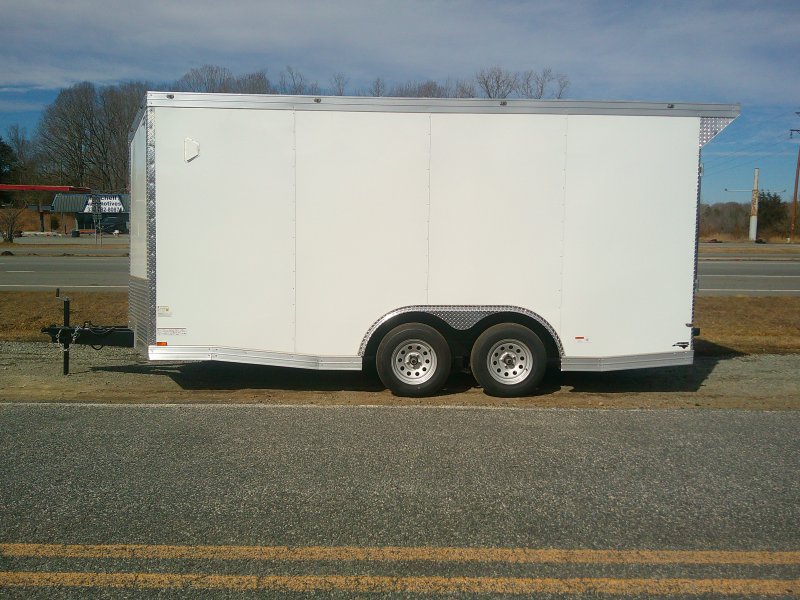 This v-nose 8.5x16 enclosed cargo trailer has a 7' interior height, tandem axles with brakes with a rating of 7,000 lb GVWR. This type of trailer is ideal for light-duty or residential tasks. This model has a side door, a rear ramp door, and a 2000 lb jack.