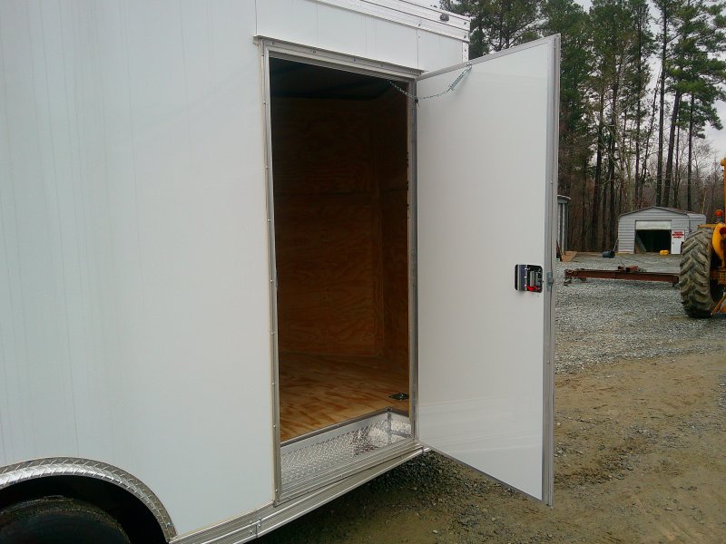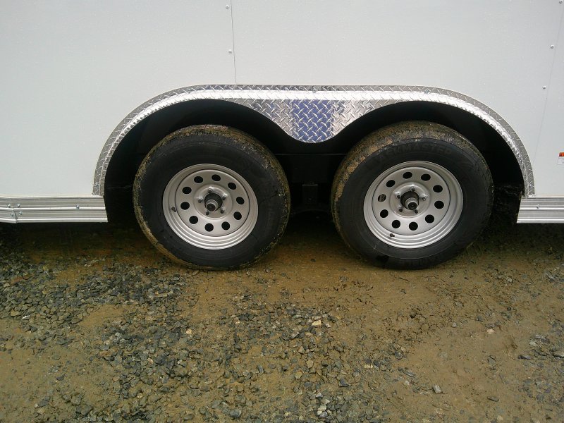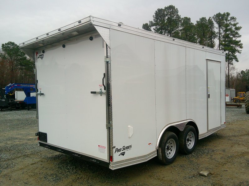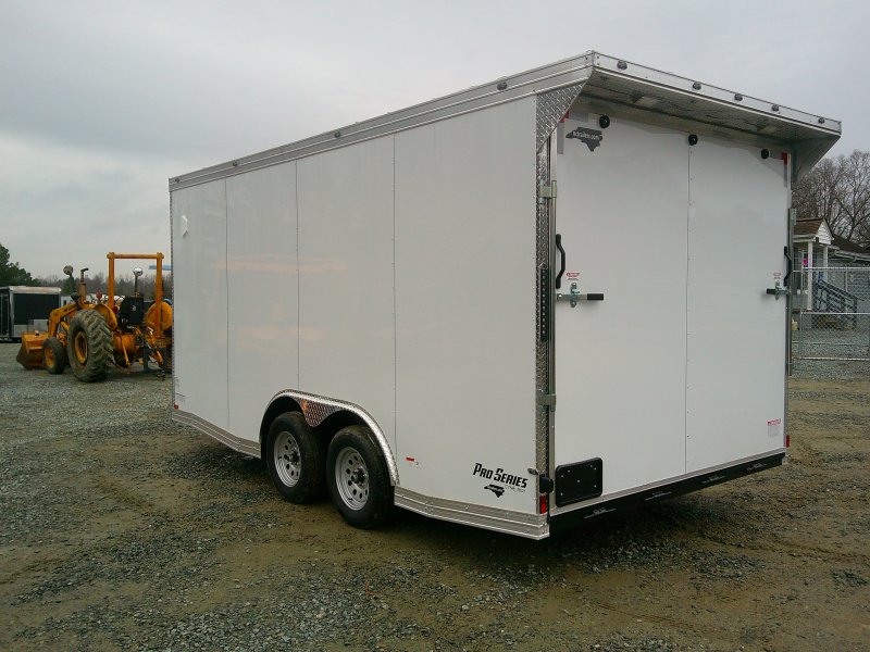 This v-nose 8.5x16 enclosed cargo trailer has a 7' interior height, tandem axles with brakes with a rating of 7,000 lb GVWR. This type of trailer is ideal for light-duty or residential tasks. This model has a side door, a rear ramp door, and a 2000 lb jack, .080 White exterior and 60" extended tongue.