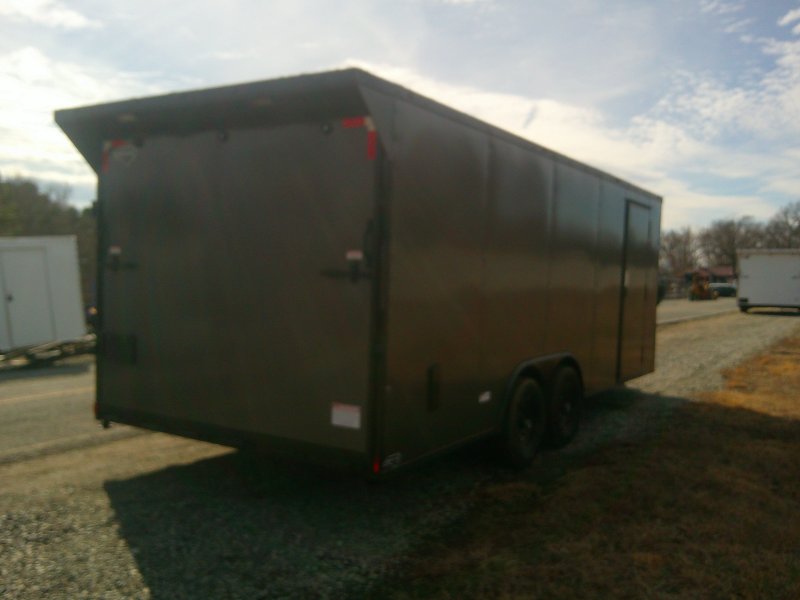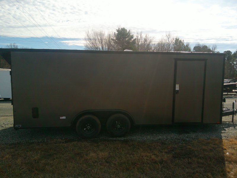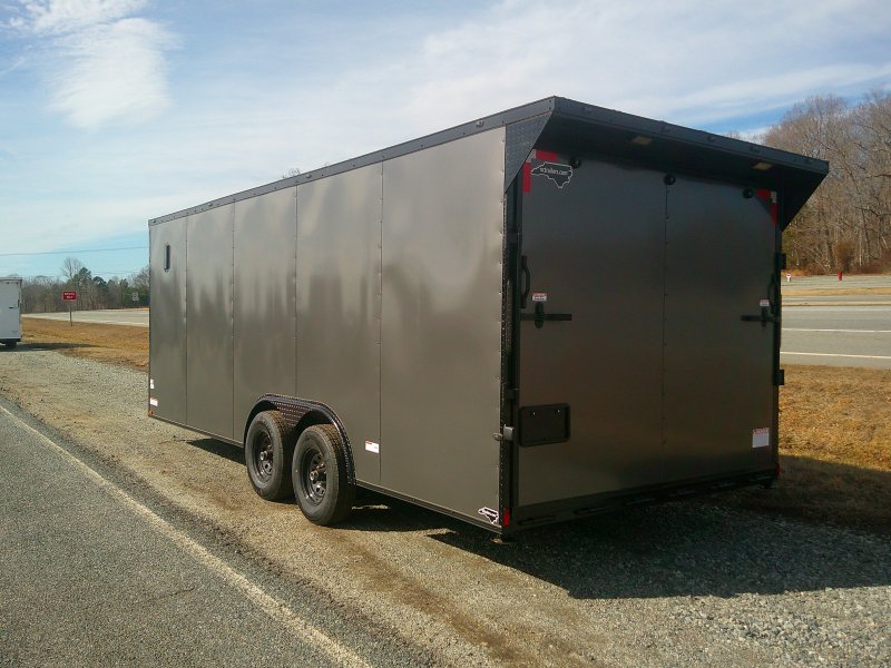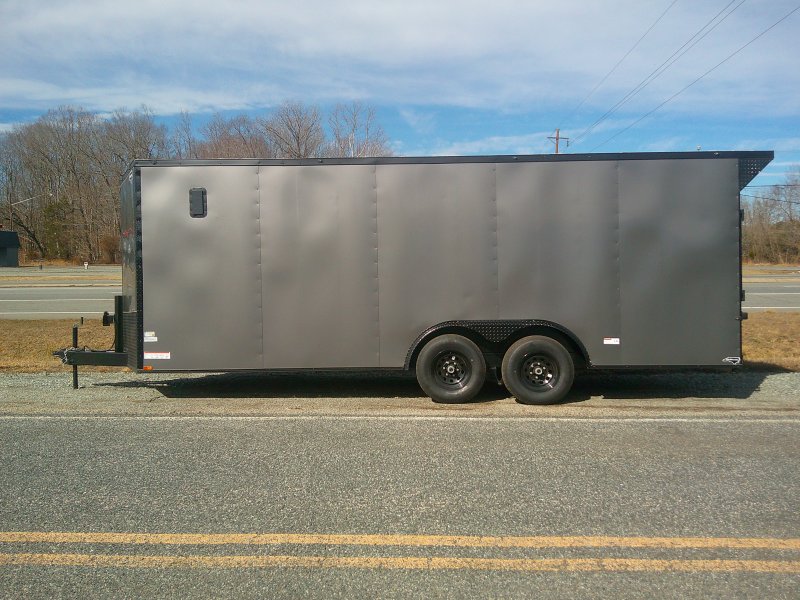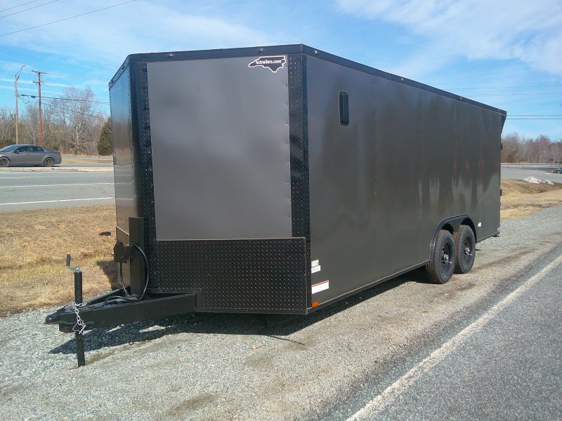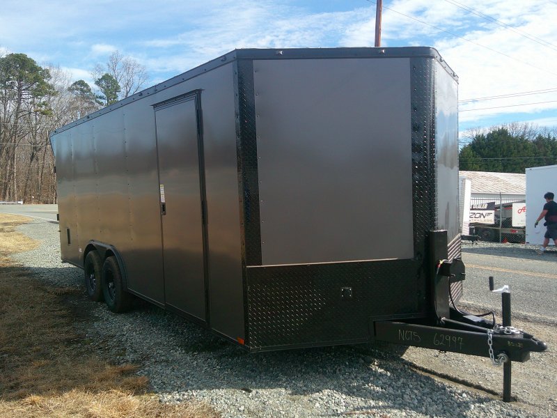 This v-nose 8.5x20 custom enclosed cargo trailer, tandem axles with brakes with a rating of 10,000 lb GVWR. This model has a side door, a rear ramp door, and a 2000 lb jack.