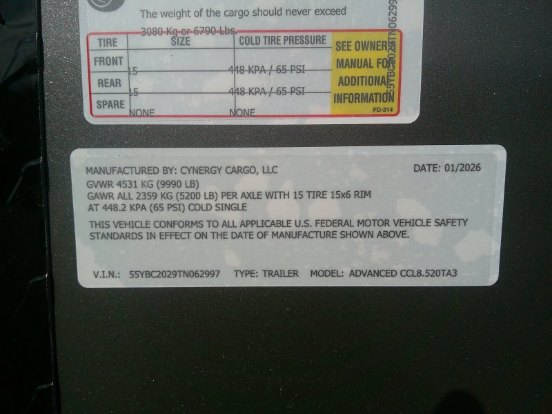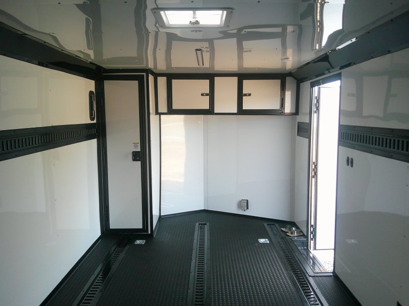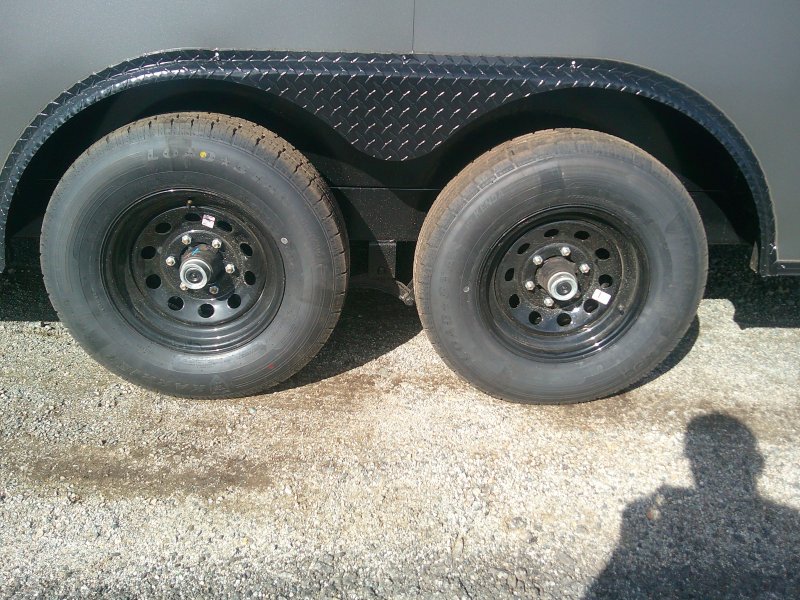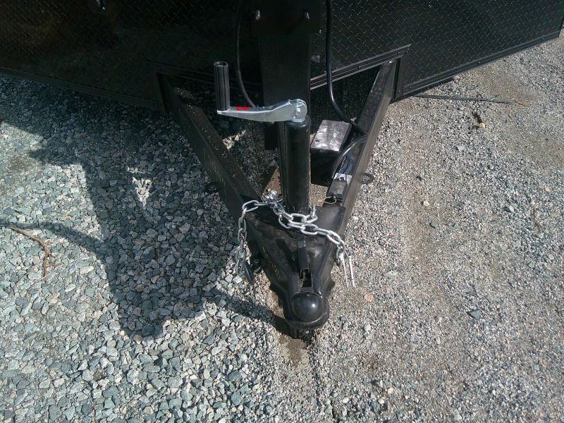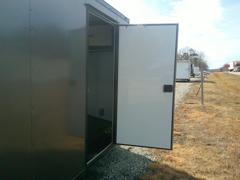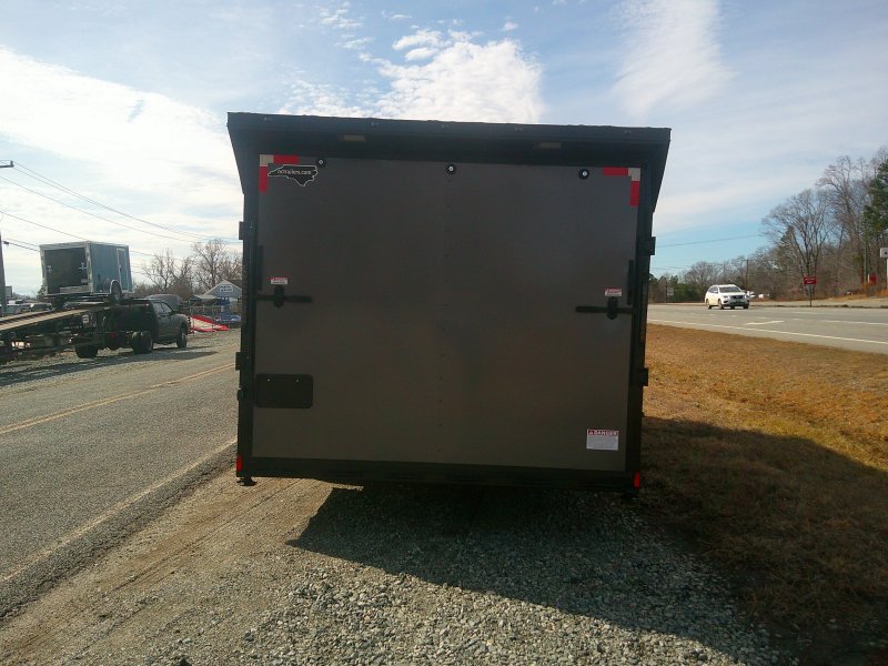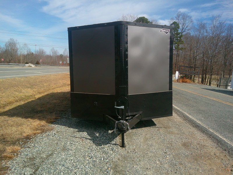 This v-nose 8.5x20 custom enclosed cargo trailer, tandem axles with brakes with a rating of 10,000 lb GVWR. This model has a side door, a rear ramp door, and a 2000 lb jack.