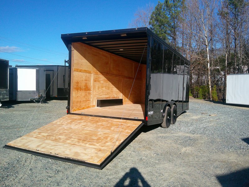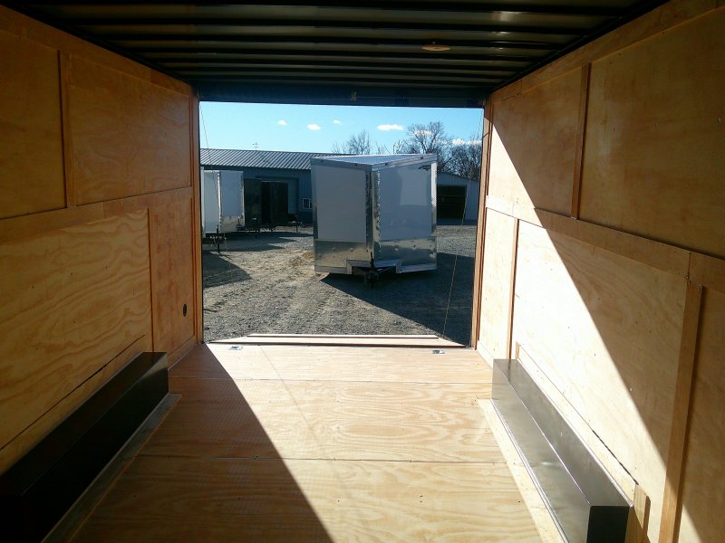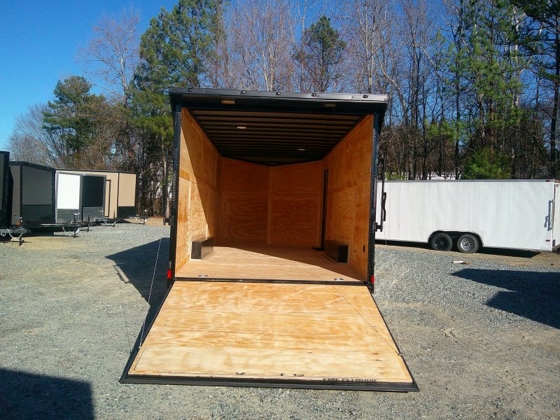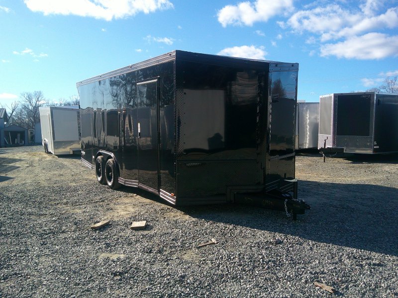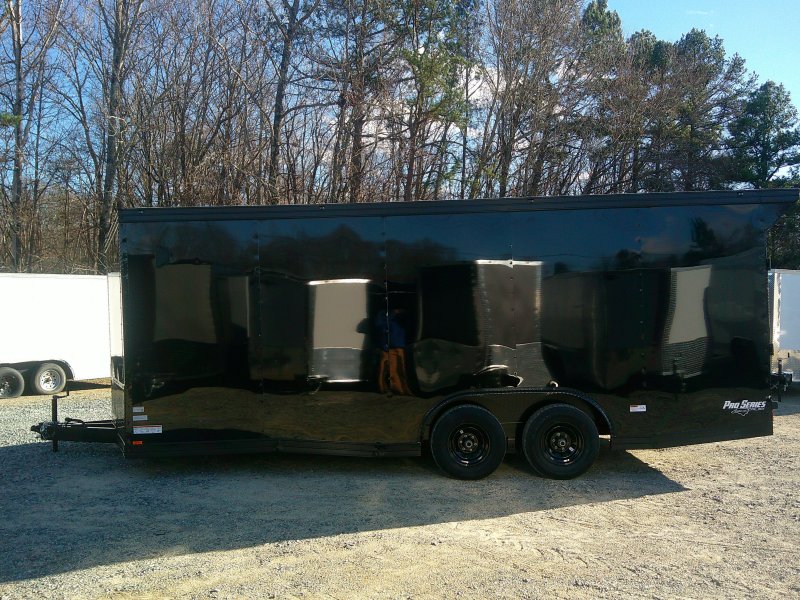 This v-nose 8.5x20 enclosed cargo trailer has a 7' interior height, tandem axles with brakes with a rating of 10,000 lb GVWR. This Pro Series model has a side door, a rear ramp door, 0.080"" polycore sides, a slant v-nose, rear wing, and a 2000 lb jack.