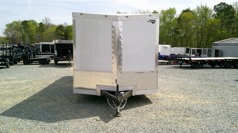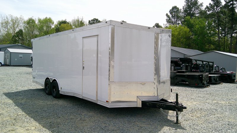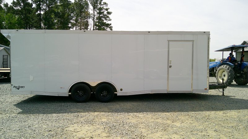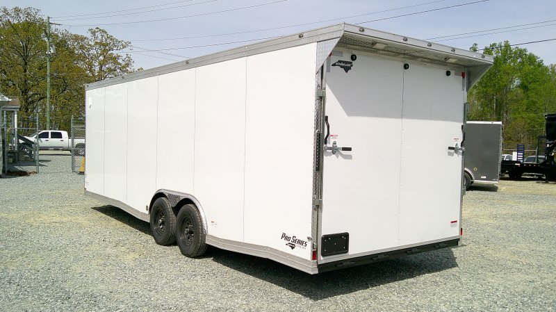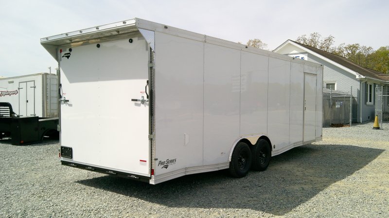 This v-nose 8.5x24 enclosed cargo trailer has a tandem axles with brakes with a rating of 10,000 lb GVWR. This Pro Series model has a side door, a rear ramp door, 0.080"" polycore sides, a slant v-nose, rear wing, and a 2000 lb jack.