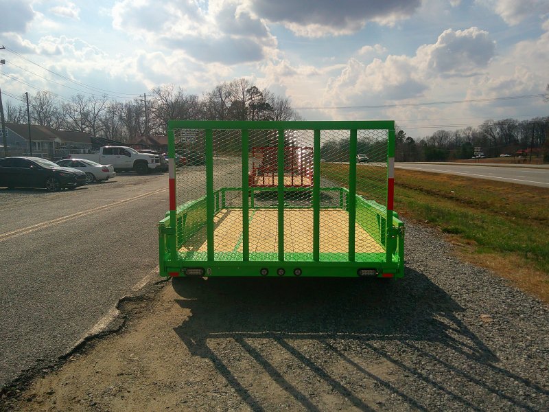 Along with steel diamond plate fenders, this trailer has clear LED running lights on the sides and in the rear bumper as well. A spring-assisted 4’ tall steel mesh gate in the rear makes loading your stuff super simple and easy. The gate can fold in and lay inside the bed for less wind drag when hauling the trailer empty.