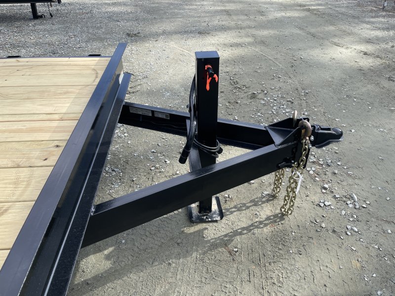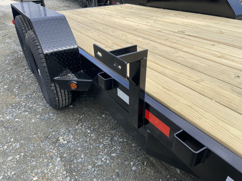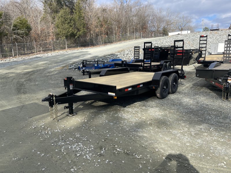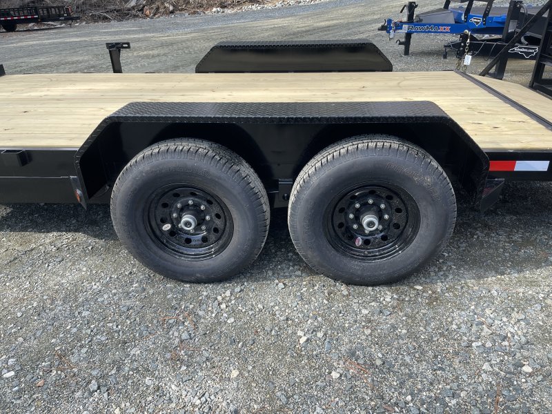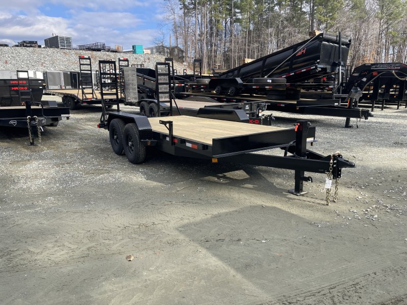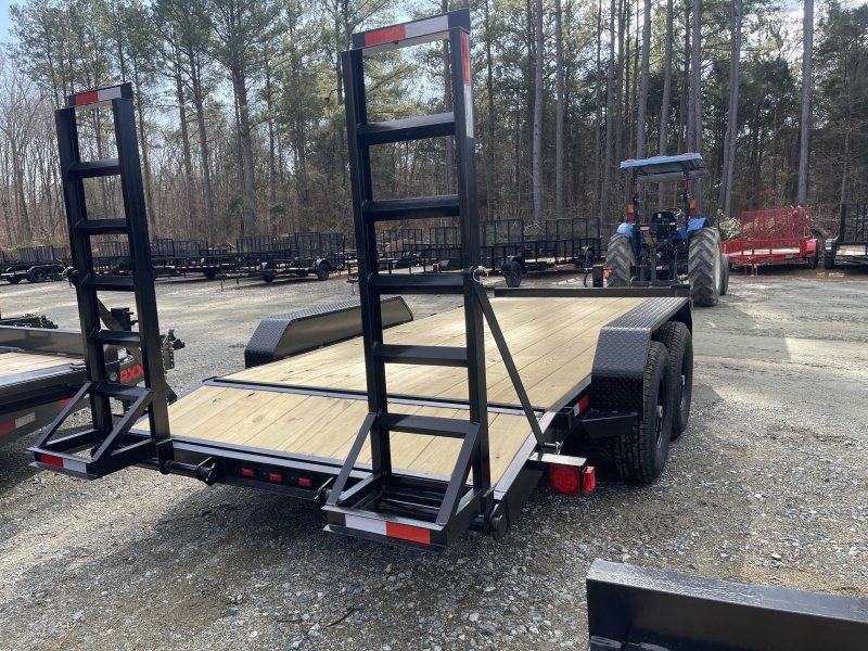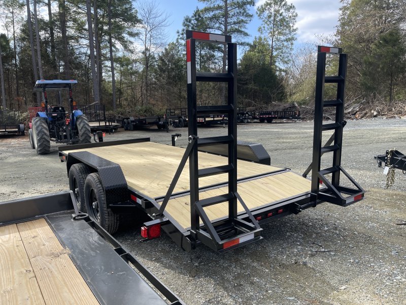 This standard equipment trailer comes with two 7,000lb axles, 82" wide x 16' long deck (with dovetail), and two fold-down ladder ramps.