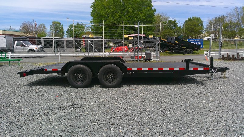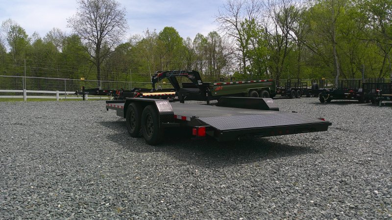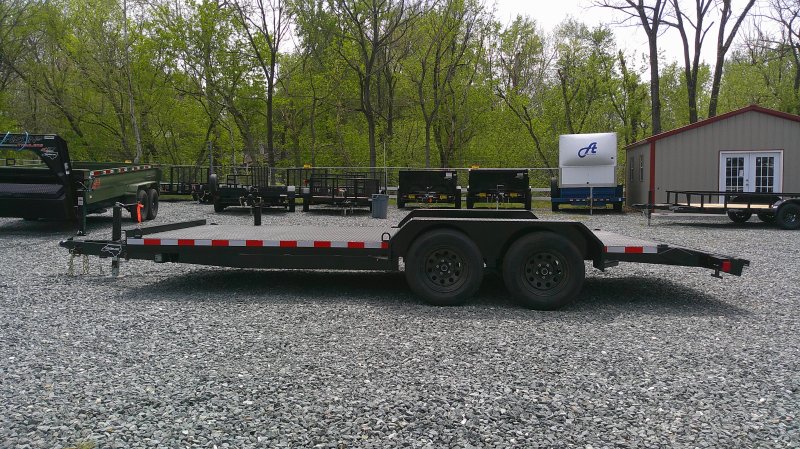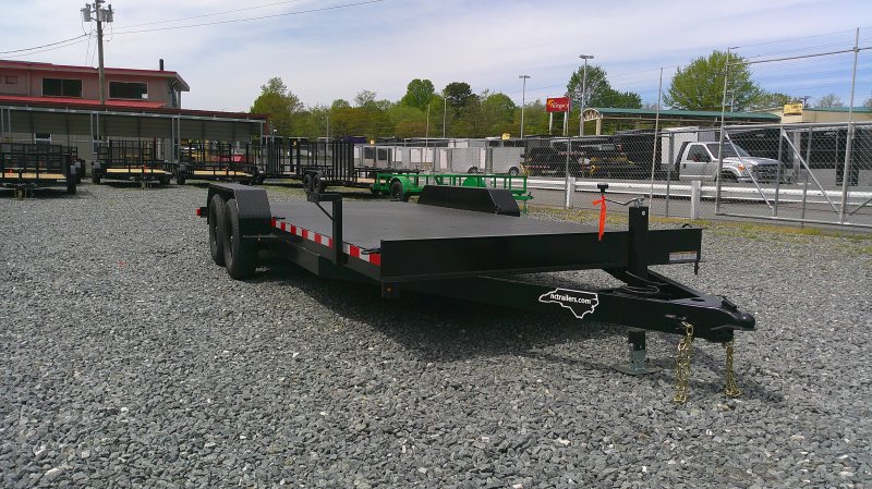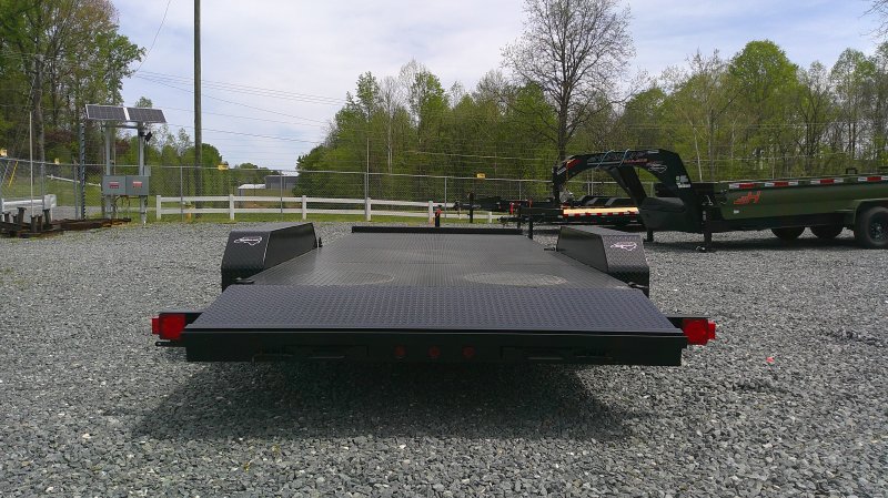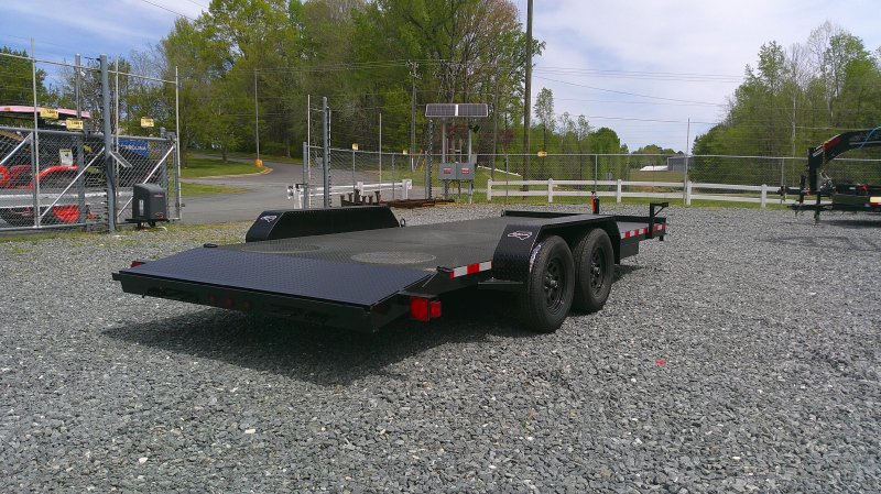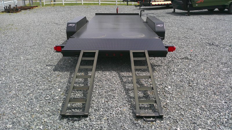 "This deluxe 7,000 lb diamond plate steel floor single-car hauler measures 84-inch span between fenders with a 18-foot length. Standard features include a fixed 2 5/16″ A-frame coupler, four-wheel brakes, 205/75 R15 tires, 6 D-rings, a 4' dovetail with rear slide-in loading ramps.