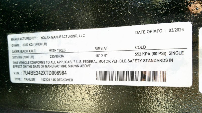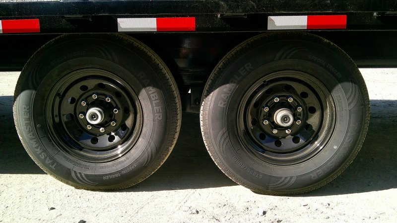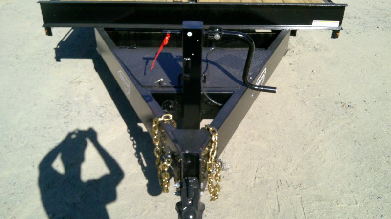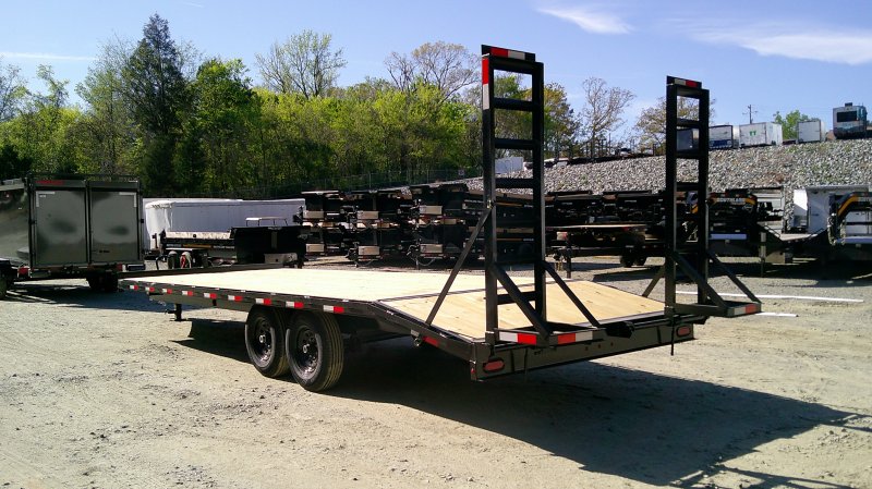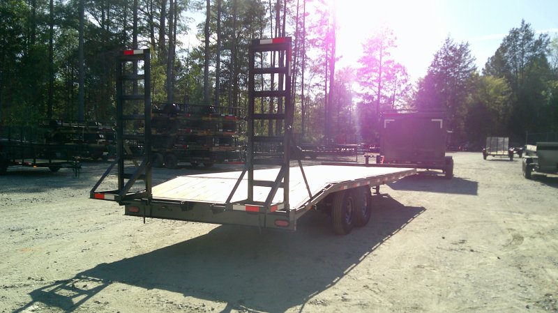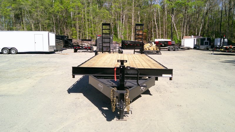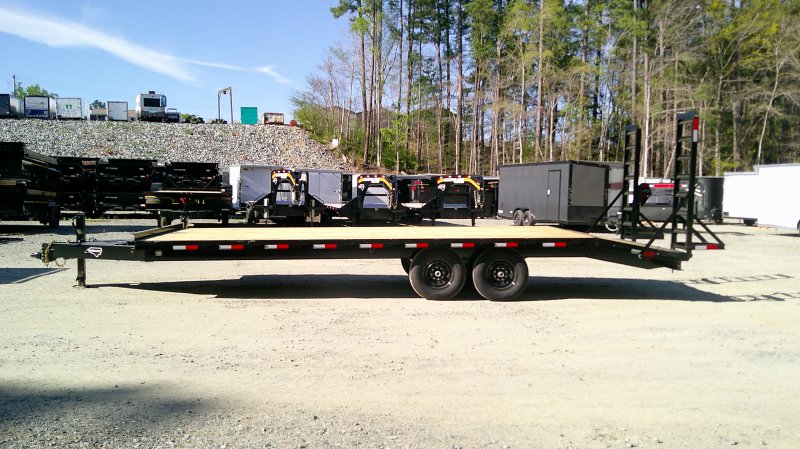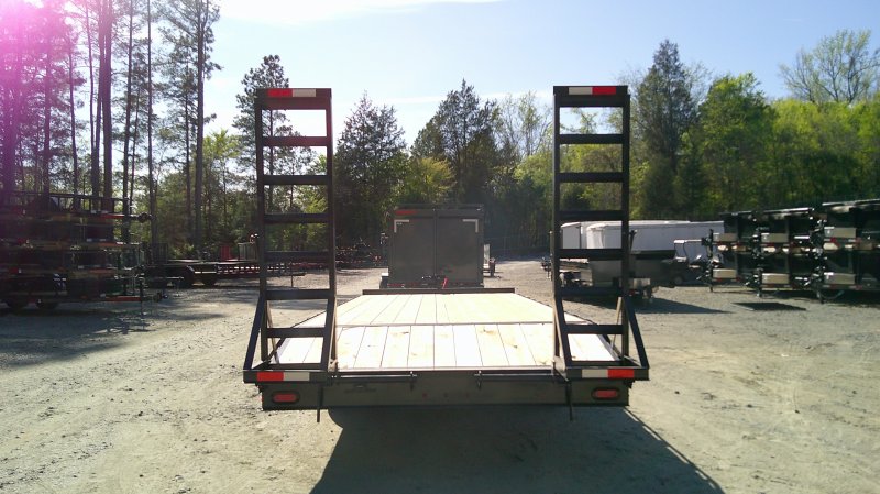 This standard deckover equipment trailer comes with two 7,000lb axles, 8.5' wide x 24' long deck (with dovetail), and two fold-down ladder ramps.