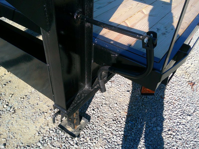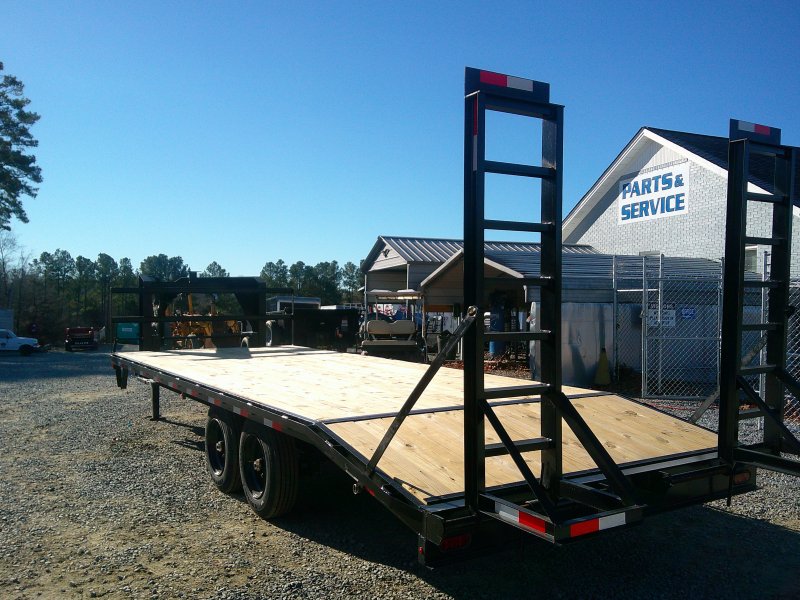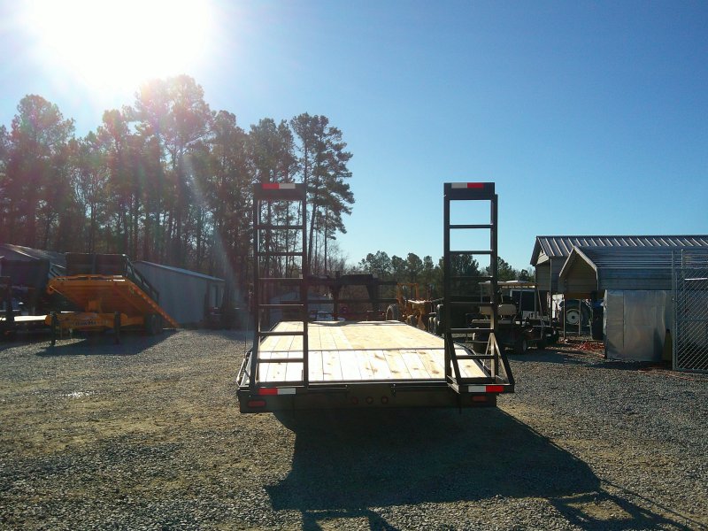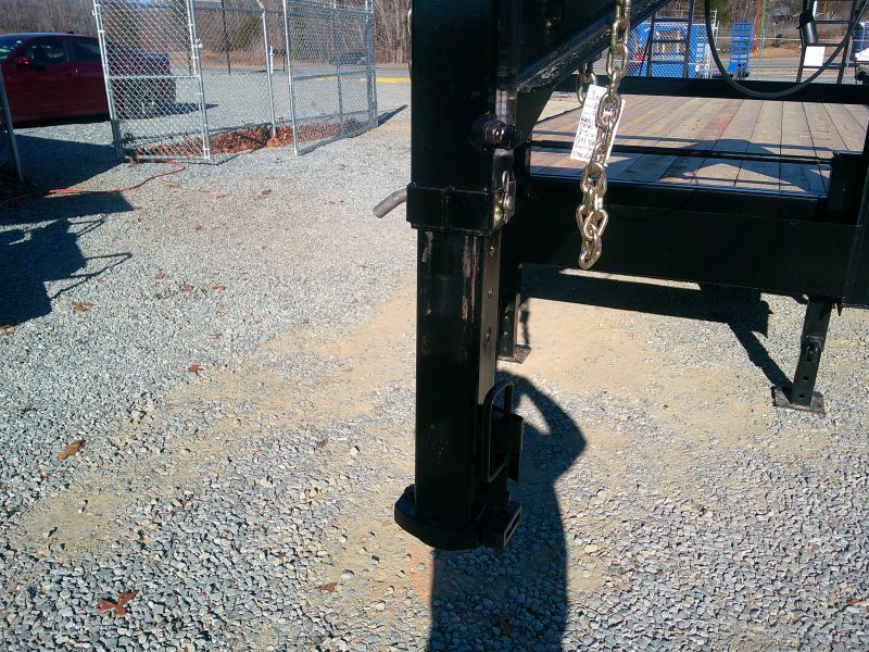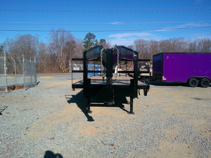This standard Gooseneck deckover equipment trailer comes with two 7,000lb axles, 8.5' wide x 24' long deck (with dovetail), and two fold-down ladder ramps.