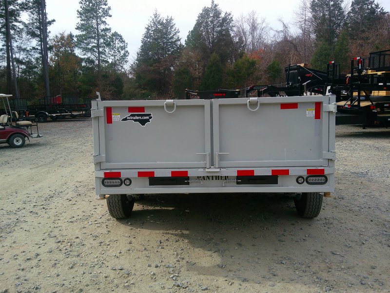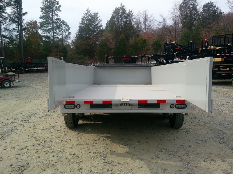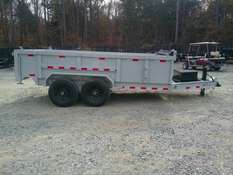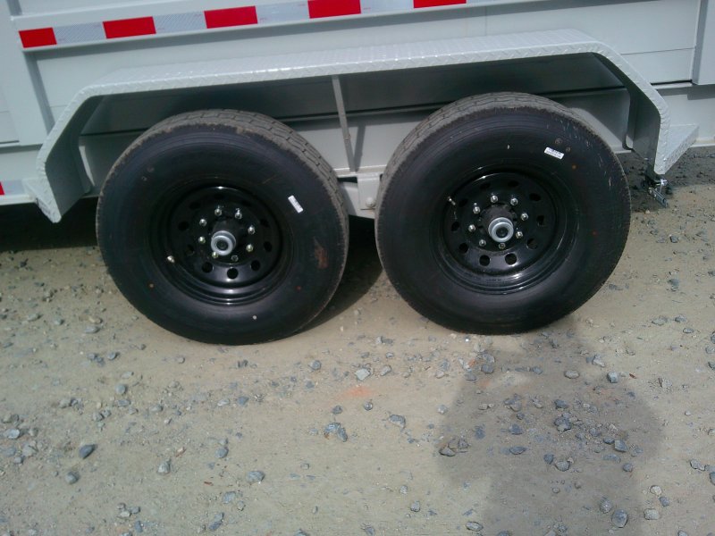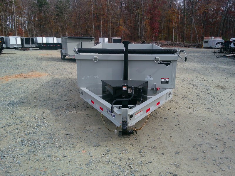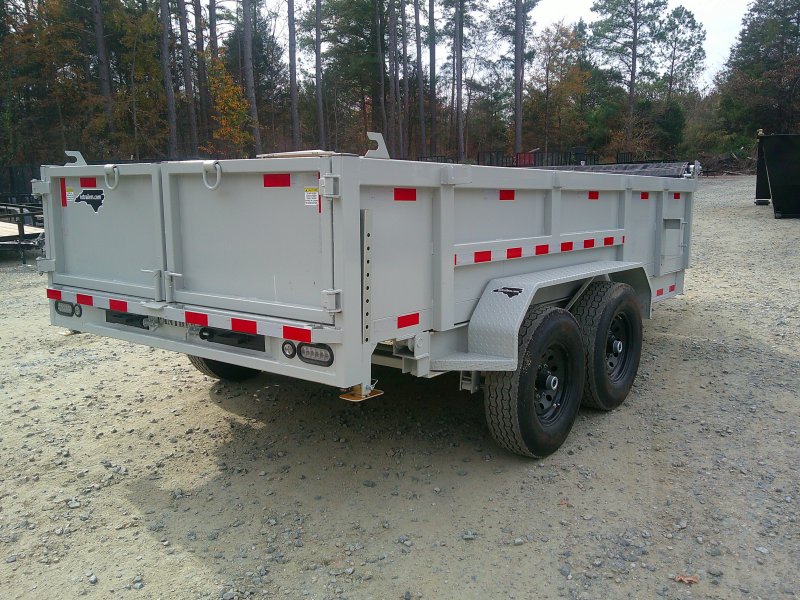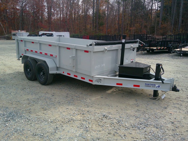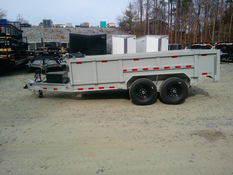 This deluxe 80"x14' dump trailer has low profile 24" sides with ramps. Features double eye spring suspension, pump with deep cycle battery inside lockable security box, and a wired hand remote.
