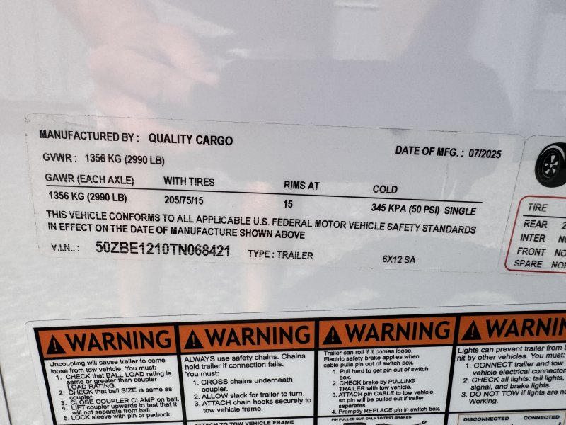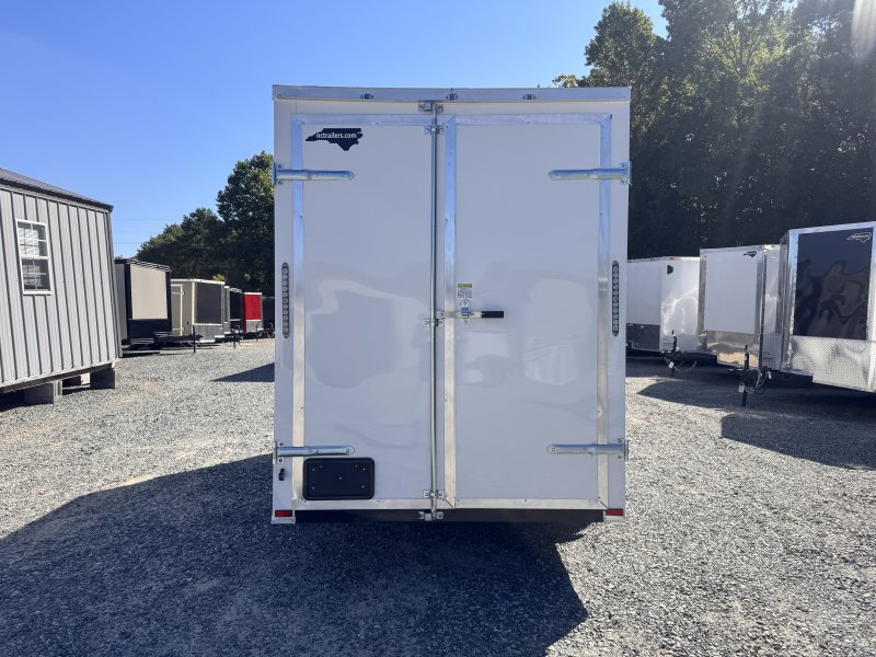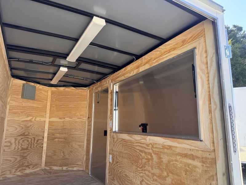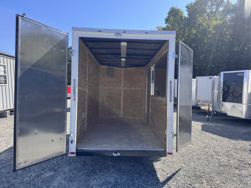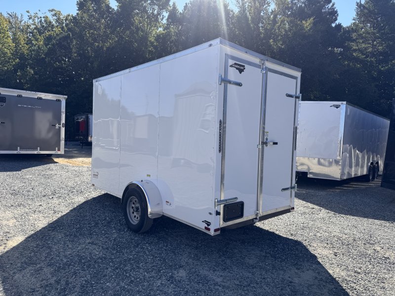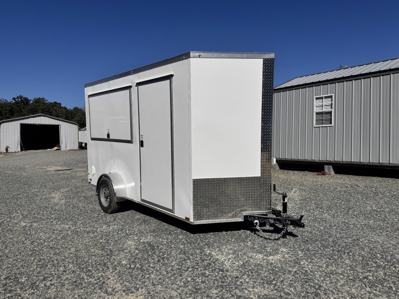 This v-nose 6x12 enclosed concession trailer has a single non-braking idler axle with a rating of 2,990 lb GVWR. This deluxe model has a side door, rear barn doors, 0.030"" thick metal sides, a 3x6 concession window, 50 amp electrical package, 50 amp motor base plug, MC cable, wired and braced for HVAC, and a 2000 lb jack.