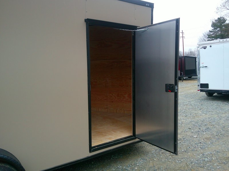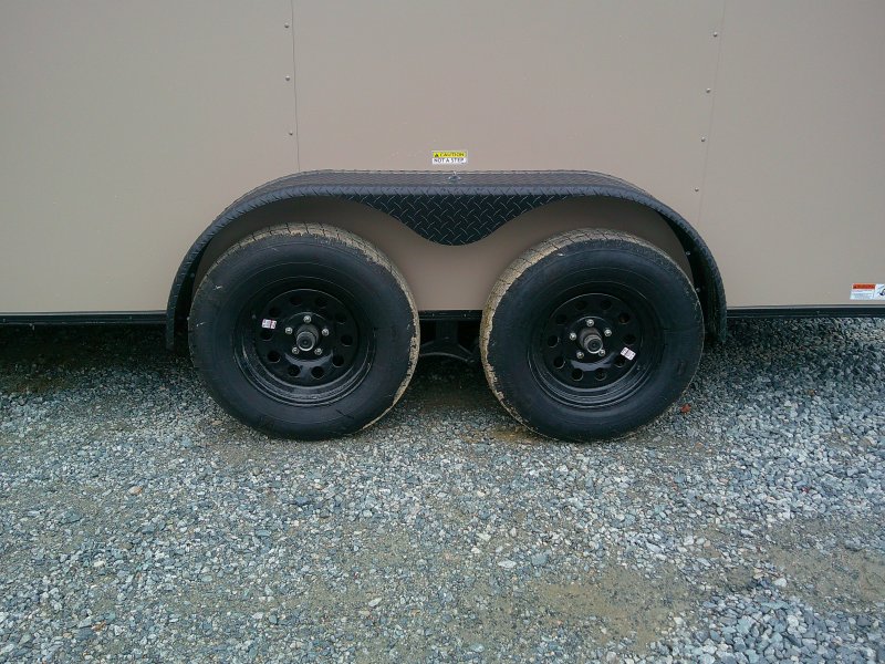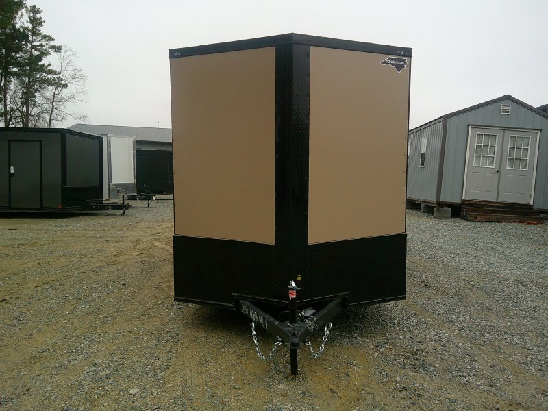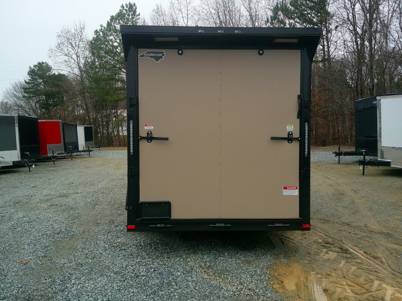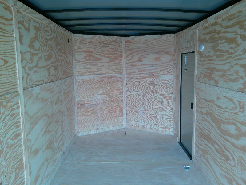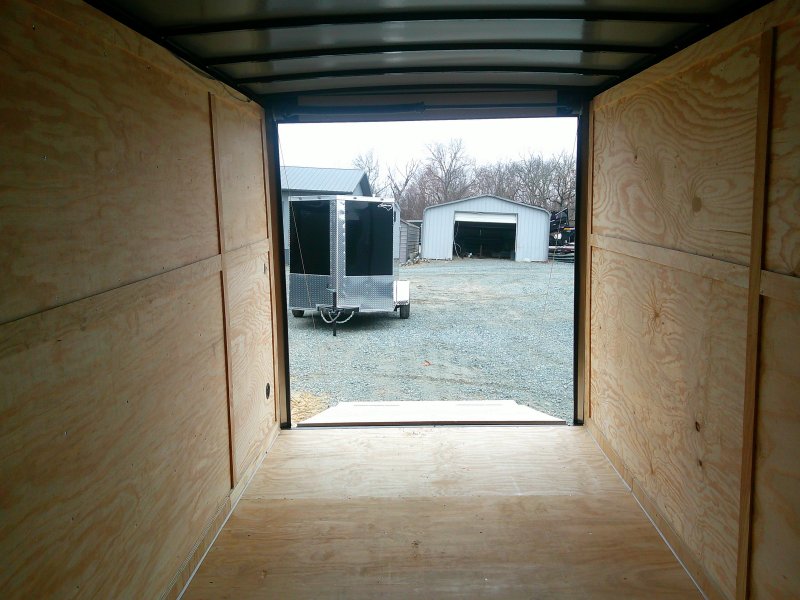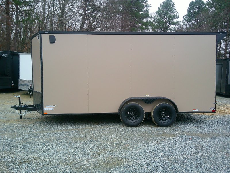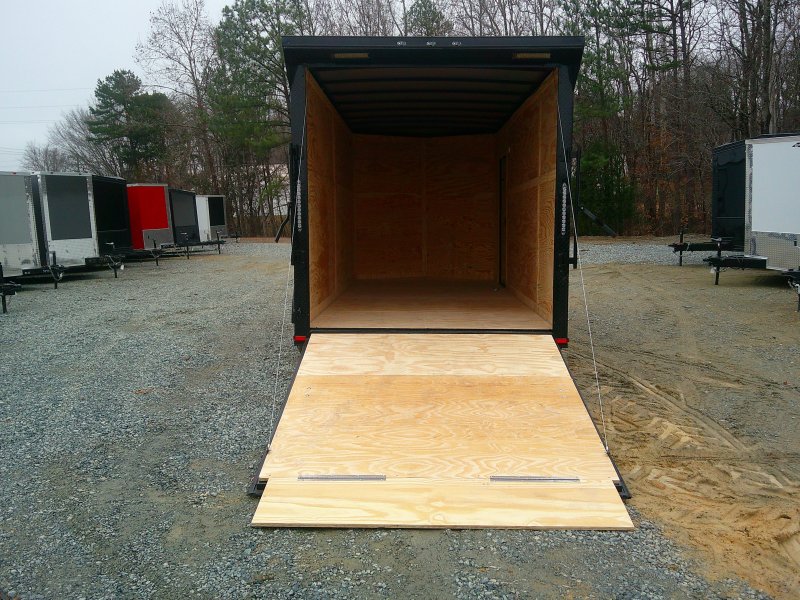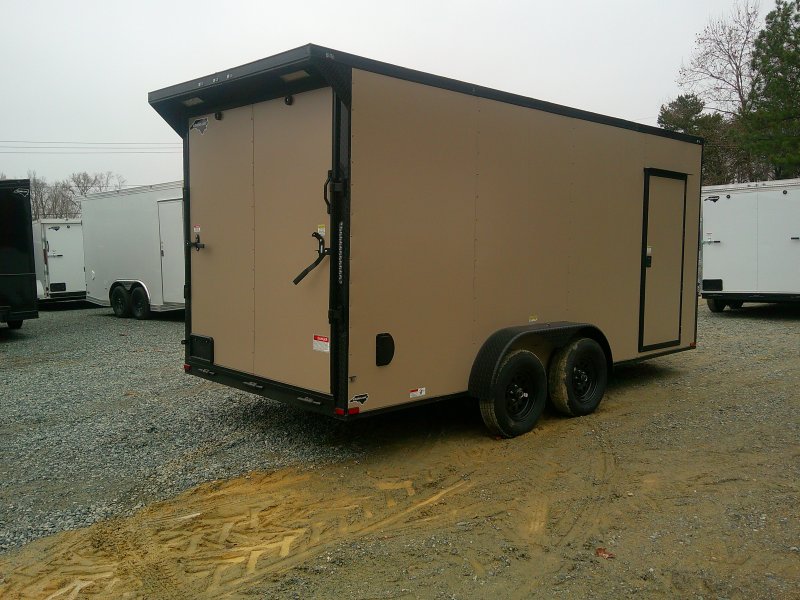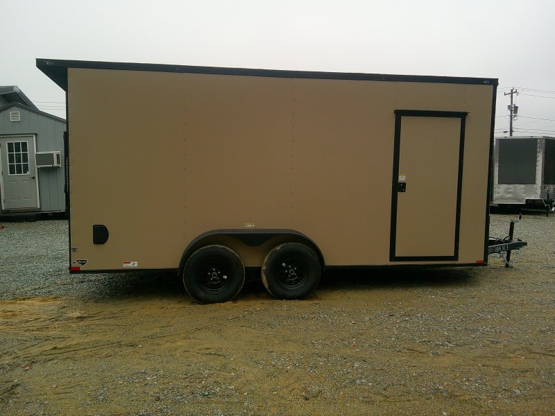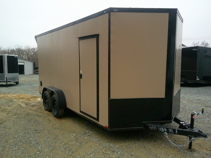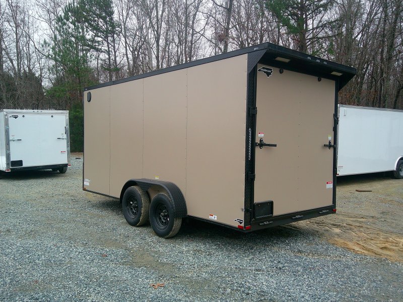This v-nose 7x16 enclosed cargo trailer has a 7' interior height, tandem axles with brakes with a rating of 7,000 lb GVWR. This deluxe model has a side door, a rear ramp door, 0.030" thick metal sides, rear wing w/lights, a black out package and a 2000 lb jack.