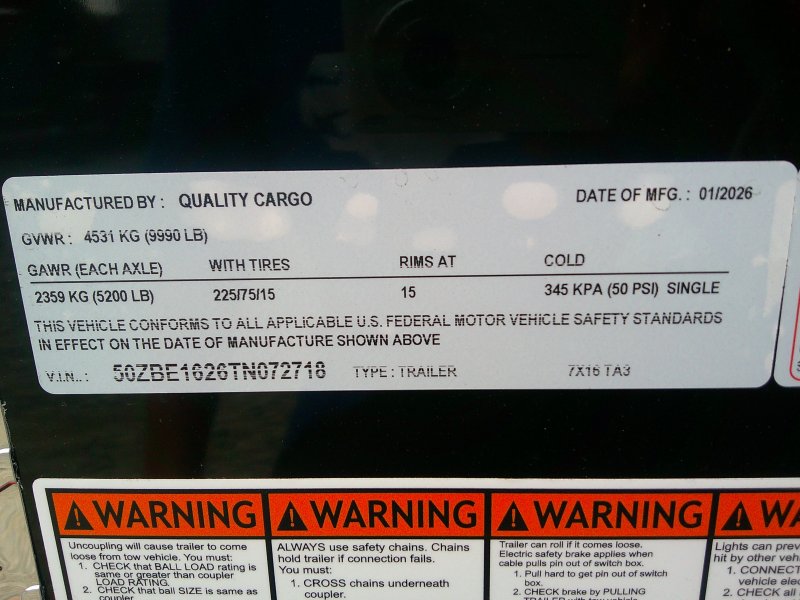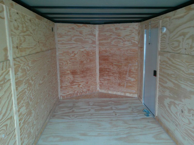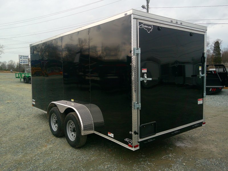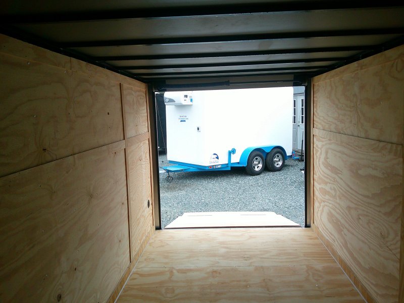 "This v-nose 7x16 enclosed cargo trailer has a 6'3" interior height, tandem axles with brakes with a rating of 10,000 lb GVWR. This commercial model has a side door, a rear ramp door, and a 2000 lb jack.