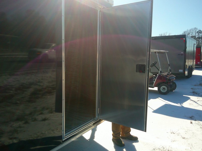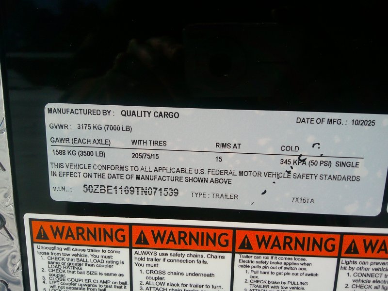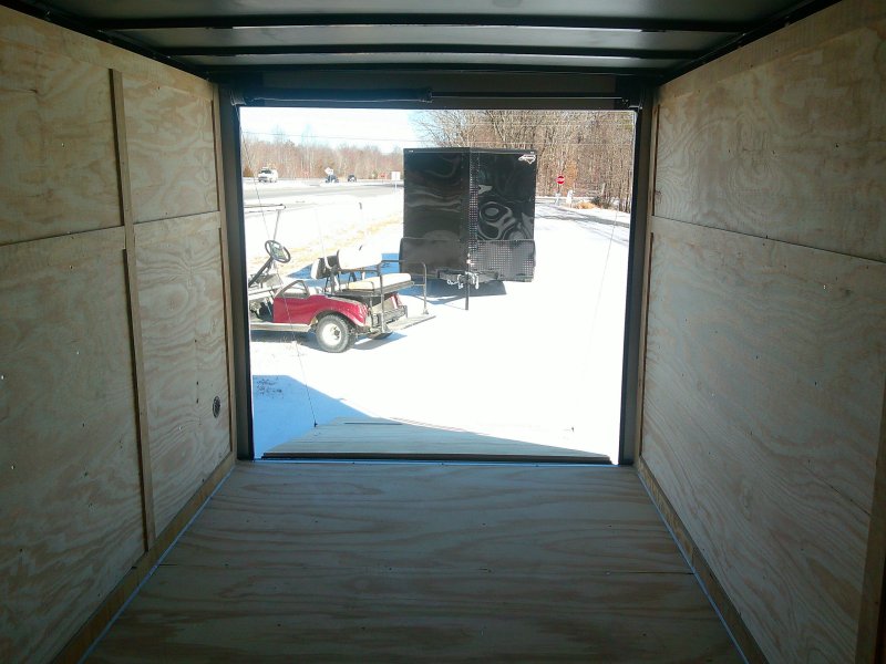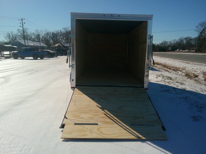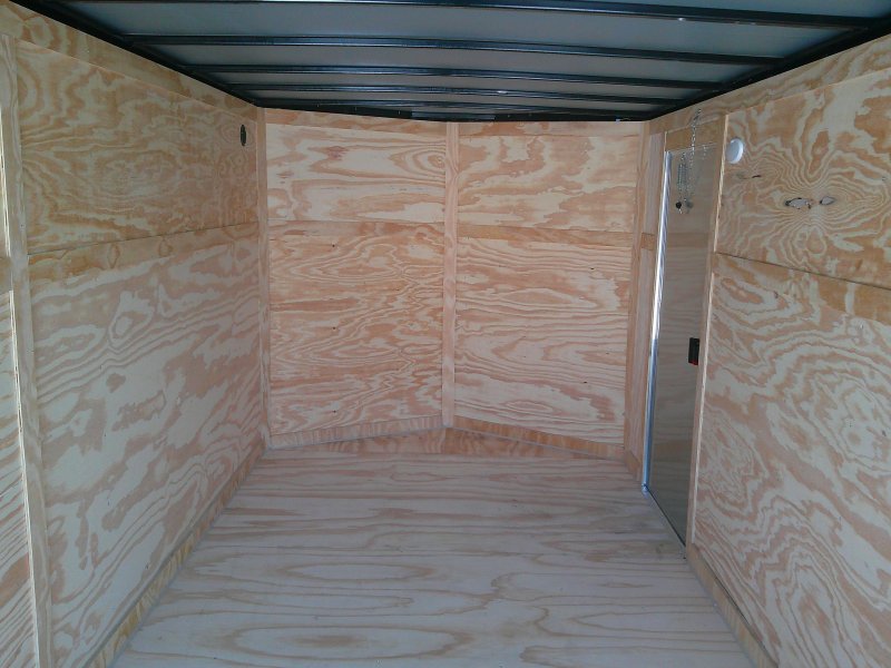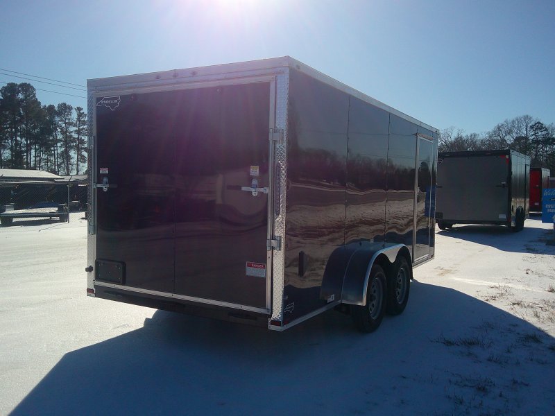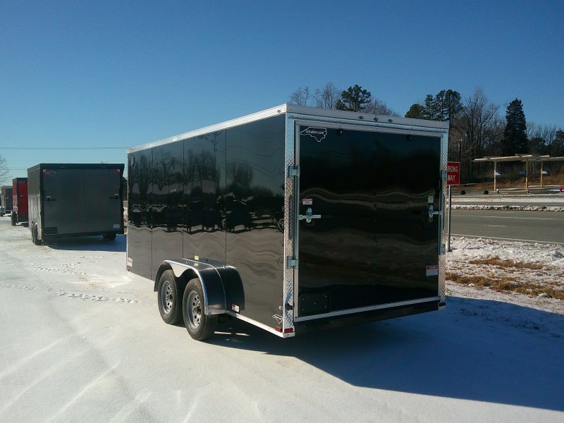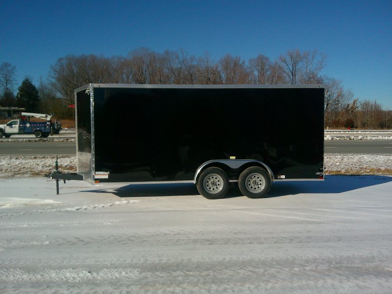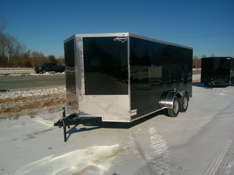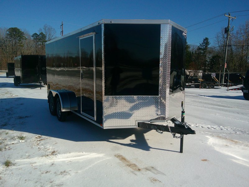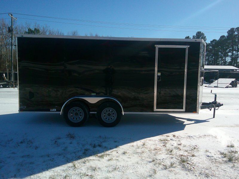 This v-nose 7x16 enclosed cargo trailer has a 6'3"' interior height, tandem axles with brakes with a rating of 7,000 lb GVWR. This type of trailer is ideal for light-duty or residential tasks. This model has a side door, a rear ramp door, and a 2000 lb jack.