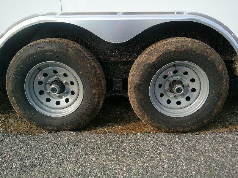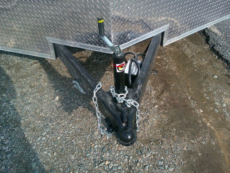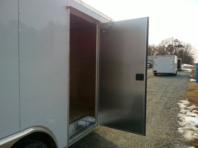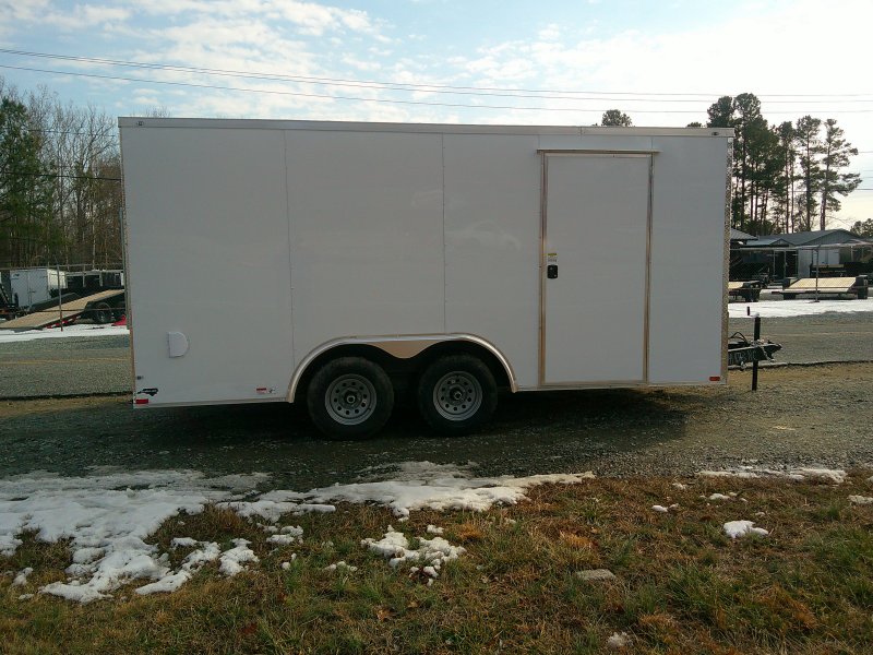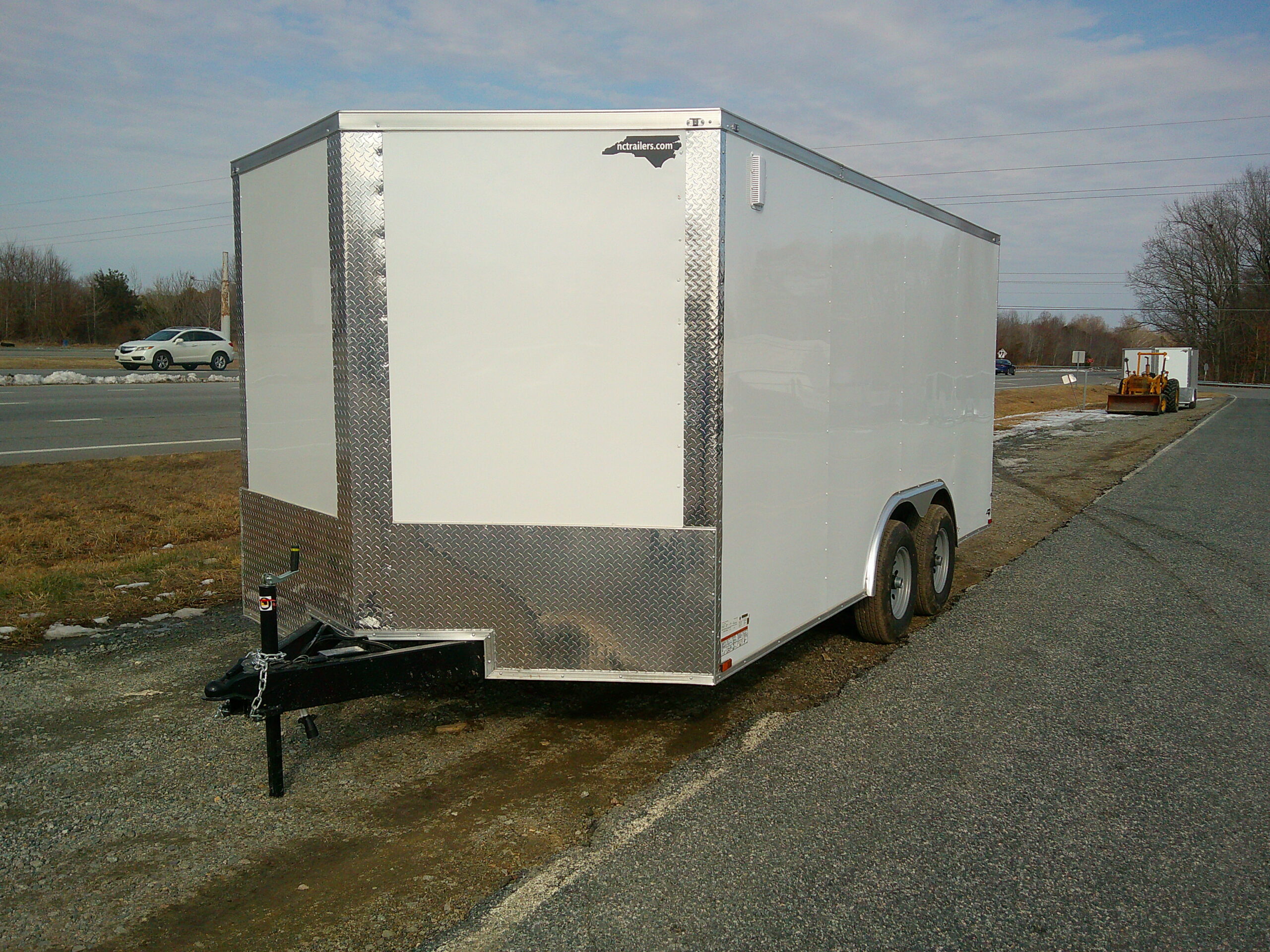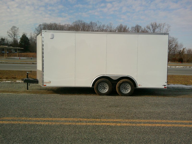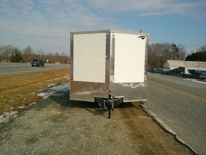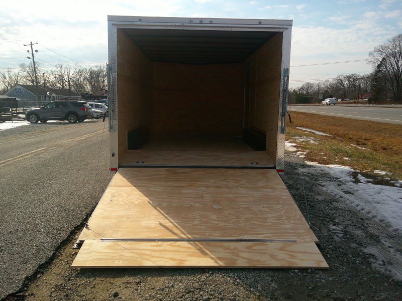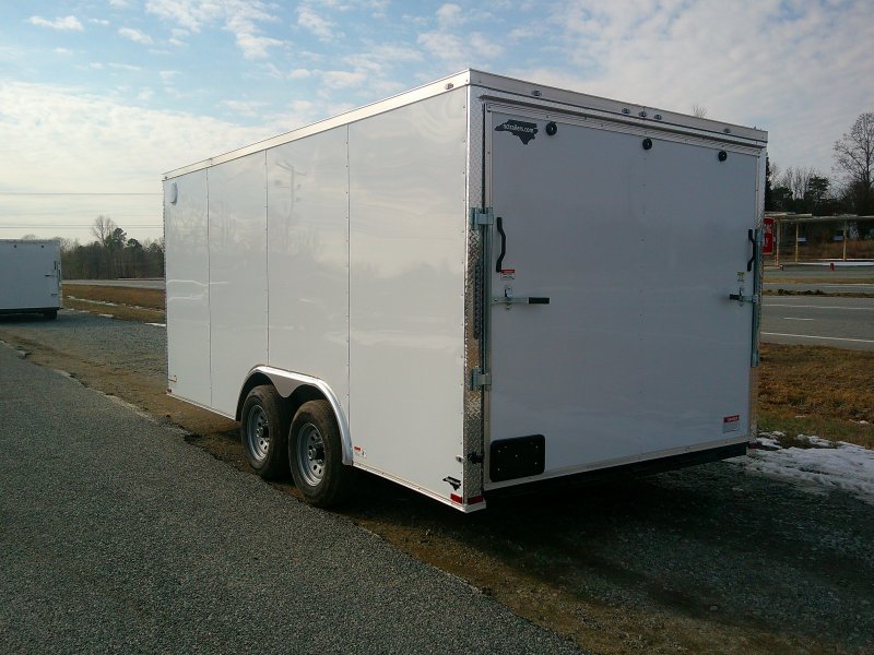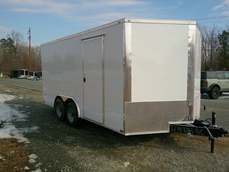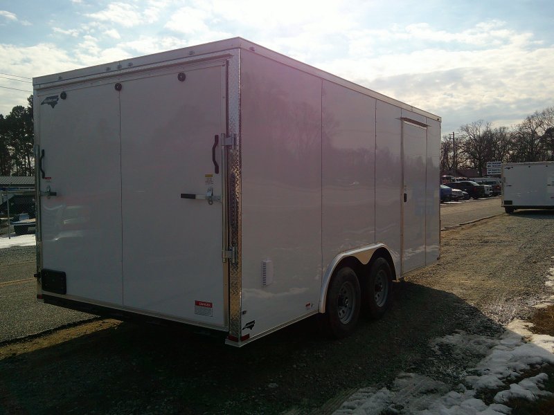 This v-nose 8.5x16 enclosed cargo trailer has a 6'3" interior height, tandem axles with brakes with a rating of 10,000 lb GVWR. This type of trailer is ideal for light-duty or residential tasks. This model has a side door, a rear ramp door, and a 2000 lb jack.