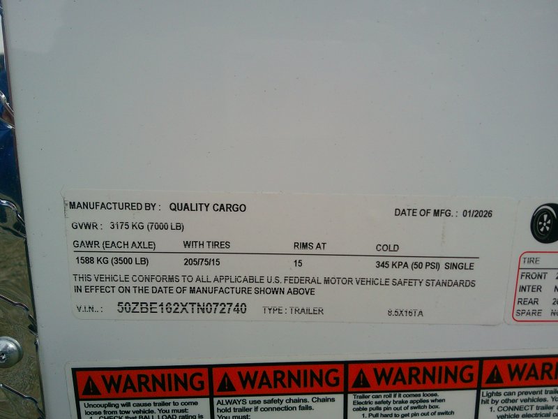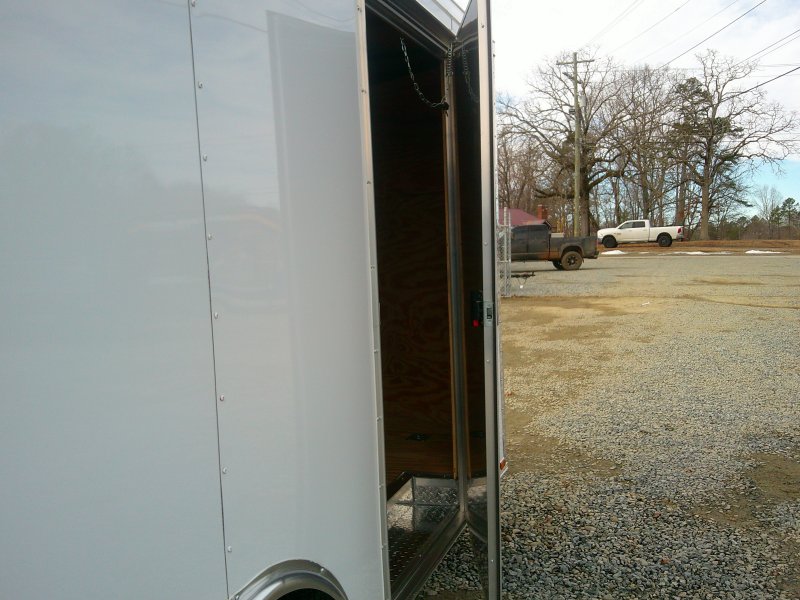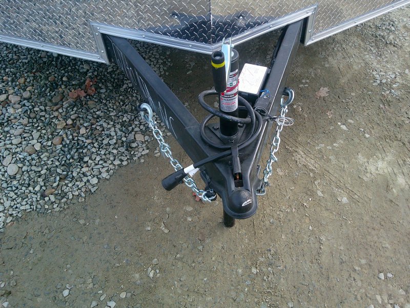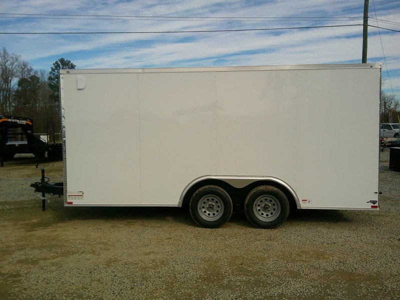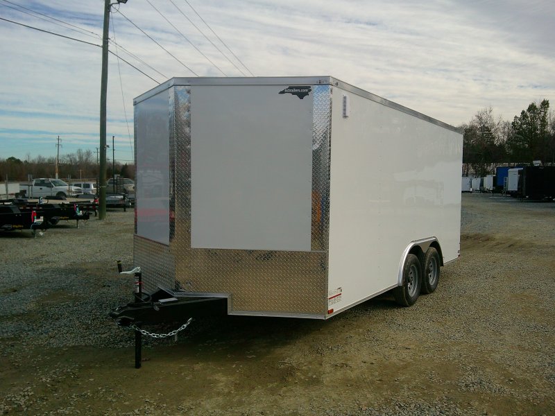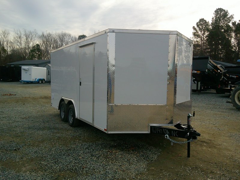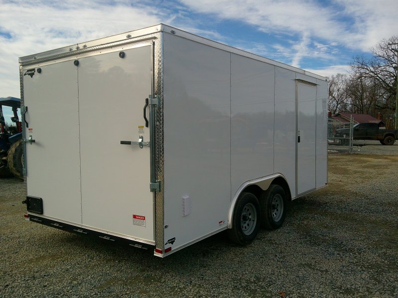 This v-nose 8.5x16 enclosed cargo trailer has a 6'6" interior height, tandem axles with brakes with a rating of 7,000 lb GVWR. This type of trailer is ideal for light-duty or residential tasks. This model has a side door, a rear ramp door, and a 2000 lb jack.