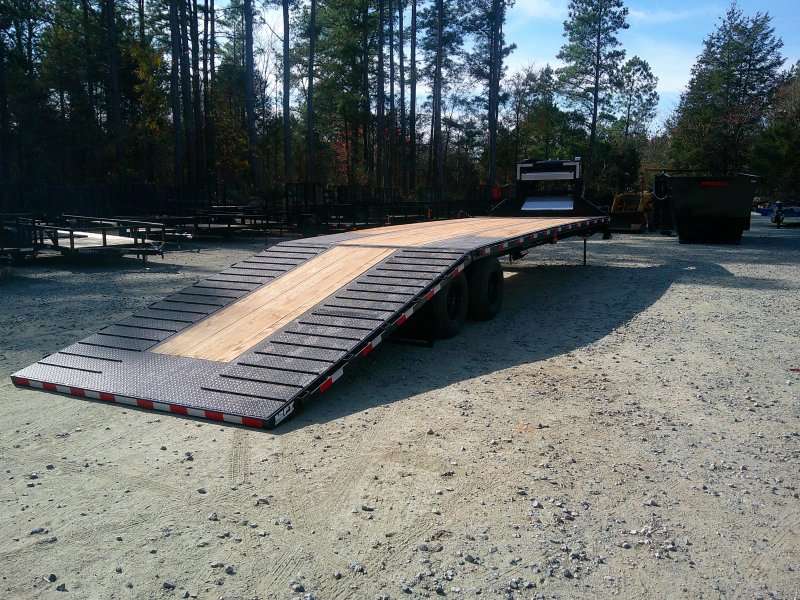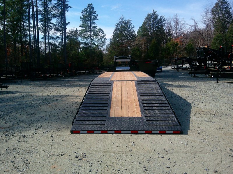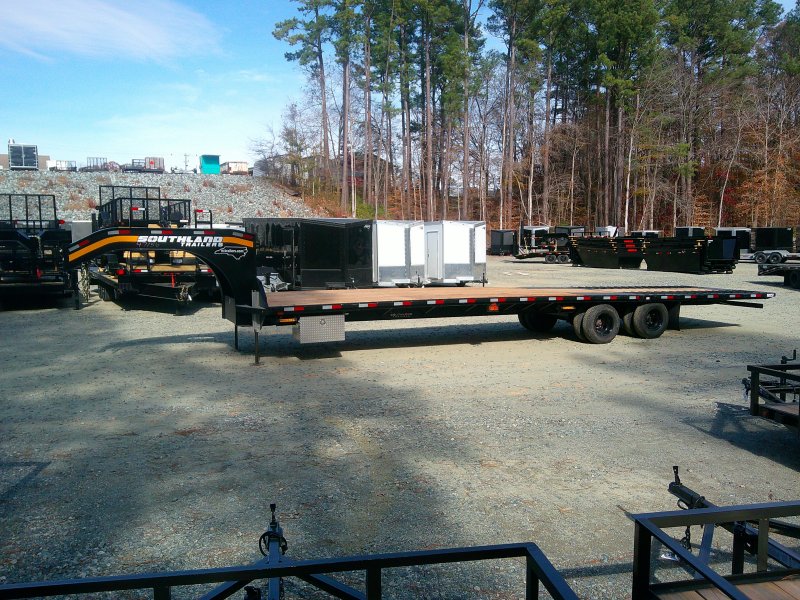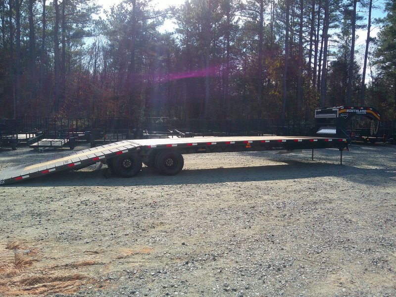 The Southland ETGT Engineered Gooseneck Deckover Trailer is a top of the line engineered Gooseneck AND engineered frame. This unit has dual tandem 12K axles, with 25K GVWR. Main beam is engineered and robotically welded (high tensile steel). Engineered one piece continuous weld 90ksi gooseneck. Low profile bed with 90ksi Engineered Pierced-Beams and S3.0” x 2.9 lb. High Tensile 80ksi Super Lite I-Beams. Hydraulically Powered Beavertail. Lockable toolbox, winch plate, locking chain rail, rub rails with chain spools and stake pockets. 14K bolt-on hydraulic jack.