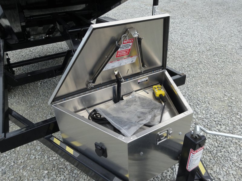 "This standard dump trailer has low profile 24"" sides. This unit has a double eye spring suspension, pump with deep cycle battery inside lockable security box, and a 20' wired hand remote.