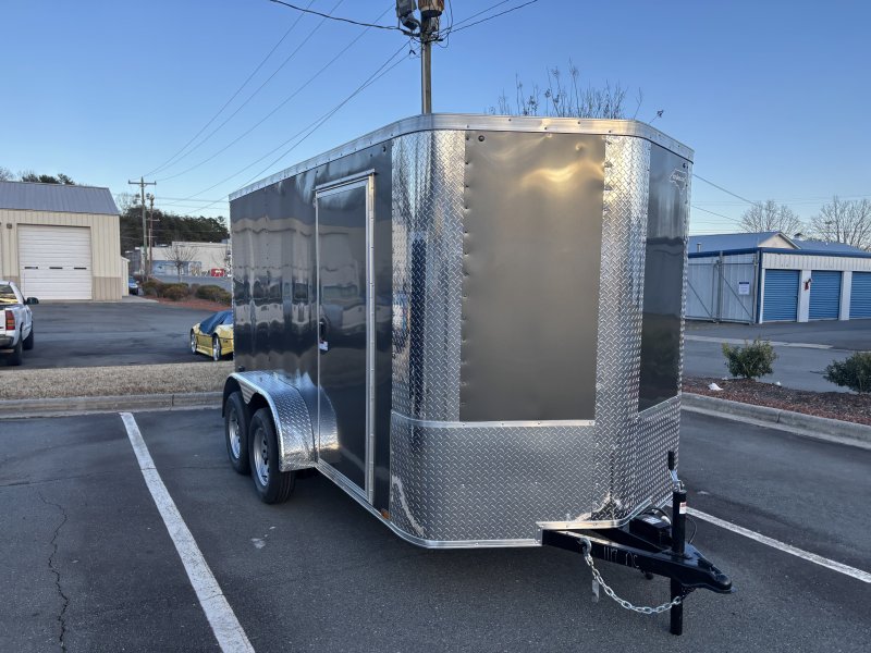 This v-nose 6x12 enclosed cargo trailer has 6'3"" interior height, a tandem braking axle with a rating of 7,000 lb GVWR. This type of trailer is ideal for light-duty or residential tasks. This model has a side door, a rear ramp door, and a 2000 lb jack.