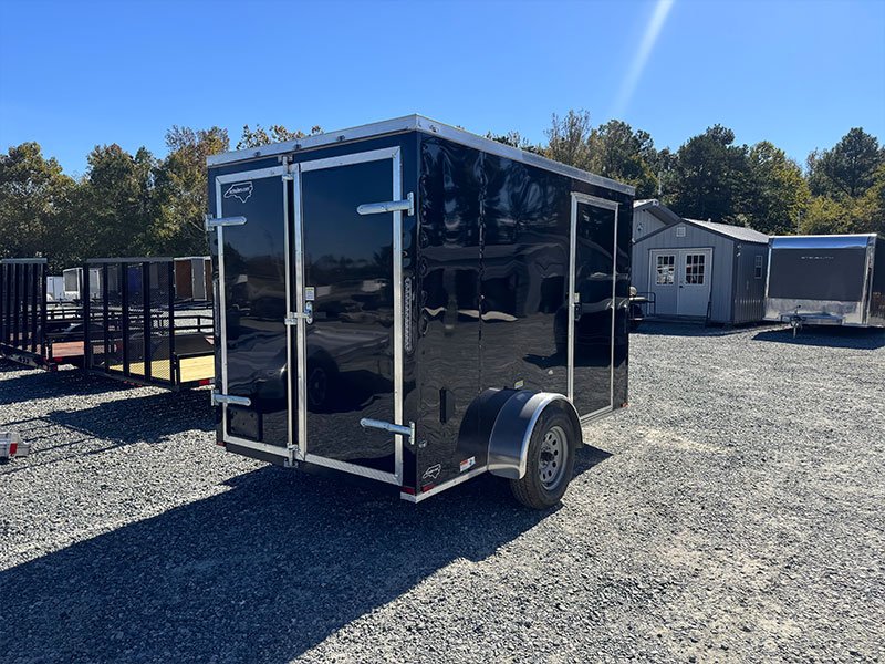 This v-nose 6x10 enclosed cargo trailer has a single non-braking idler axle with a rating of 2,990 lb GVWR. This type of trailer is ideal for light-duty or residential tasks. This model has a side door, rear barn doors, and a 2000 lb jack.